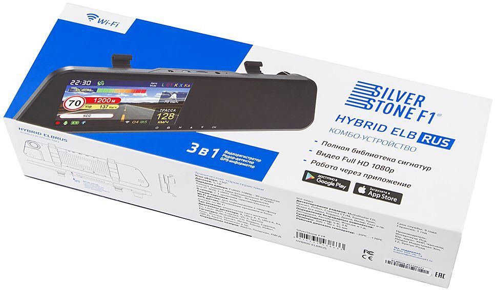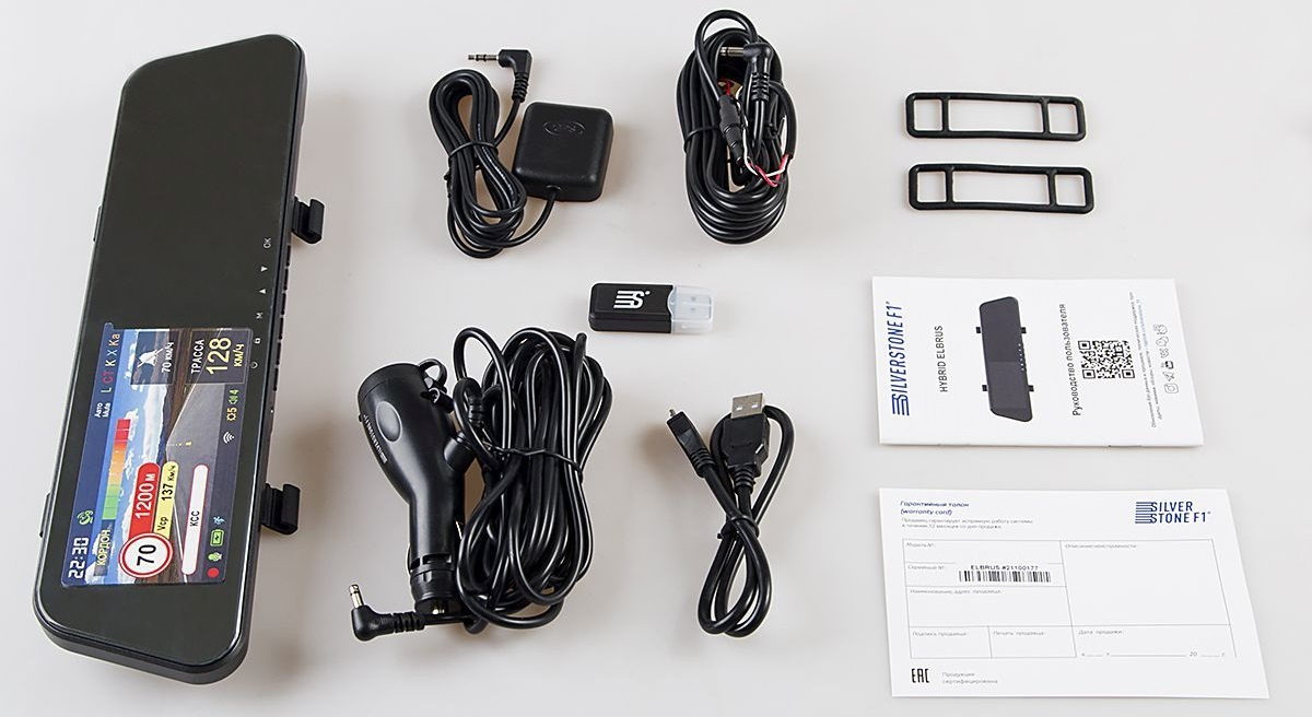 Комбо-устройство SilverStone F1 HYBRID ELBRUS, крепления-резинки на зеркало заднего вида, адаптер питания с разъемом прикуривателя, провод для скрытого подключения комбо-устройства, картридер, руководство пользователя (инструкция по эксплуатации), гарантийный талон