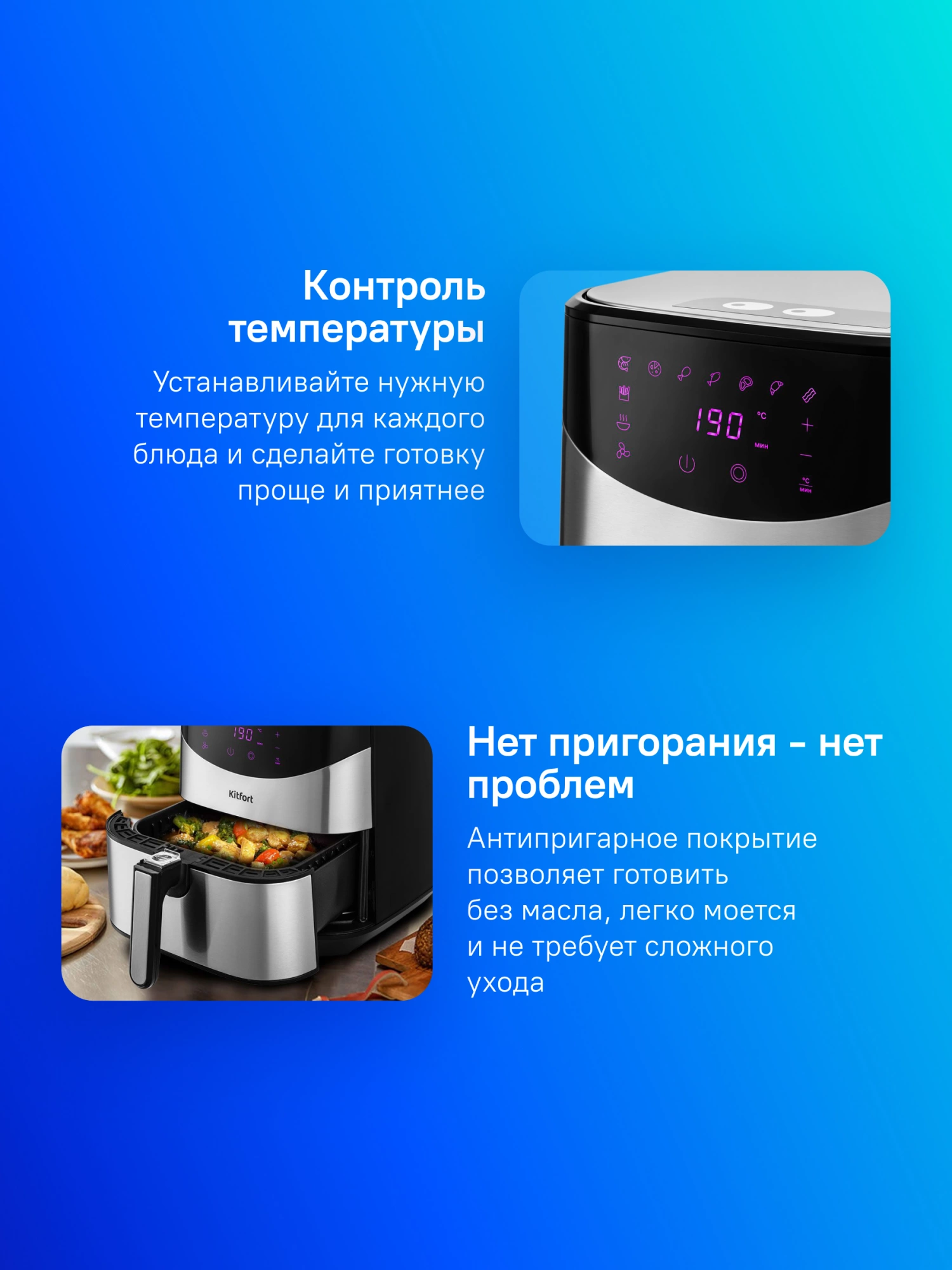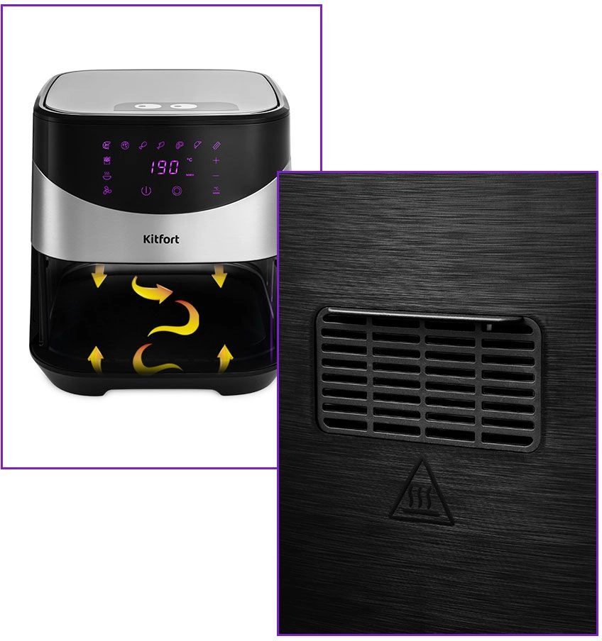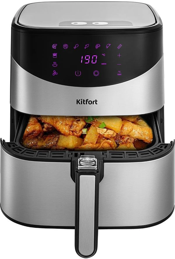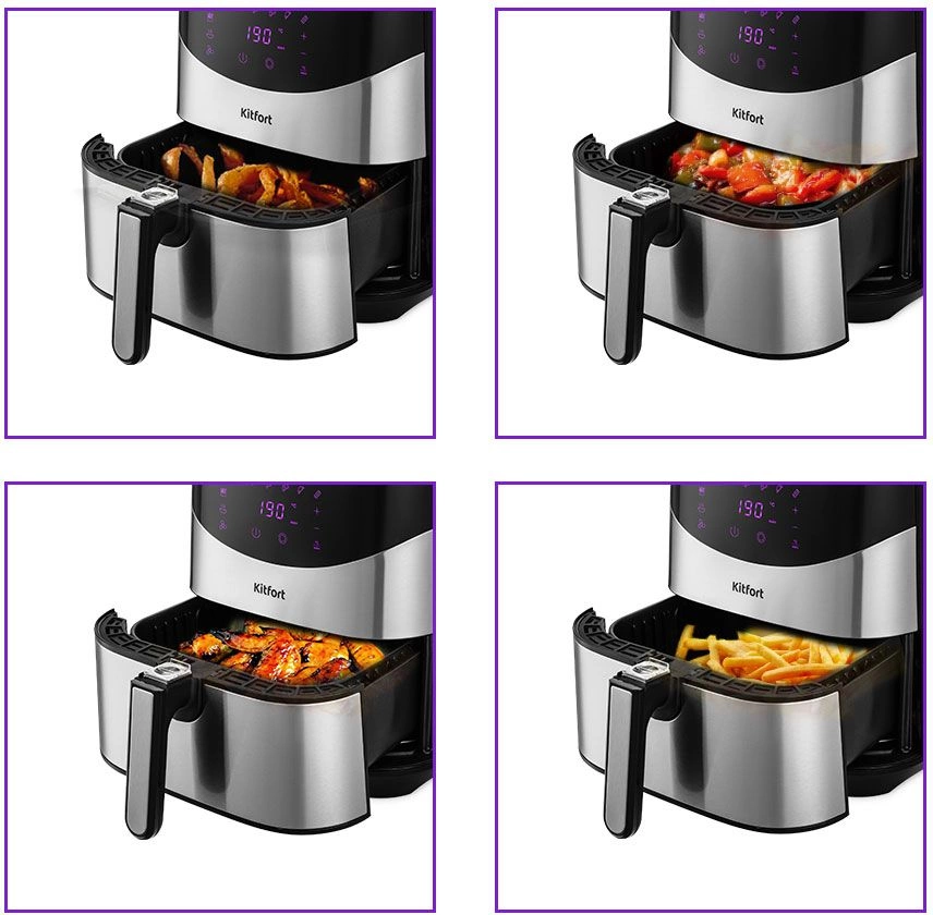 Стильный аэрогриль Kitfort КТ-2231 может использоваться как аэрогриль, а также как аэрофритюрница и духовка и позволяет готовить большинство продуктов с минимальным количеством масла или вовсе без его добавления.