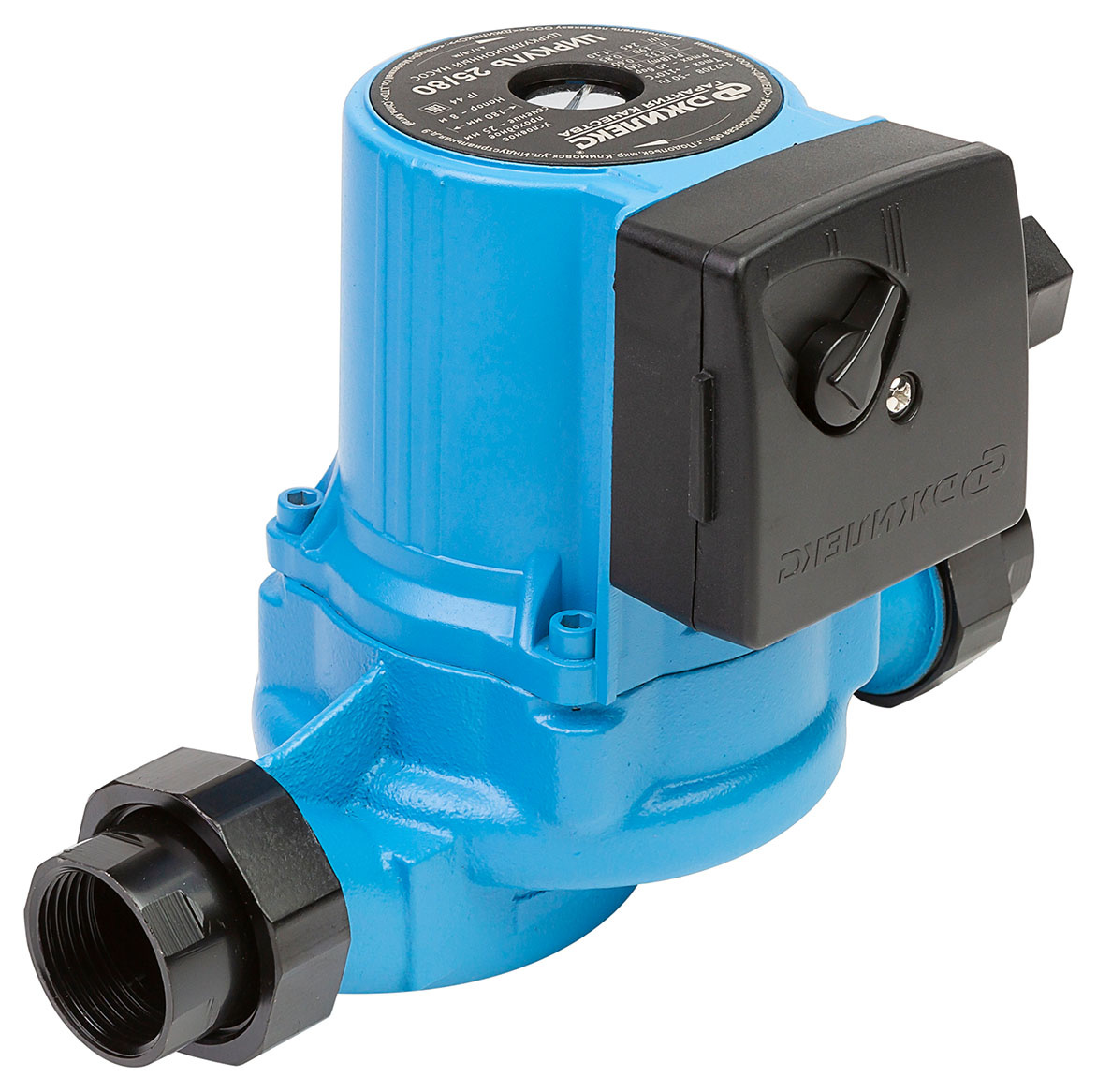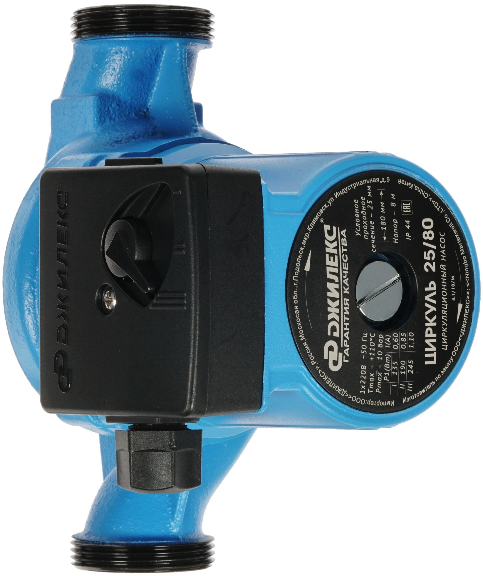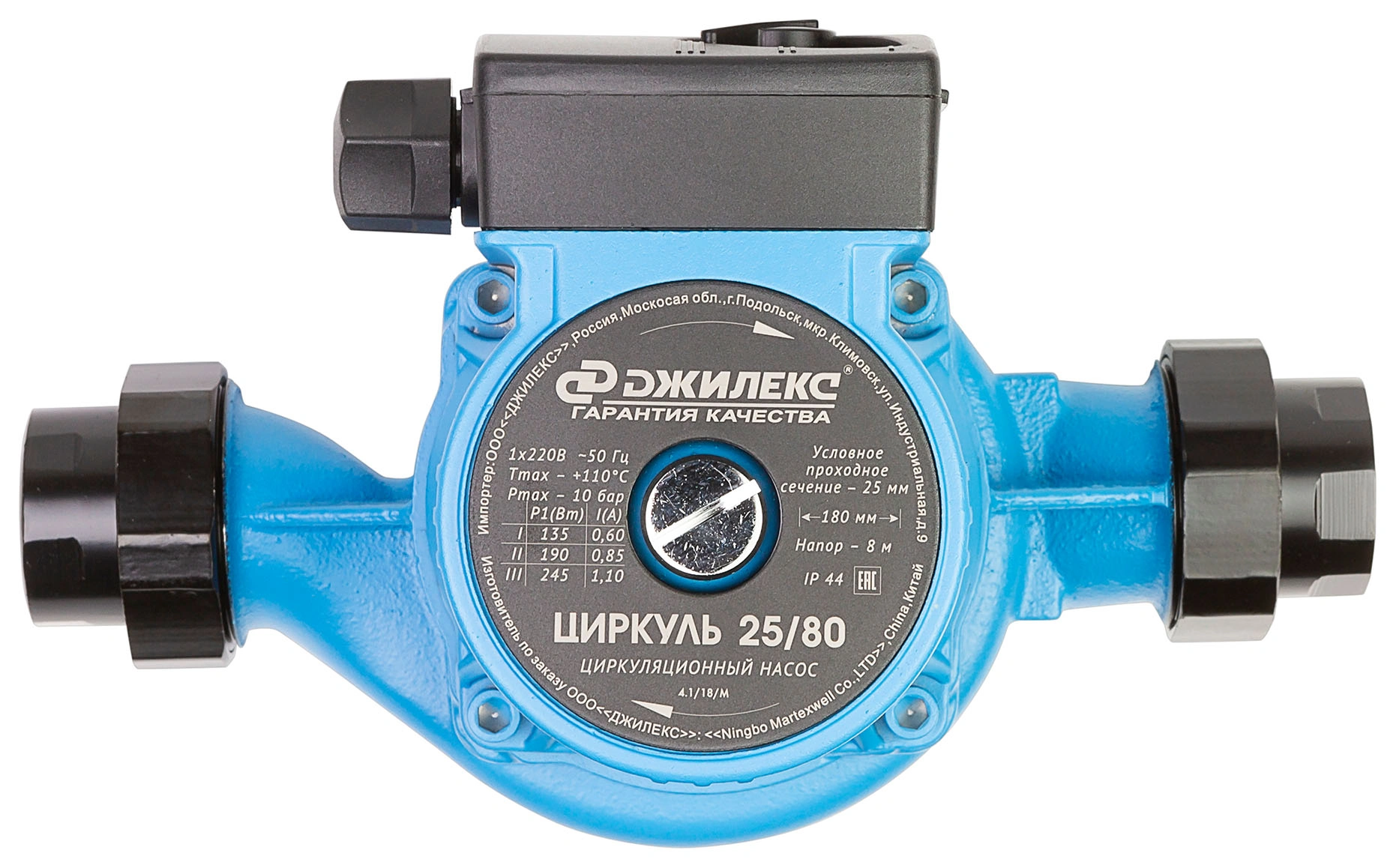 Оборудован переключателем скоростей, позволяющим подобрать оптимальный режим работы и экономно расходовать электроэнергию. В комплектацию входят присоединительные гайки, защищенные от коррозии. Оснащен клапаном для сброса воздуха. Установочный размер между присоединительными фланцами — 180 мм.