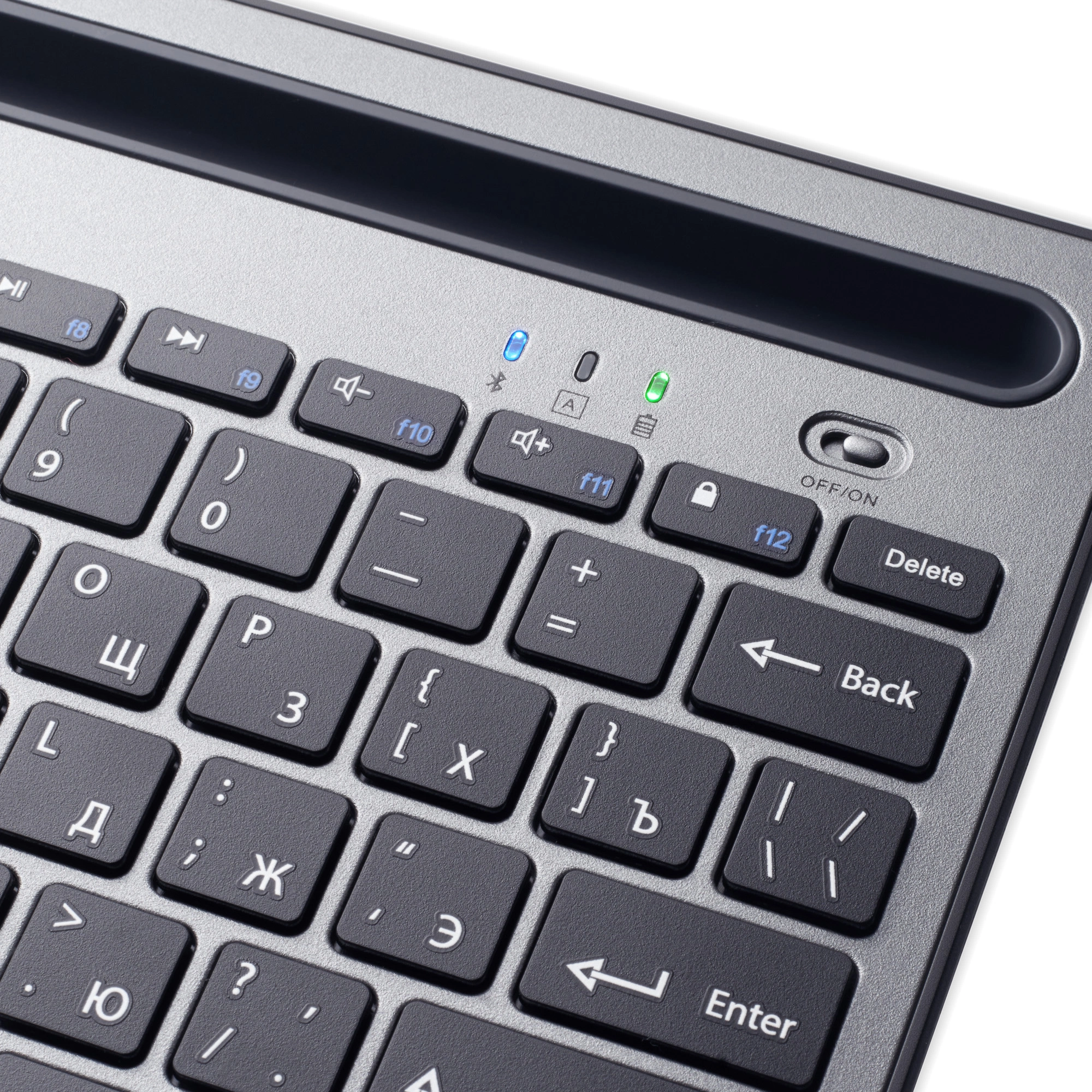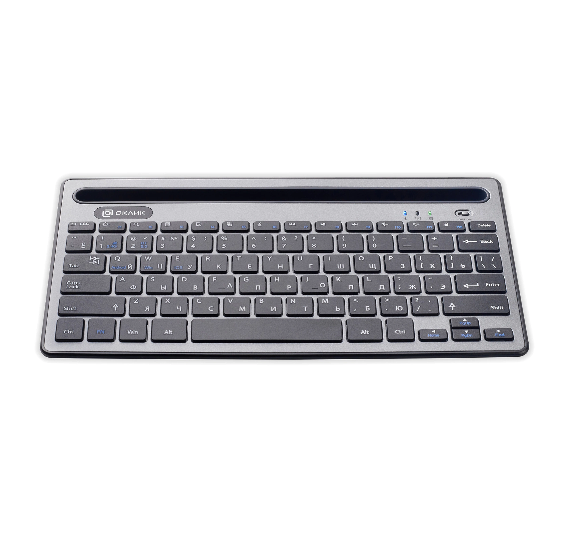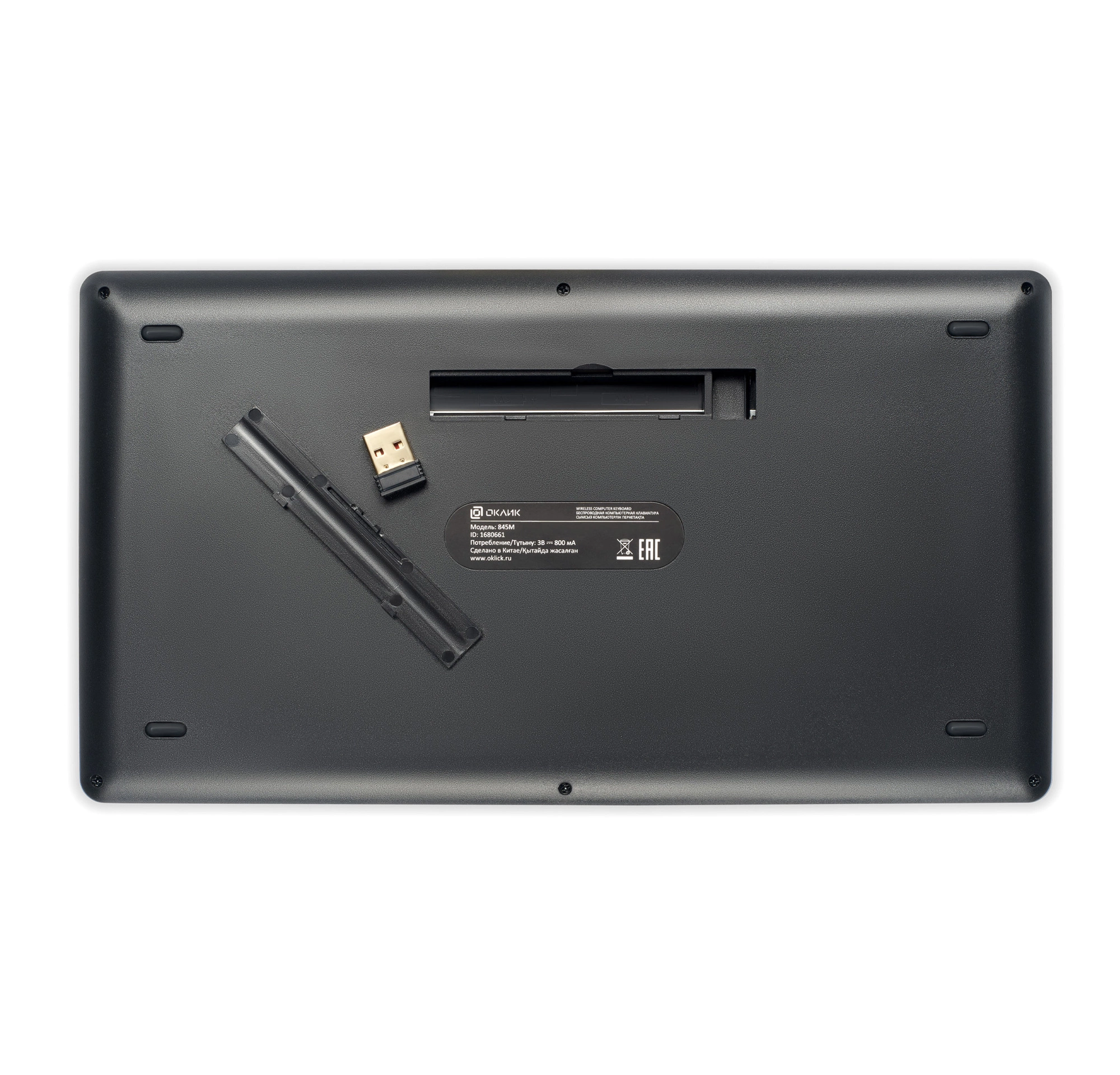 Модель Oklick 845M поддерживает беспроводное подключение по Bluetooth 5.0, а также по радиоканалу 2,4 ГГц. С ее помощью можно набирать текст не только на ПК, но и на смартфонах или планшетах – для этого в конструкции предусмотрен специальный держатель для мобильных устройств. Модель совместима с ОС Windows, MAC, Linux и Android. Питание осуществляется от двух мизинчиковых батареек AAA.