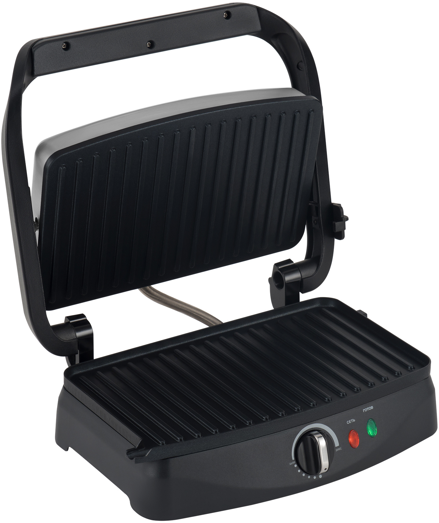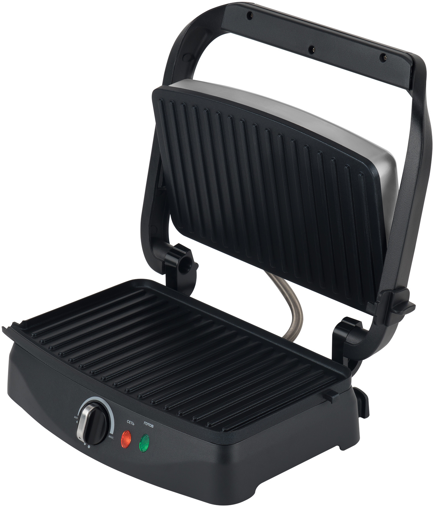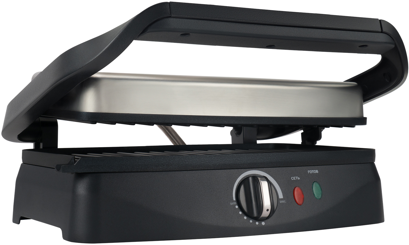 В отличие от классического гриля, данная модель питается от электричества, а в её основе – 1800-ваттный ТЭН, который быстро разогревается. Необходимую для готовки температуру можно выбрать с помощью поворотного регулятора. Рядом с ним предусмотрена световая индикация, состоящая из двух ламп. Первая показывает, включен ли прибор, а вторая – готов ли он к работе.