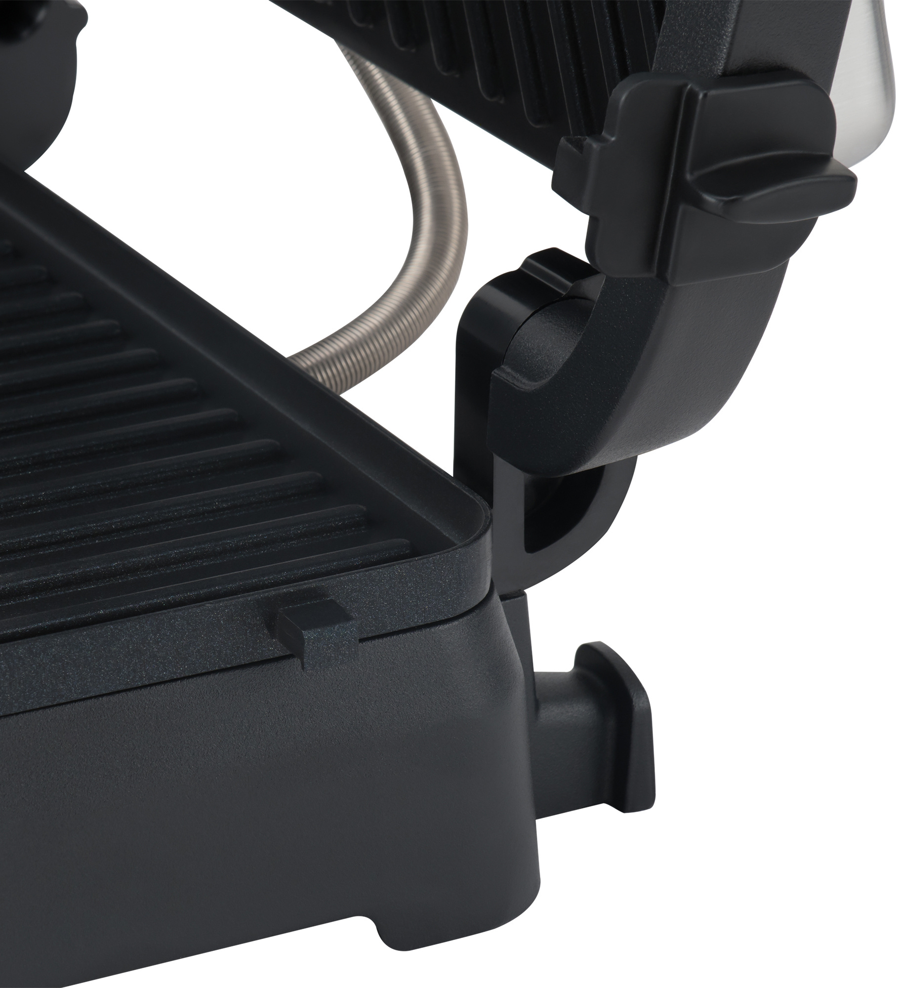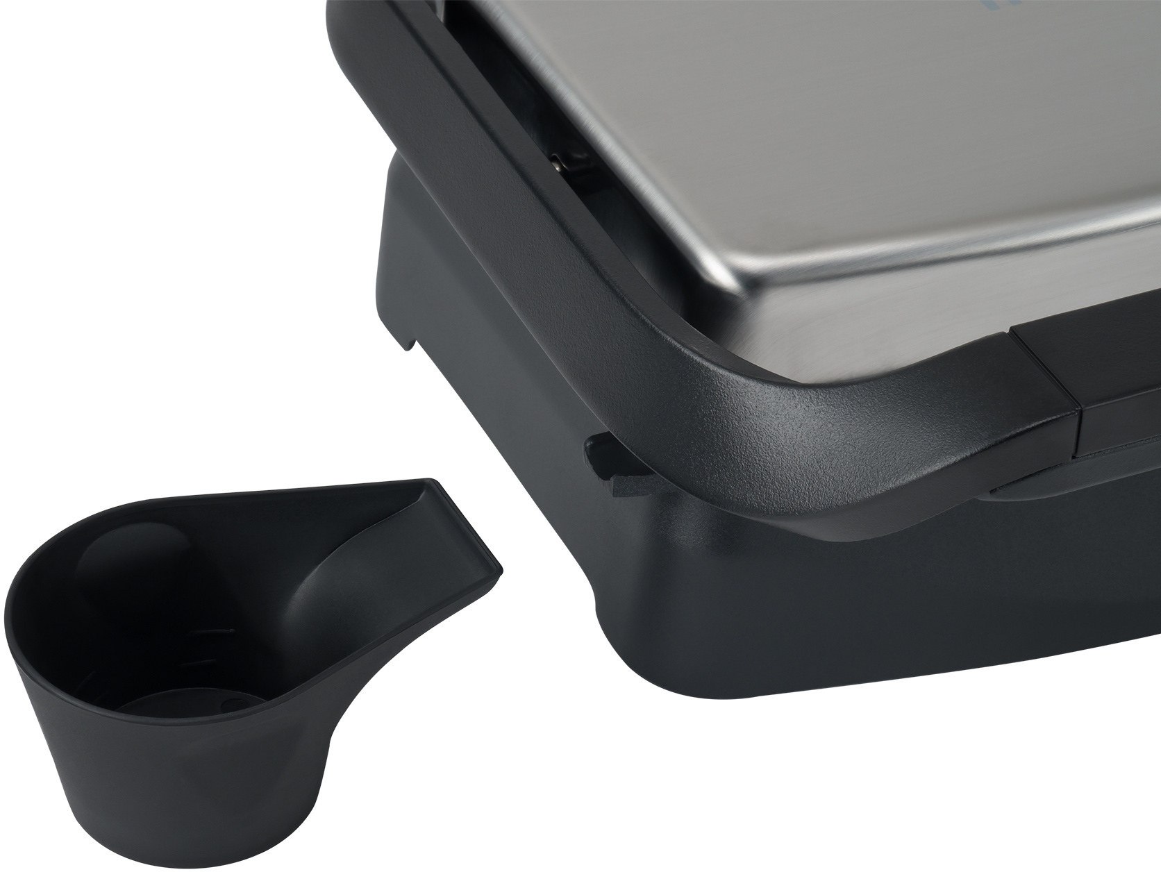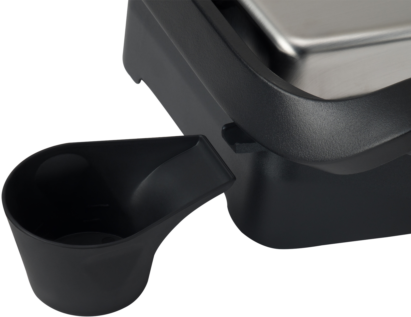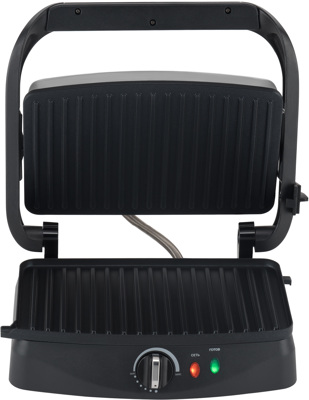 В отличие от классического гриля, данная модель питается от электричества, а в её основе – 1800-ваттный ТЭН, который быстро разогревается. Необходимую для готовки температуру можно выбрать с помощью поворотного регулятора. Рядом с ним предусмотрена световая индикация, состоящая из двух ламп. Первая показывает, включен ли прибор, а вторая – готов ли он к работе.