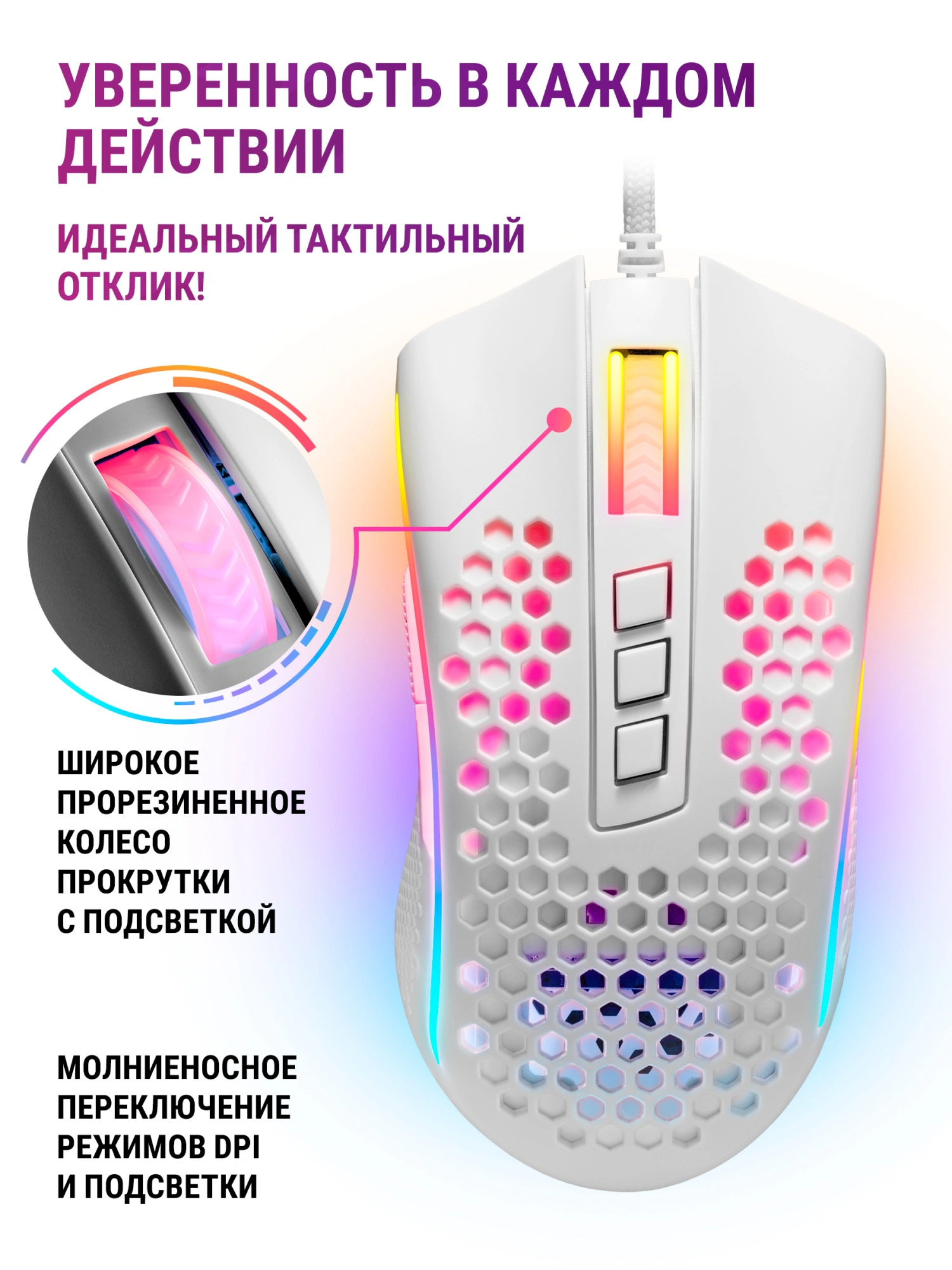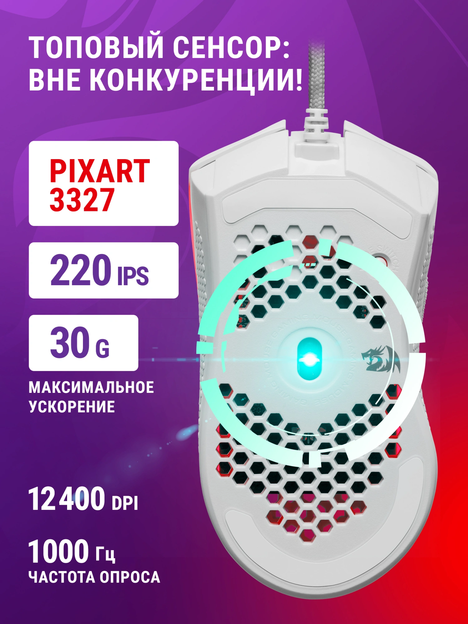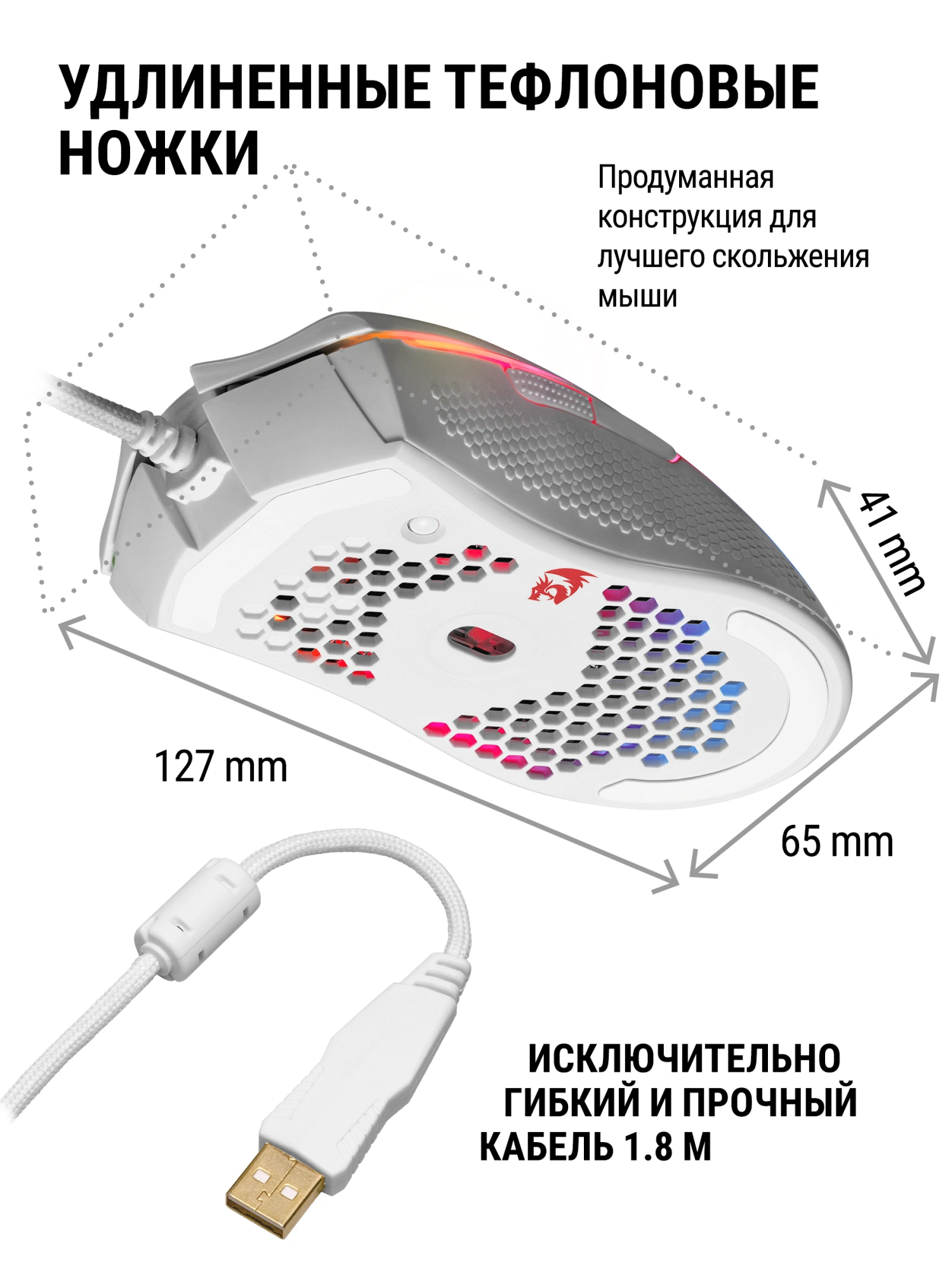 Высококлассный оптический сенсор Pixart 3327, качественные переключатели Huano с ресурсом в 20 млн нажатий. Невероятно гибкий и прочный кабель. Лёгкий вес, красивая подсветка. Широкое прорезиненное колесо прокрутки шириной 8 мм с подсветкой. Удлиненные тефлоновые ножки.
