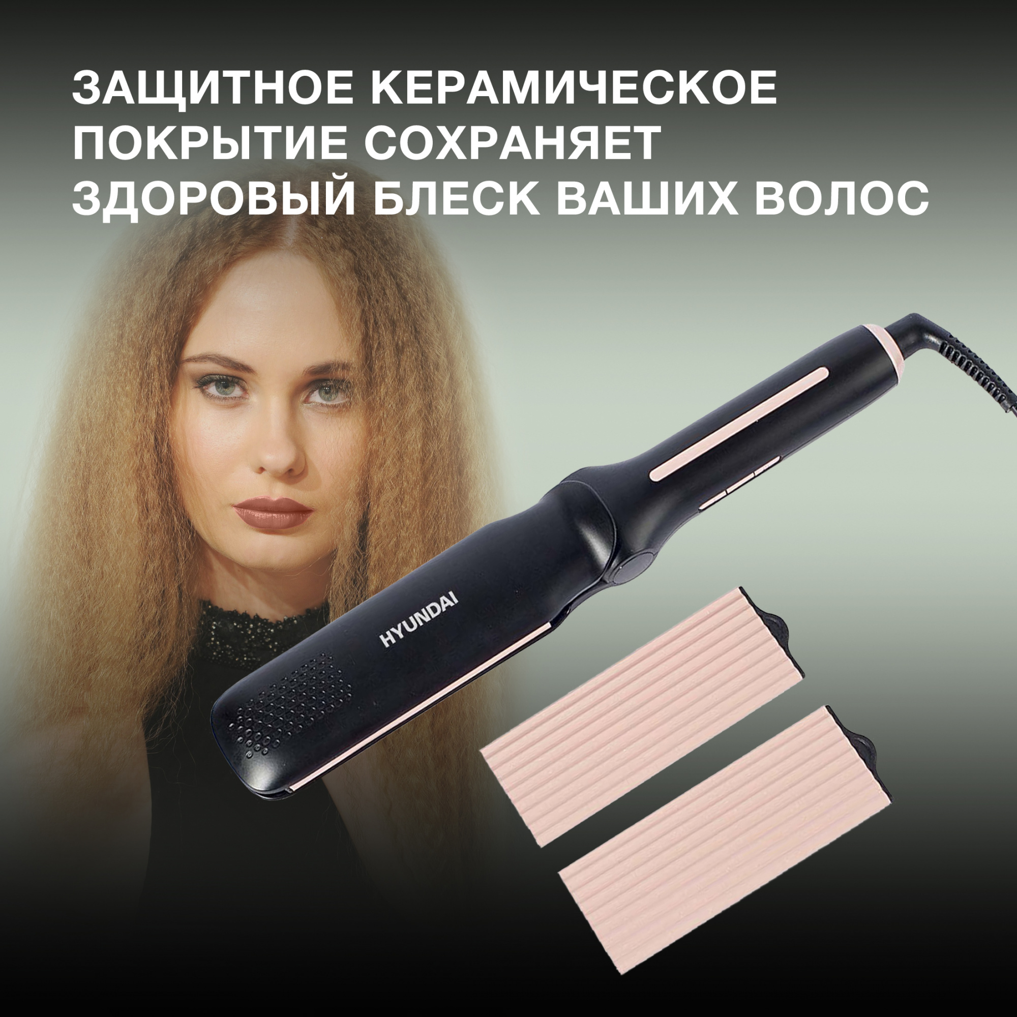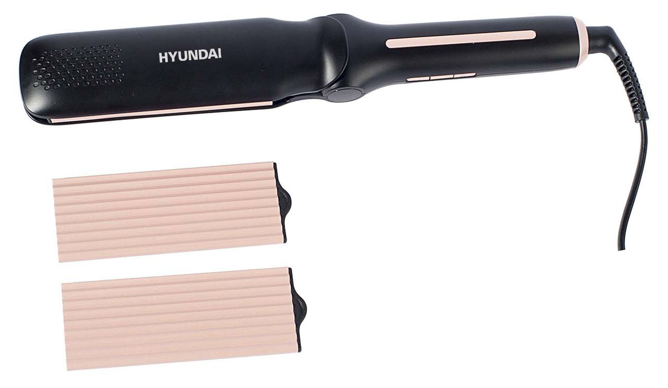 В комплекте с Hyundai H-HM1550 поставляются сменные рельефные насадки, позволяющие придать волосам оригинальную волнистую фактуру. И они, и базовые гладкие пластины выполнены из смеси керамики и турмалина. Оба материала нагреваются равномерно по всей площади и отличаются бережным отношением к любым типам волос. Также турмалин обладает свойством ионизации. Эти мелкие частицы, имеющие отрицательный заряд, делают шевелюру более податливой для завивок, укладок и выпрямления, а также придают ей здоровый и блестящий вид.