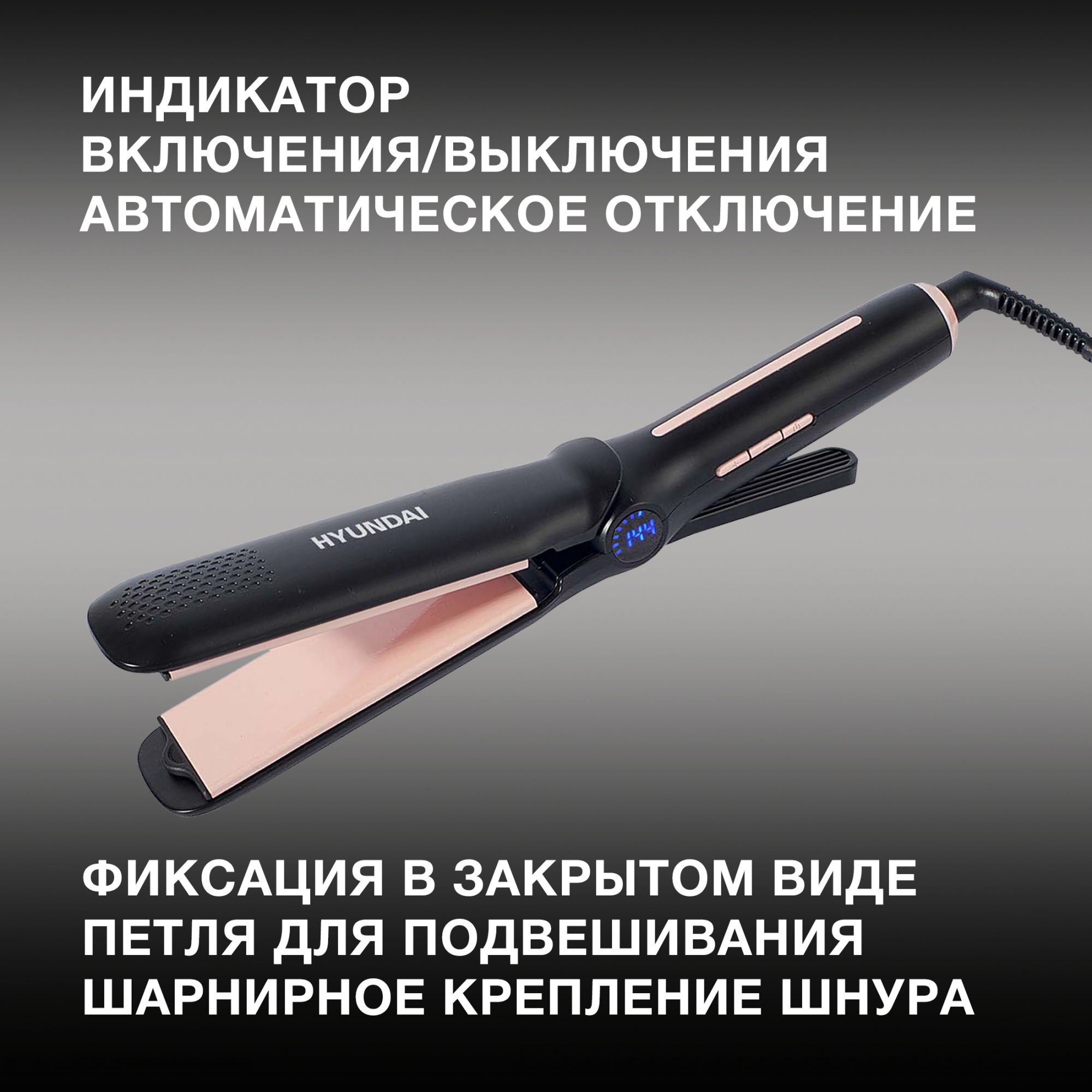 Шнур плойки имеет шарнирное крепление, чтобы исключить перекручивание во время работы. А рядом с ним, на рукоятке, предусмотрена эргономичная петля для вертикального хранения устройства.