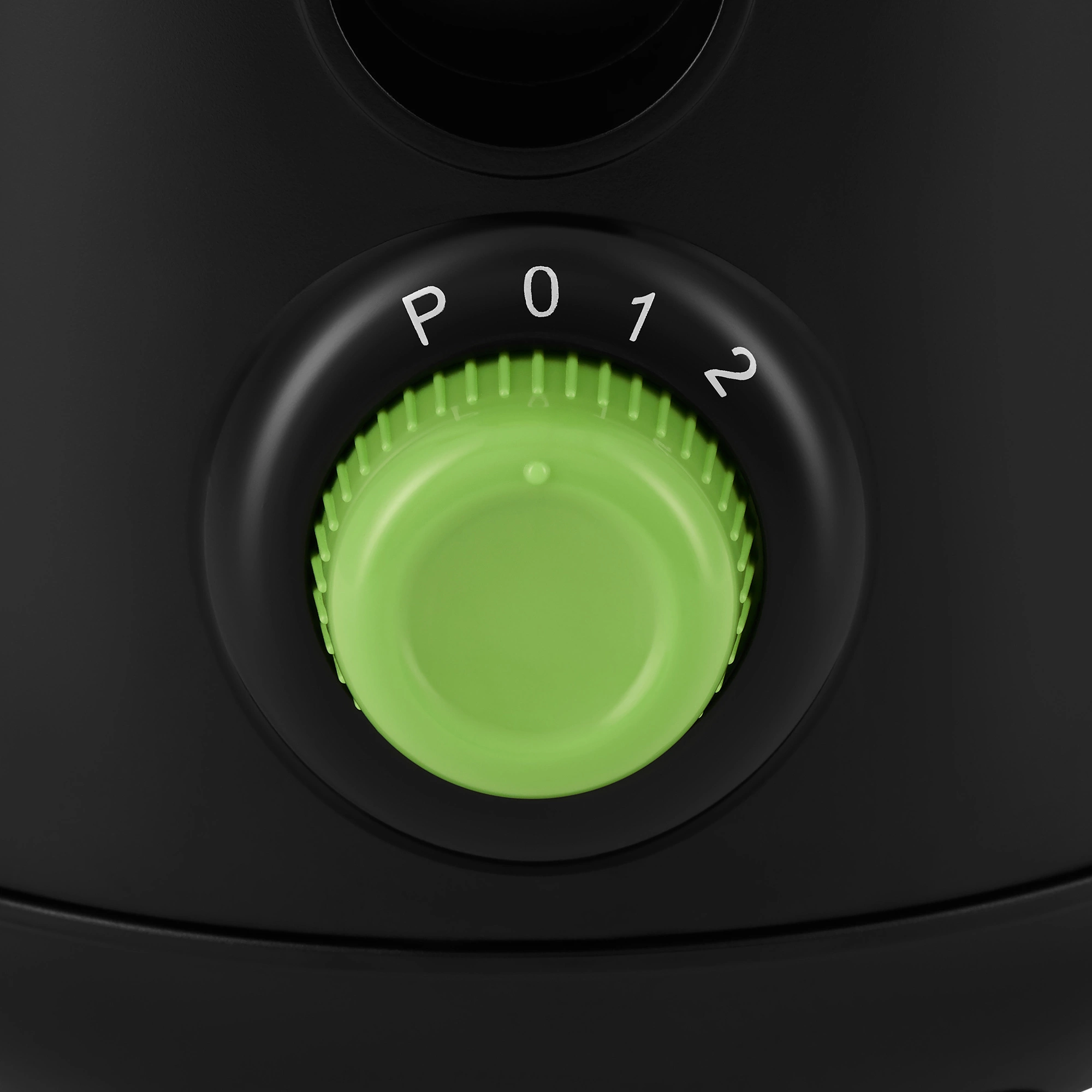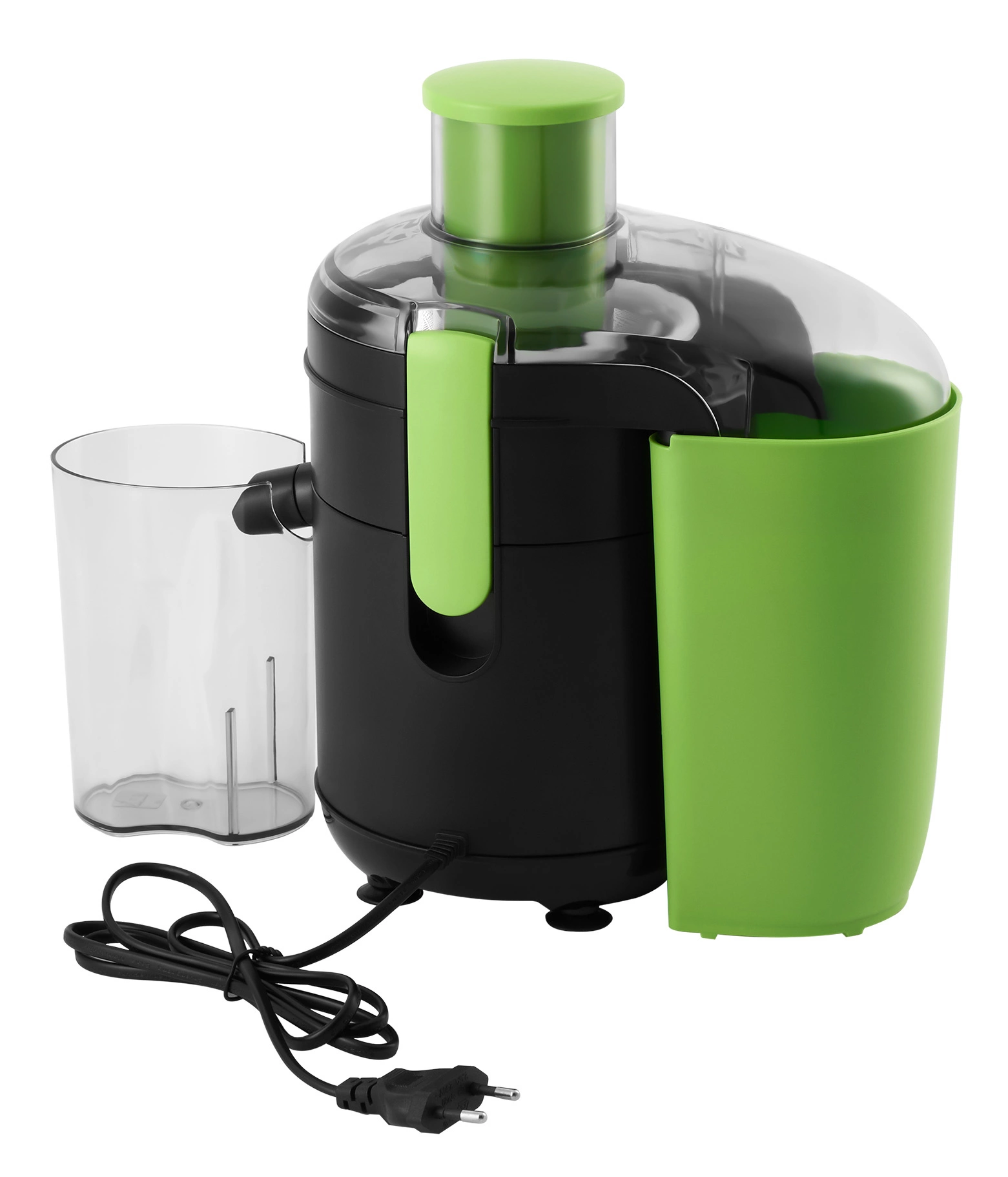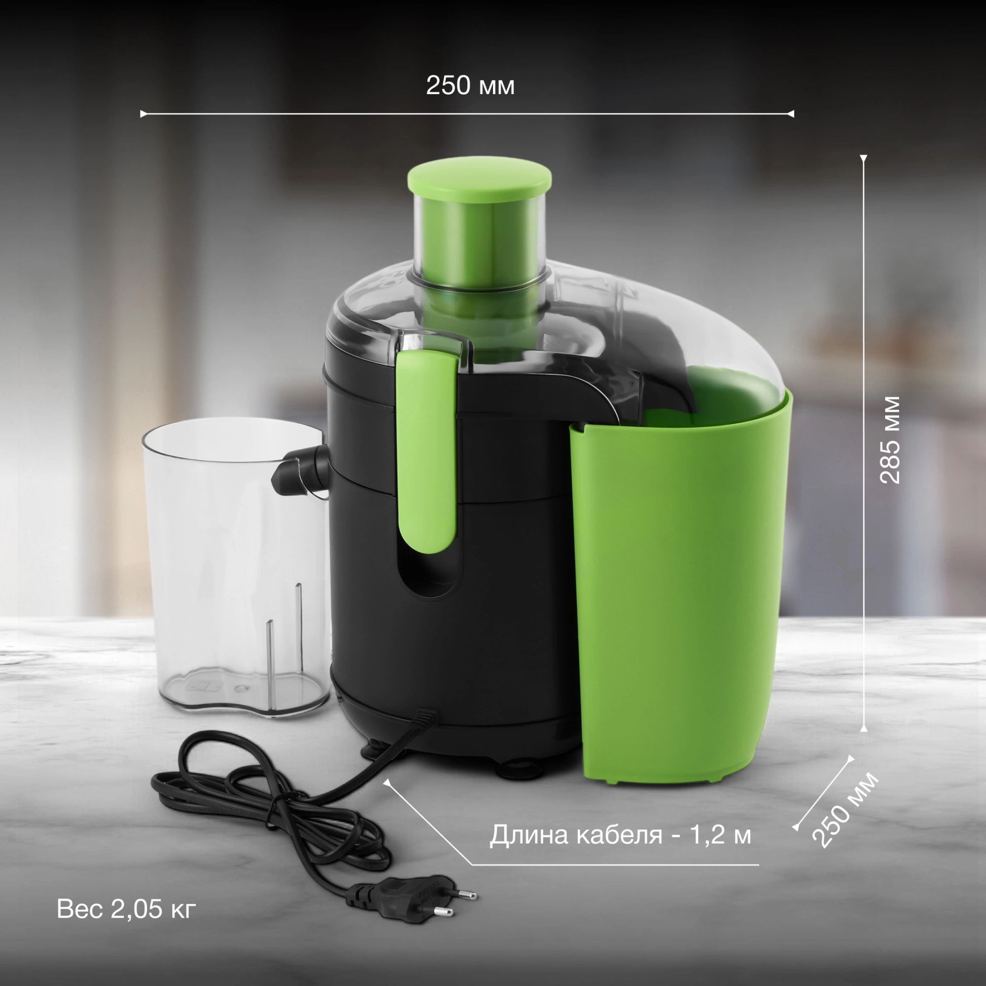 Мощность прибора составляет 500 Вт, а доступных скоростей в нём две – этого достаточно, чтобы получить сок из большинства овощей и фруктов. Устройство использует центробежную силу, чтобы отделять мякоть, для неё есть отдельный резервуар на 1000 мл. Разовый объём сока, на который рассчитана соковыжималка, 400 мл – это стандартный стакан.