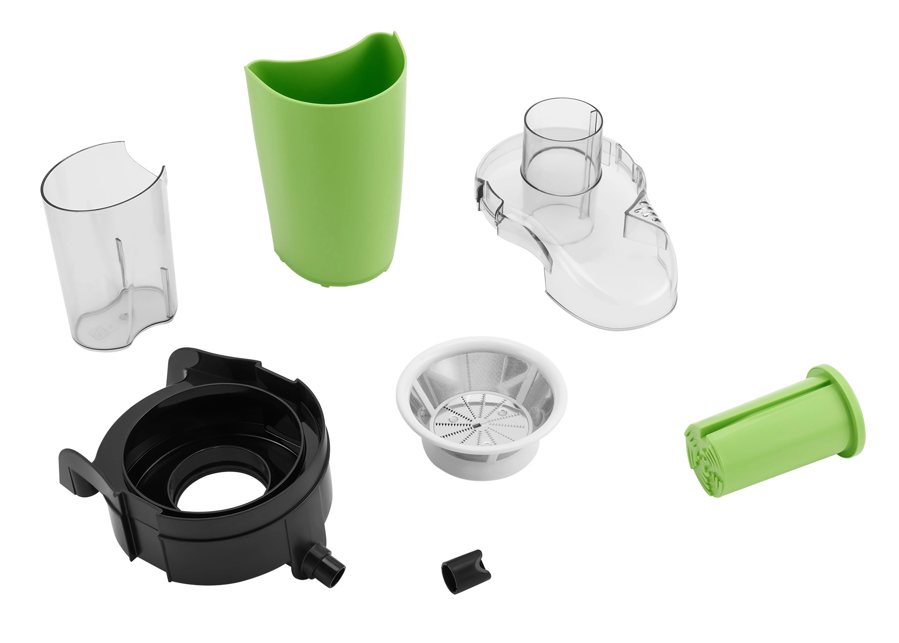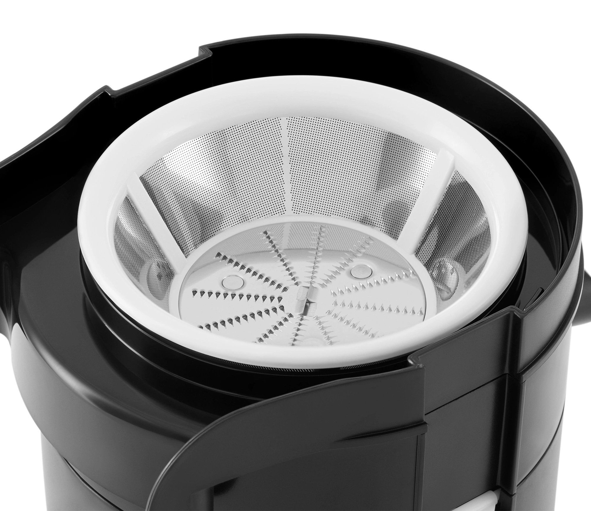 Устройство работает тихо – на громкости всего в 75 дБ, практически не вибрирует, а резиновые ножки обеспечивают ему дополнительную устойчивость и позволяют устойчиво стоять на поверхности из любого материала, глянцевого или матового. Сетка, установленная в Hyundai JE 1625, сделана из нержавеющей стали, что заметно продлевает ресурс её работы, а корпус – из качественного пищевого пластика, никак не влияющего на вкус получаемого сока. Круглая горловина помогает проще загружать фрукты и овощи.