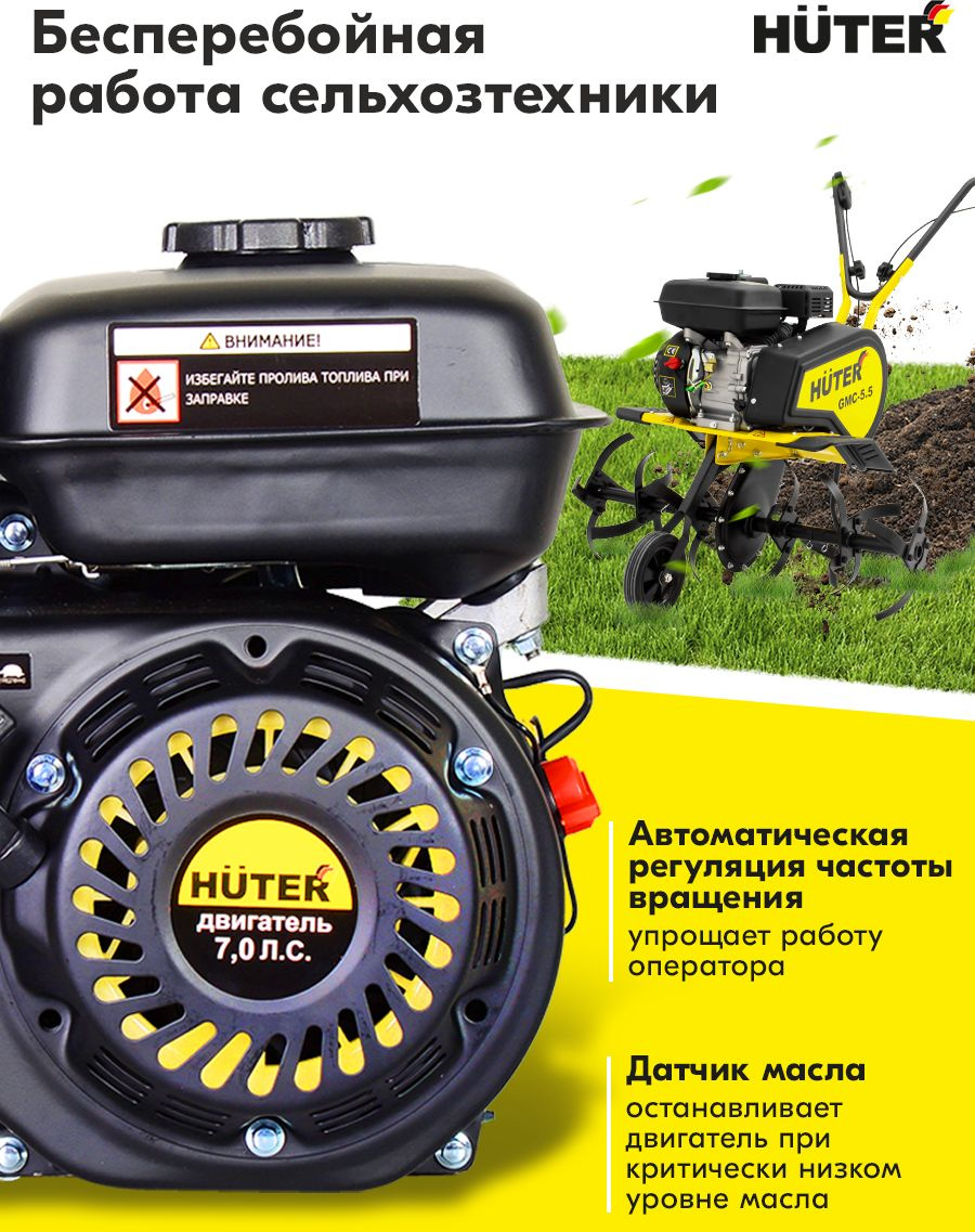 Двигатель бензиновый HUTER GE-170F-20 предназначен для установки на садовую технику и другую технику, для которых подходят двигатели "Под шпонку", к примеру мотоблоки, снегоуборщики, мотопомпы и т.д. Датчик уровня масла. Защищает двигатель от работы без масла.