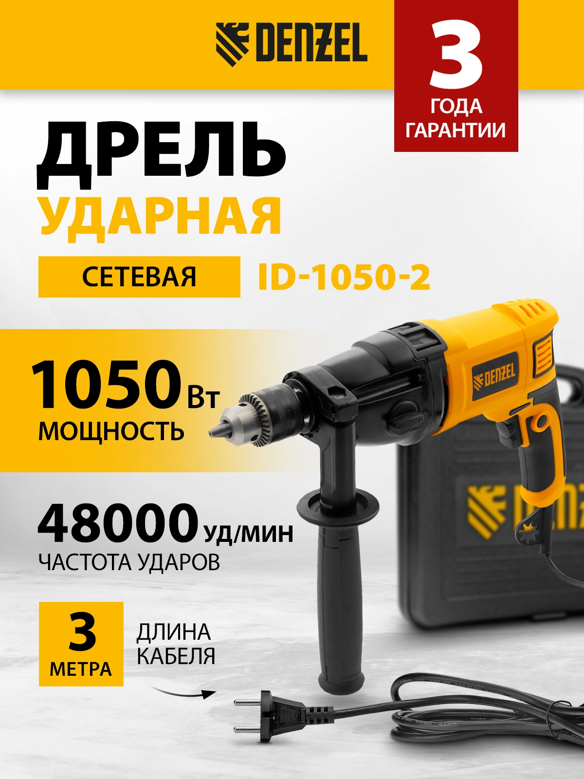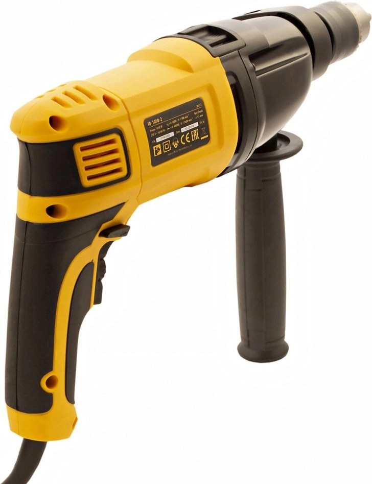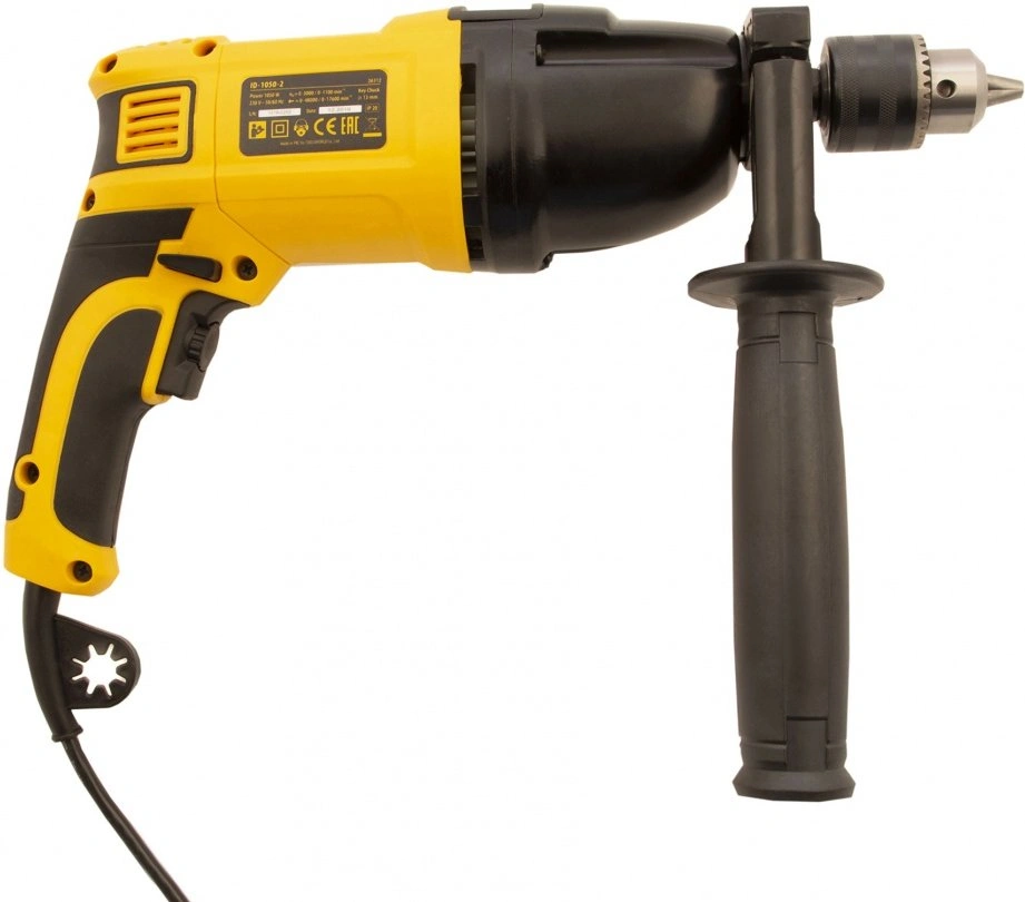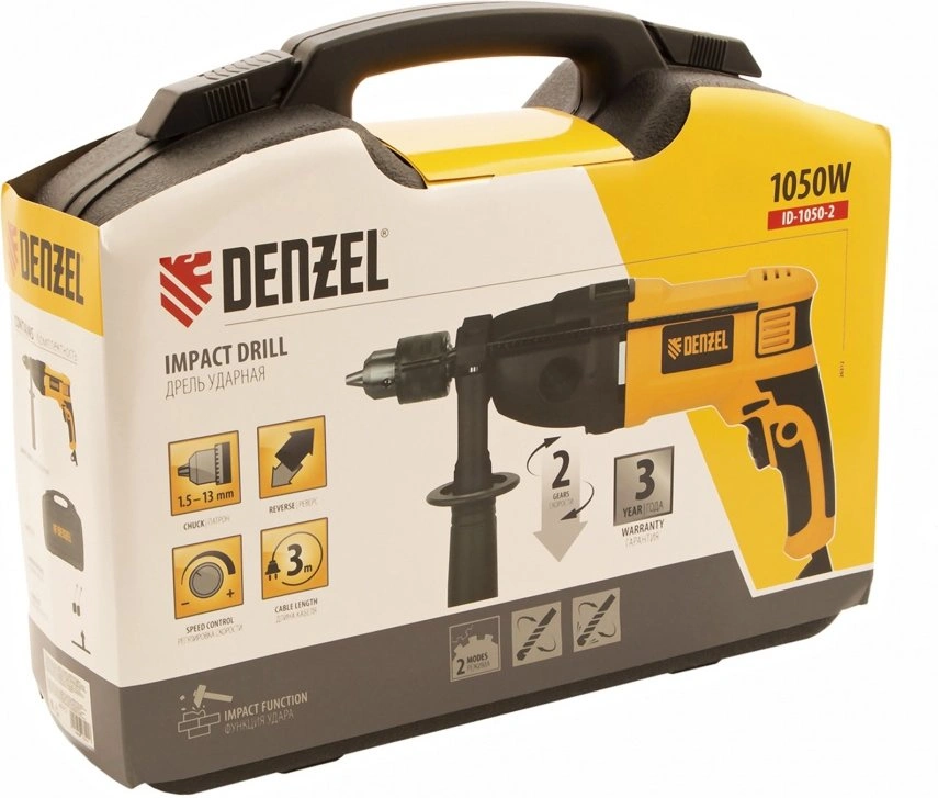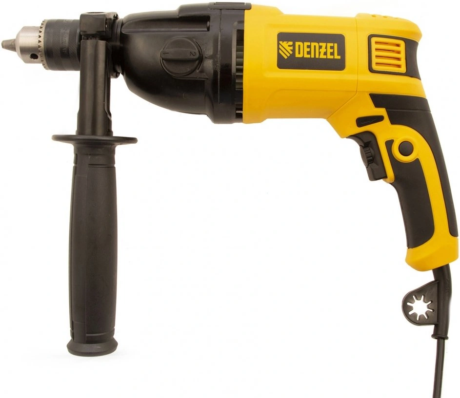 Дрель электрическая ударная, ключ от патрона, рукоятка боковая, ограничитель глубины сверления, комплект запасных угольных щеток, инструкция, гарантийный талон.