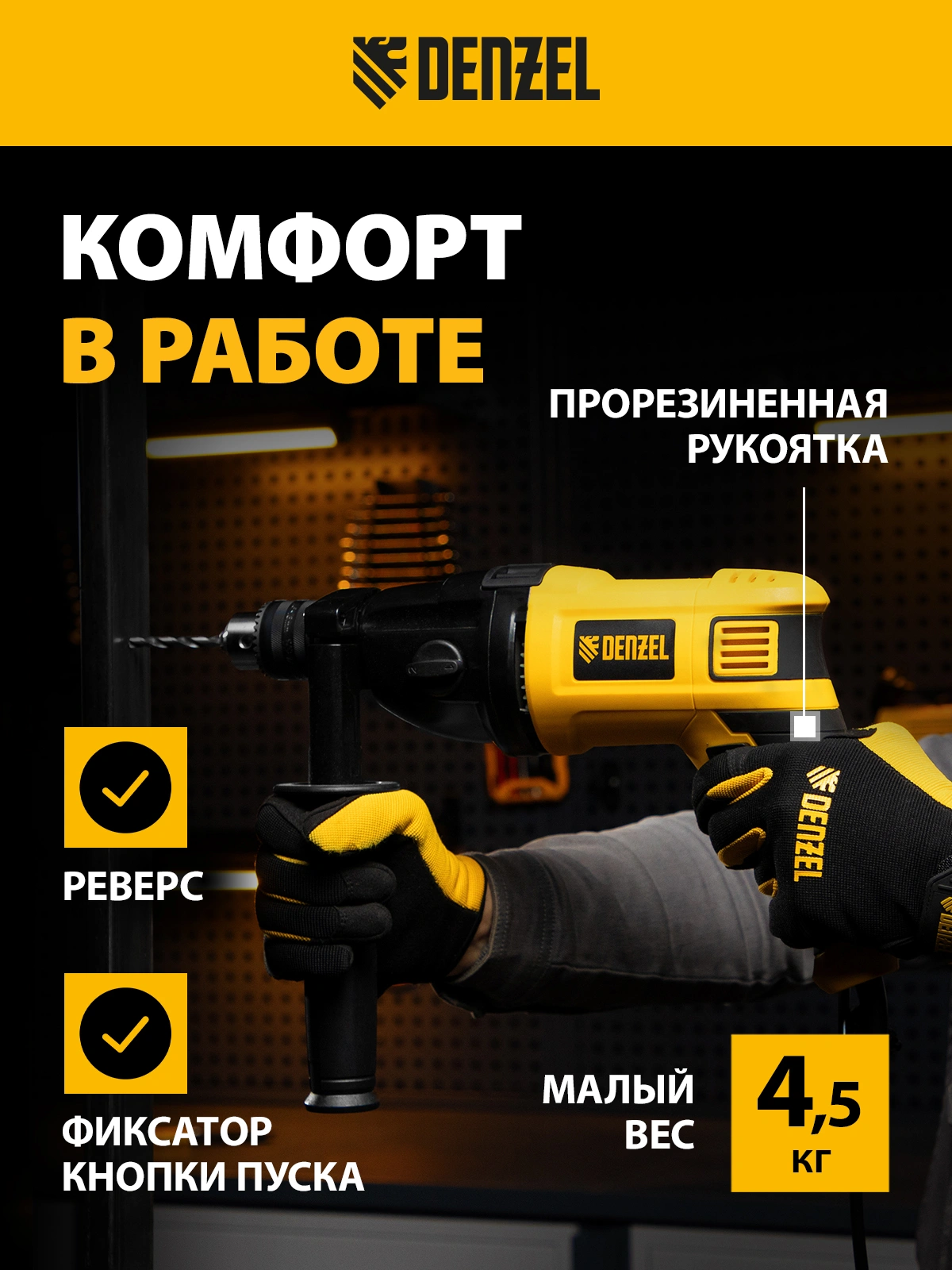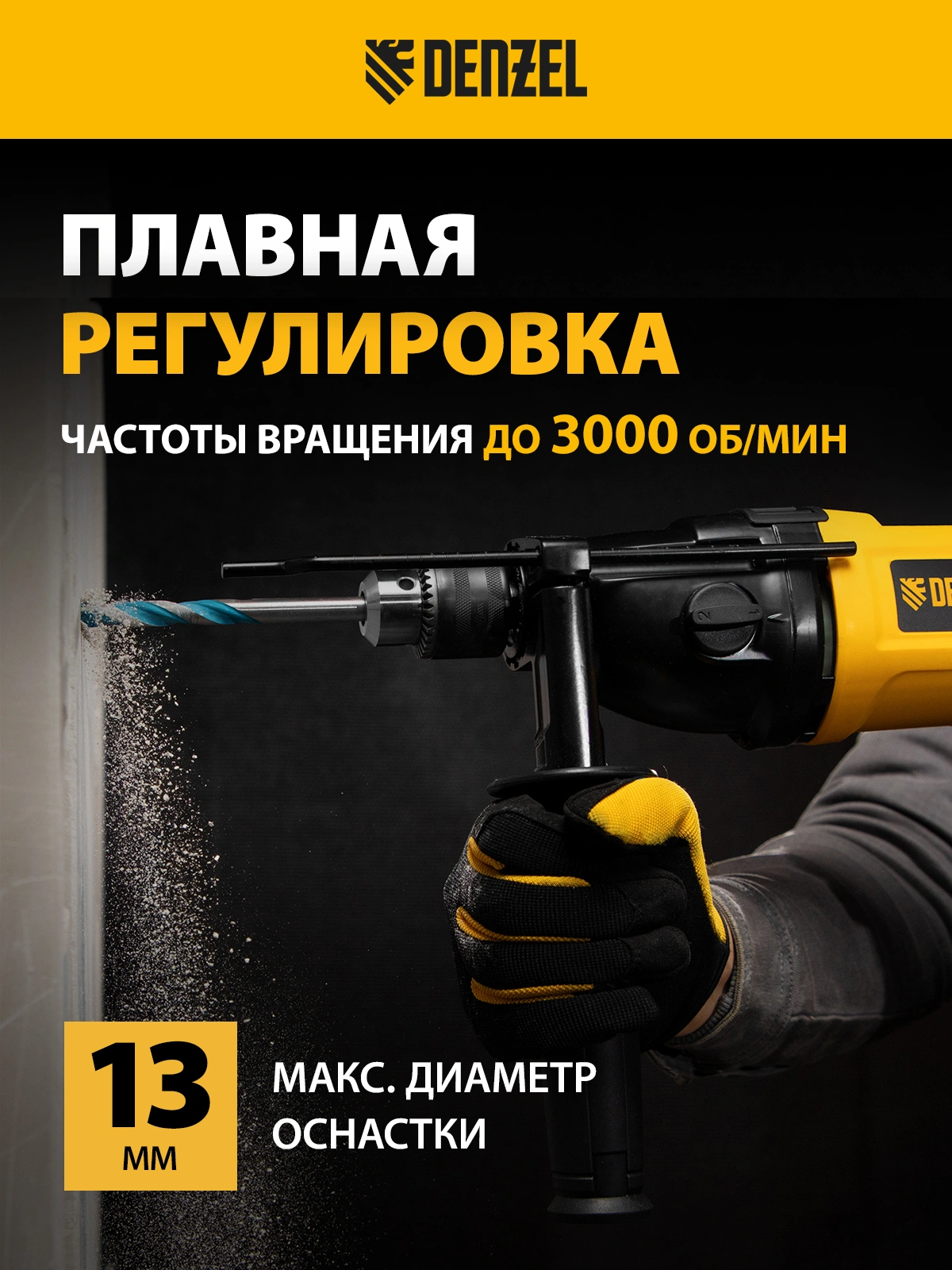 Широкий диапазон хвостовиков оснастки позволяет работать со сверлами маленького и большого диаметра. Для использования левосторонних сверл предусмотрен реверс, меняющий направление вращения патрона. Фиксация клавиши регулятора и кнопки включения обеспечивает комфортную работу.