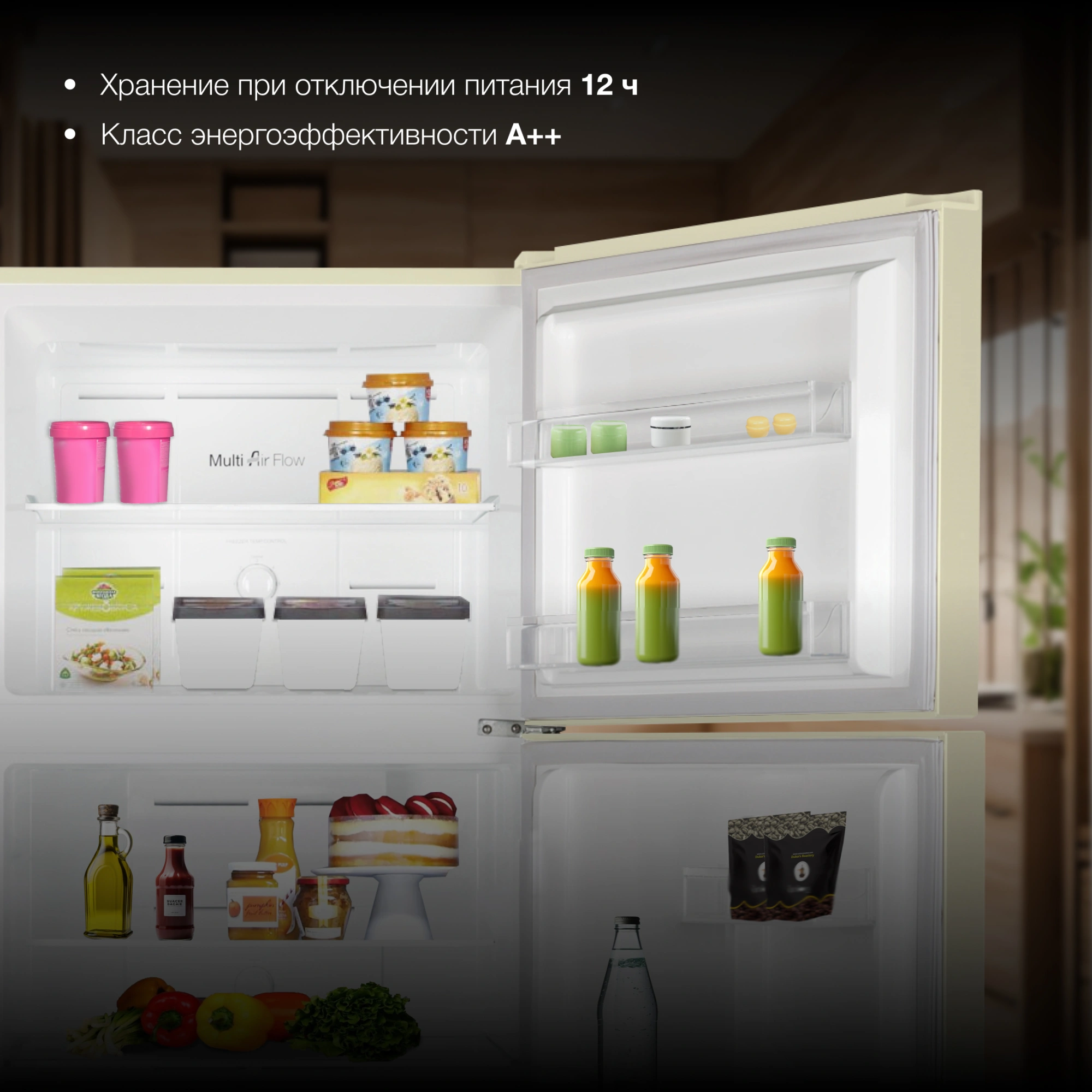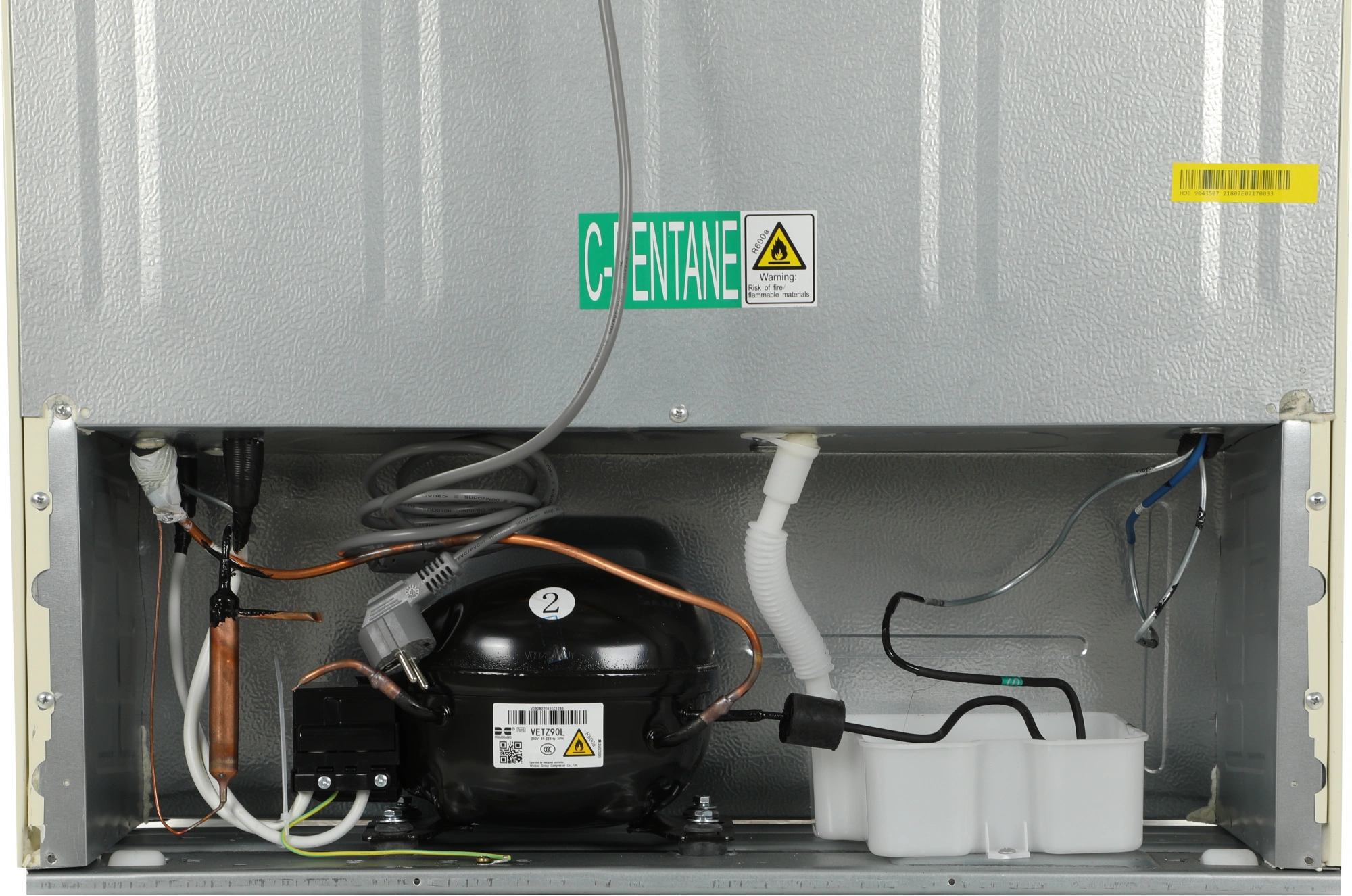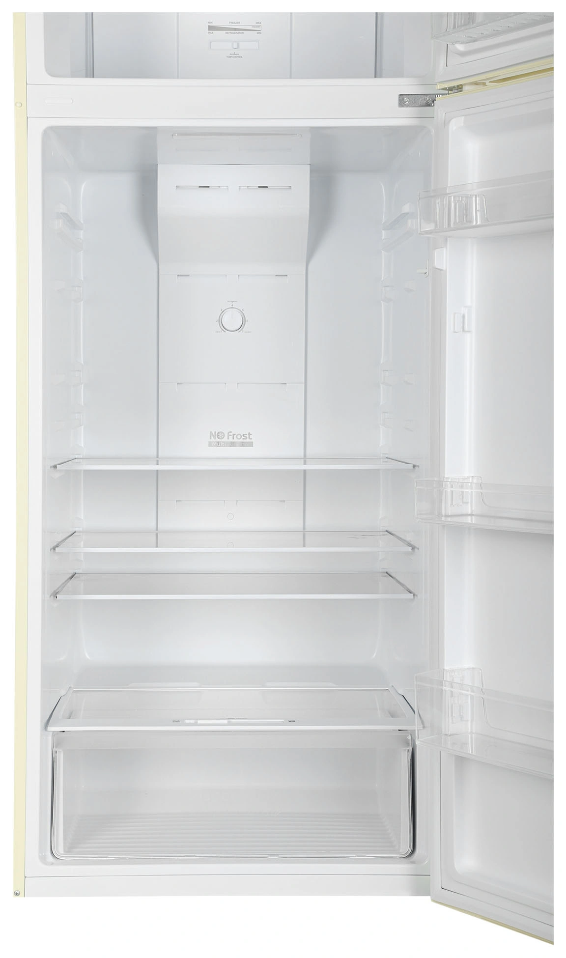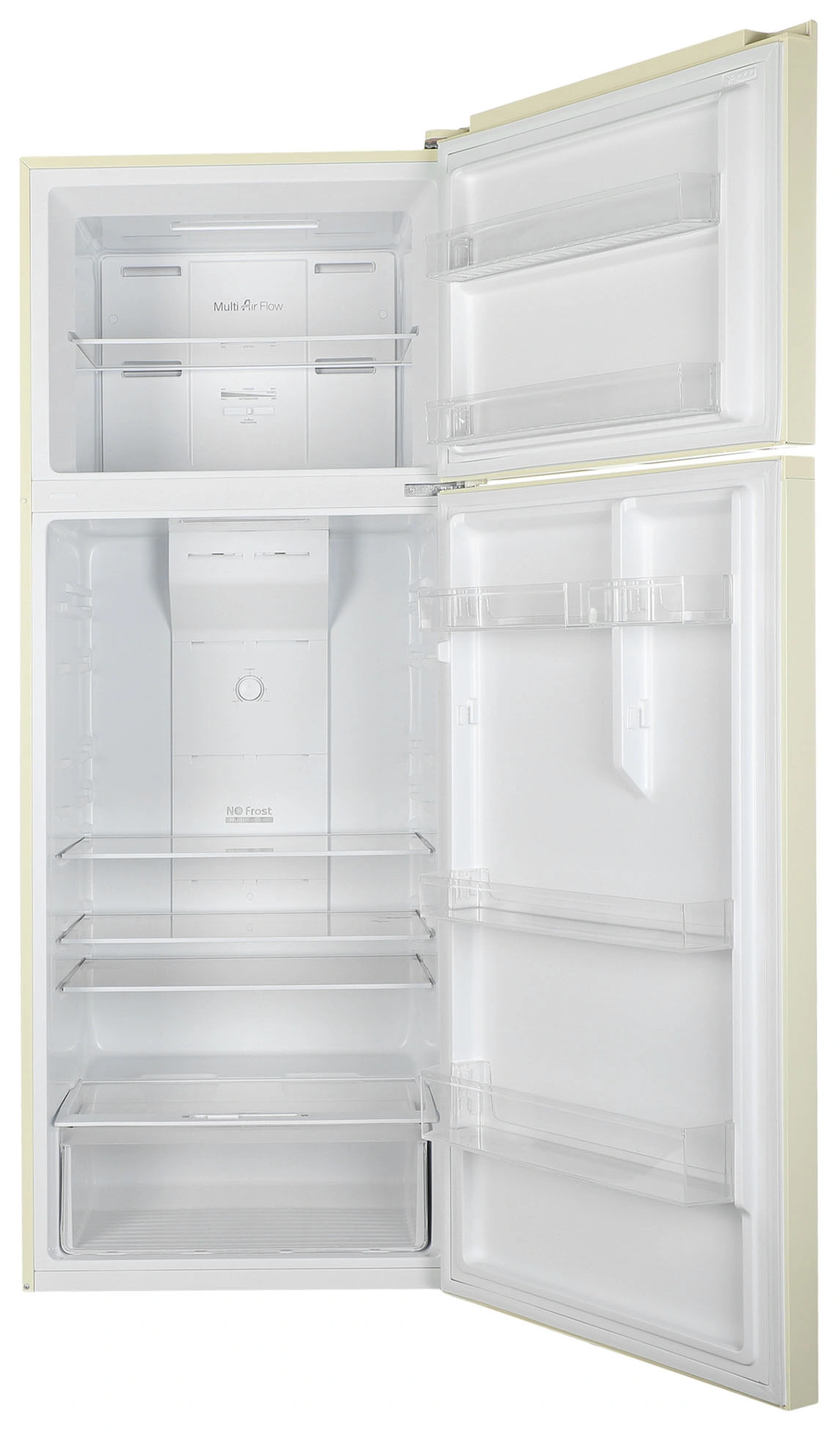 Прибор имеет два отсека, которые охлаждаются одним компрессором. Верхний предназначен для заморозки, а нижний для охлаждения. Оба они используют специальную систему No Frost, которая эффективно борется с образованием снега и наледи на стенках и дверцах. Хозяйки по достоинству оценят то, что девайс вообще не надо размораживать. При этом данная модель работает с минимальной громкостью 43 дБ. Это стало возможным благодаря качественному хладагенту R600a – он не создаёт лишнего давления и, соответственно, производит мало шума.