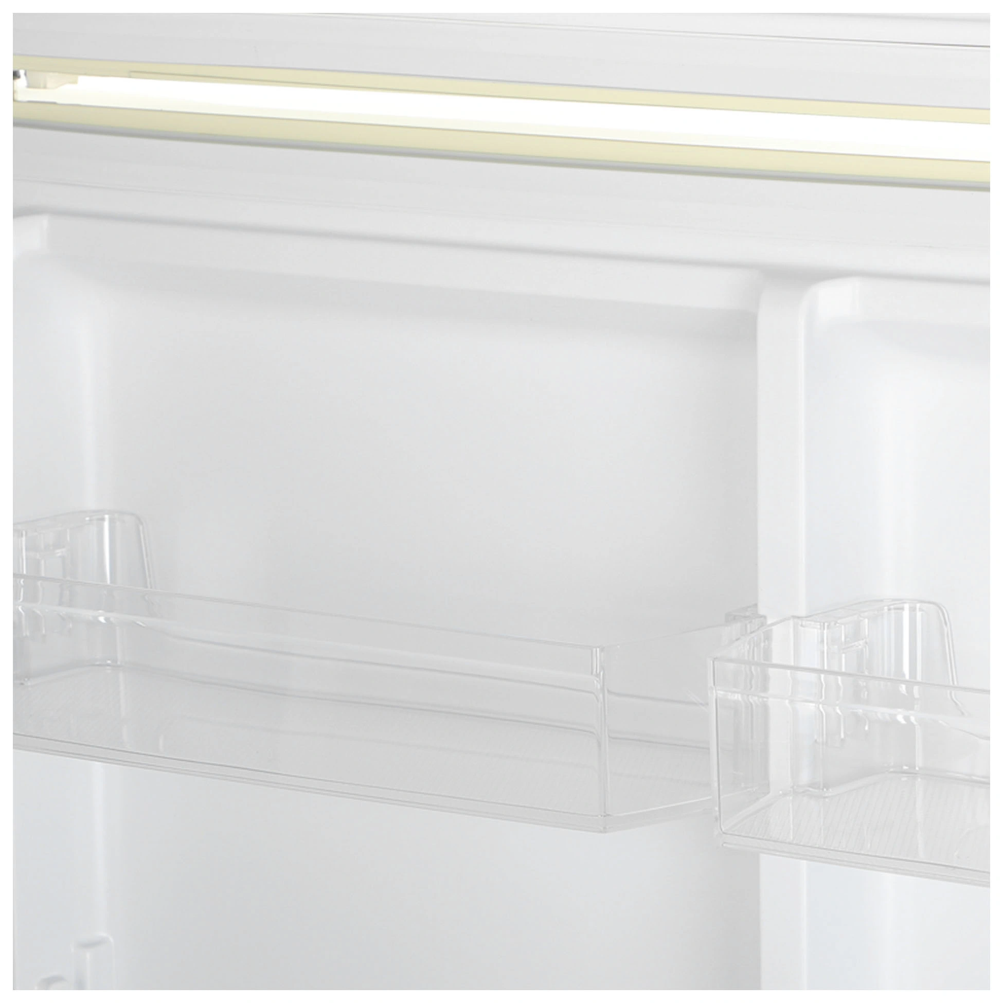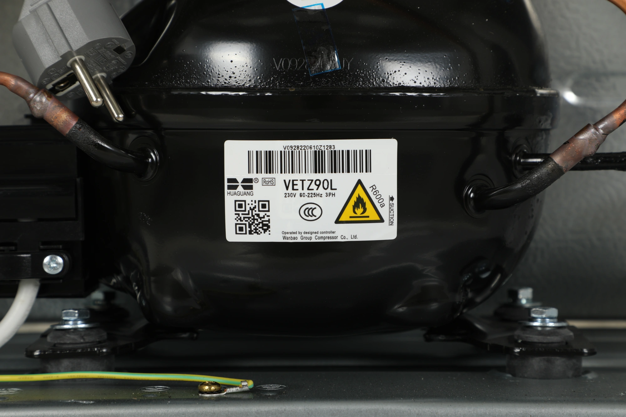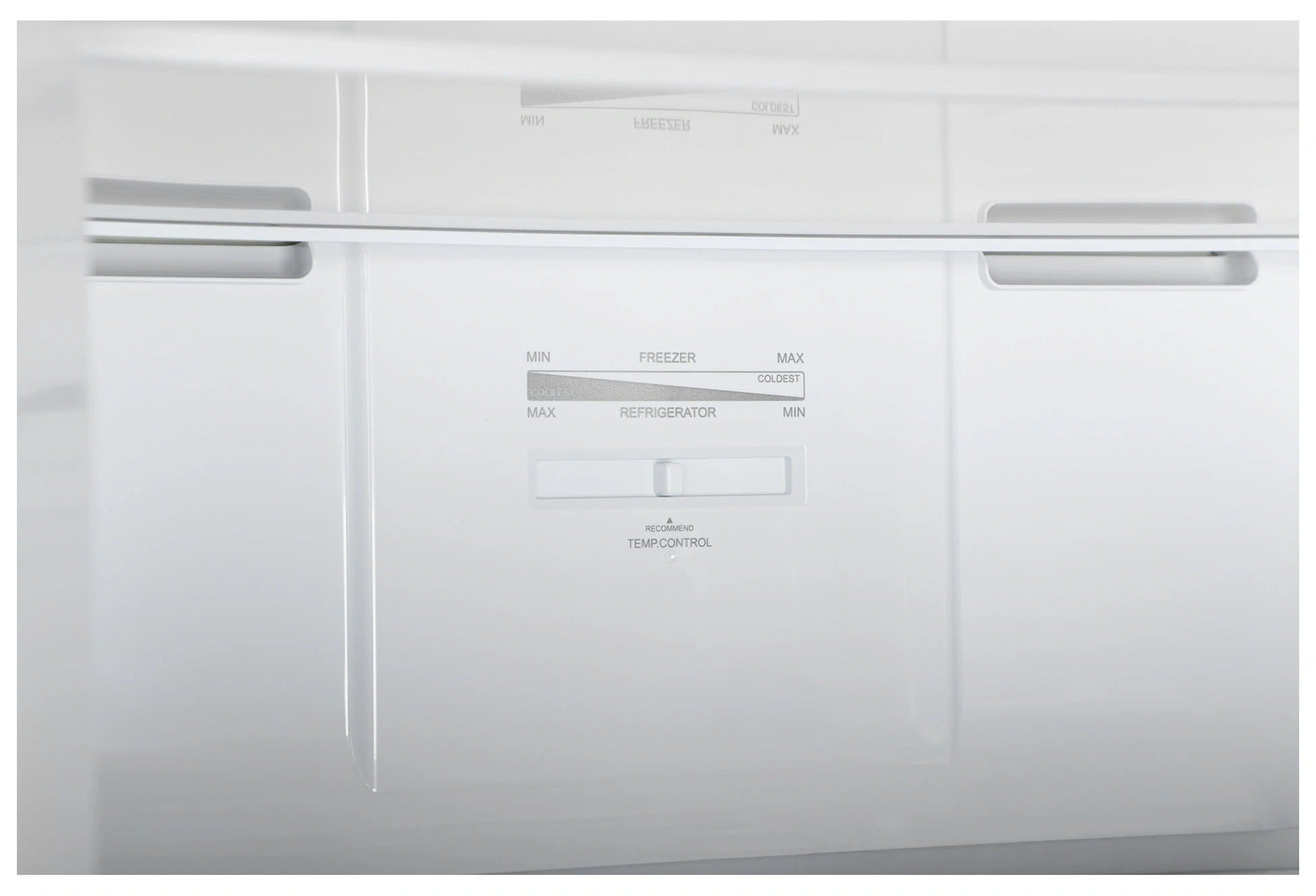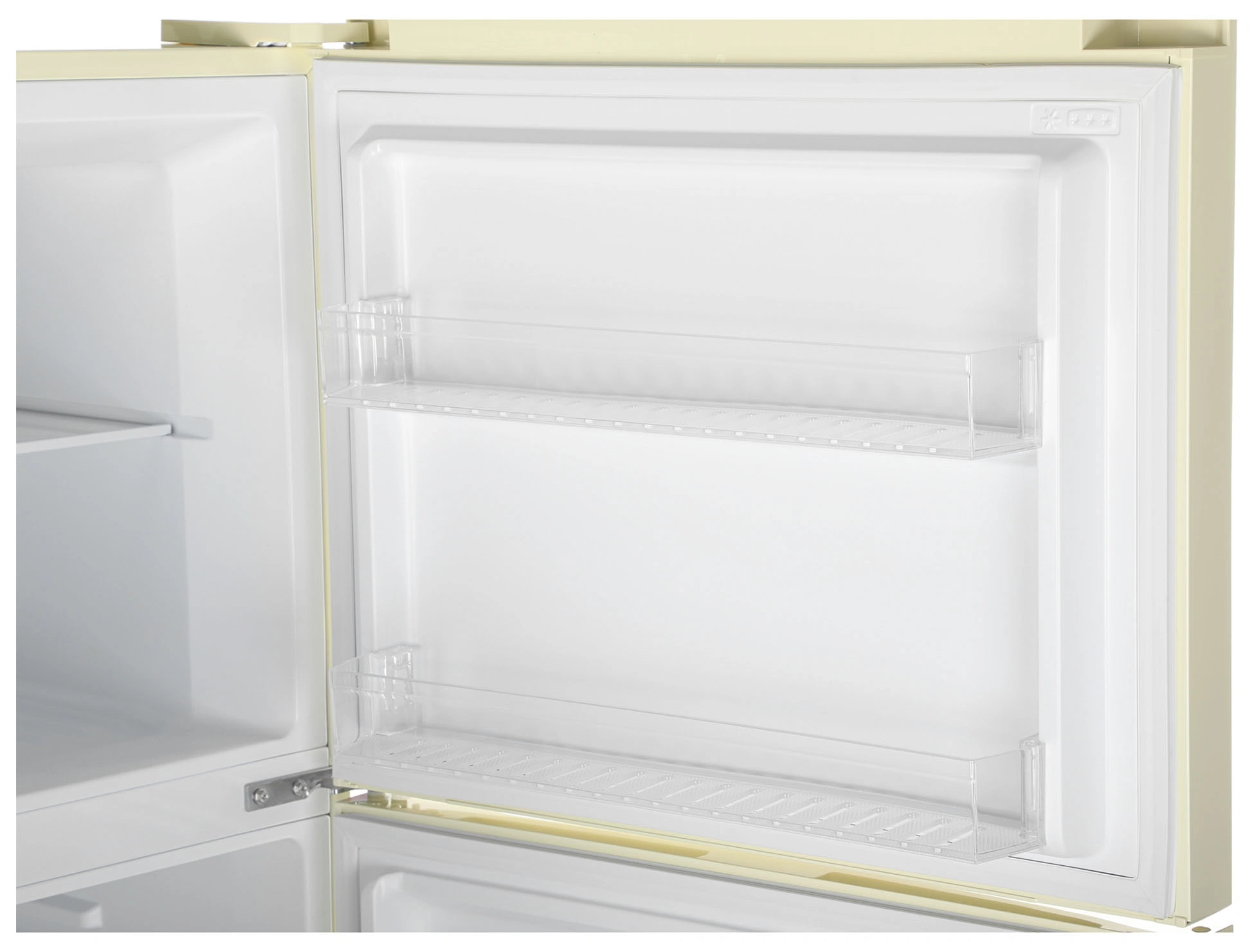 Прибор имеет два отсека, которые охлаждаются одним компрессором. Верхний предназначен для заморозки, а нижний для охлаждения. Оба они используют специальную систему No Frost, которая эффективно борется с образованием снега и наледи на стенках и дверцах. Хозяйки по достоинству оценят то, что девайс вообще не надо размораживать. При этом данная модель работает с минимальной громкостью 43 дБ. Это стало возможным благодаря качественному хладагенту R600a – он не создаёт лишнего давления и, соответственно, производит мало шума.
