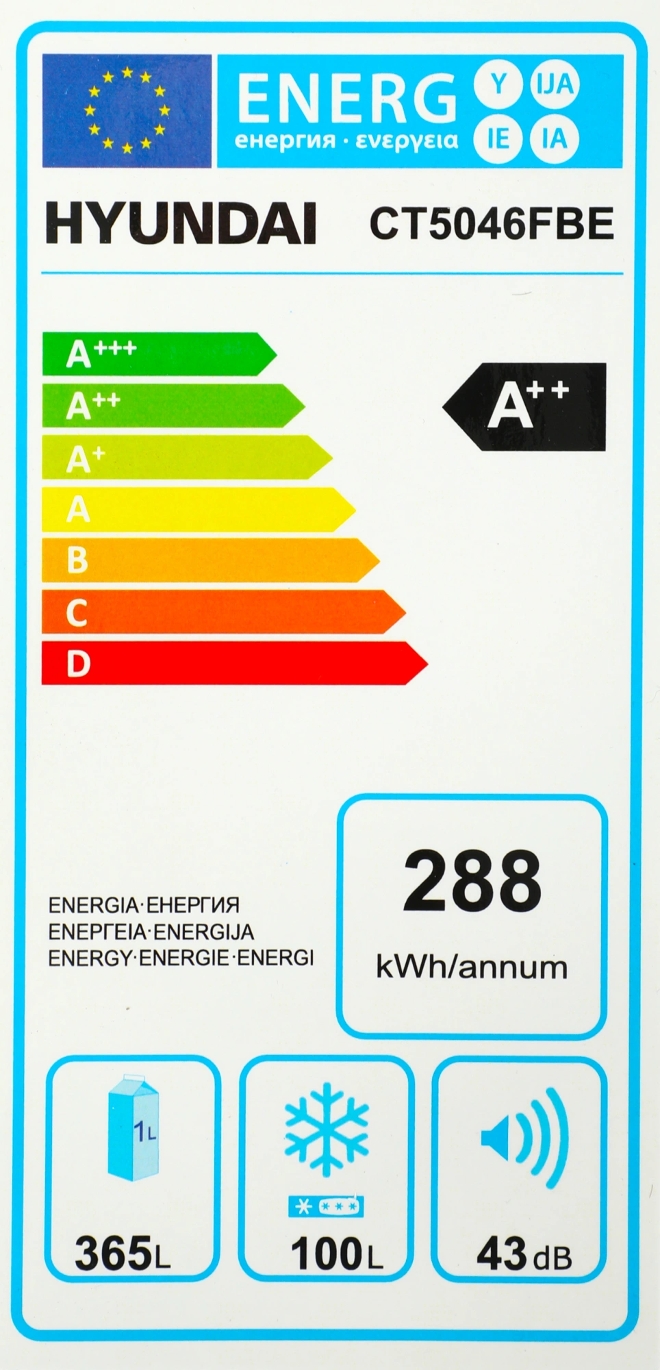 Hyundai CT5046FBE оснащён функциями суперзаморозки и суперохлаждения, чтобы как можно лучше сохранять свежесть продуктов. При этом он потребляет всего 288 кВт*ч/год, что соответствует классу A++ и значительно экономит счета за электричество. При отключении питания температура внутри камер будет поддерживаться до 20 часов.