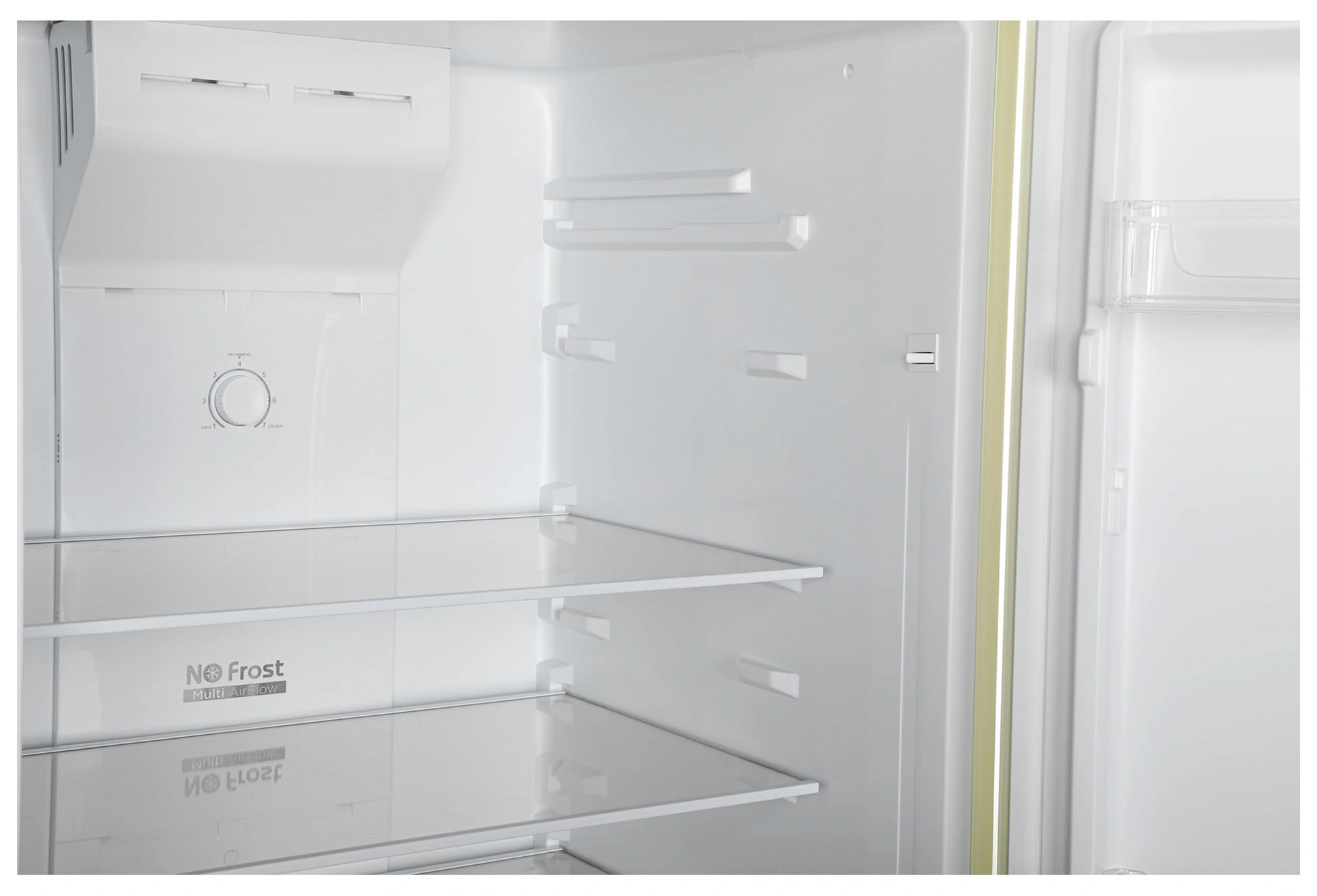 Внутренний полезный объём холодильника составляет 365 л, которые можно разделить пятью полками из закаленного стекла в нужной конфигурации. Морозилка вмещает до 100 л объёма и оборудована единственной полкой и ящиком. Материал, из которого сделаны полки, устойчив к повреждениям, перепадам температур, а также за ним легко ухаживать.