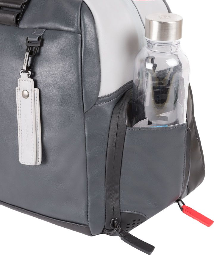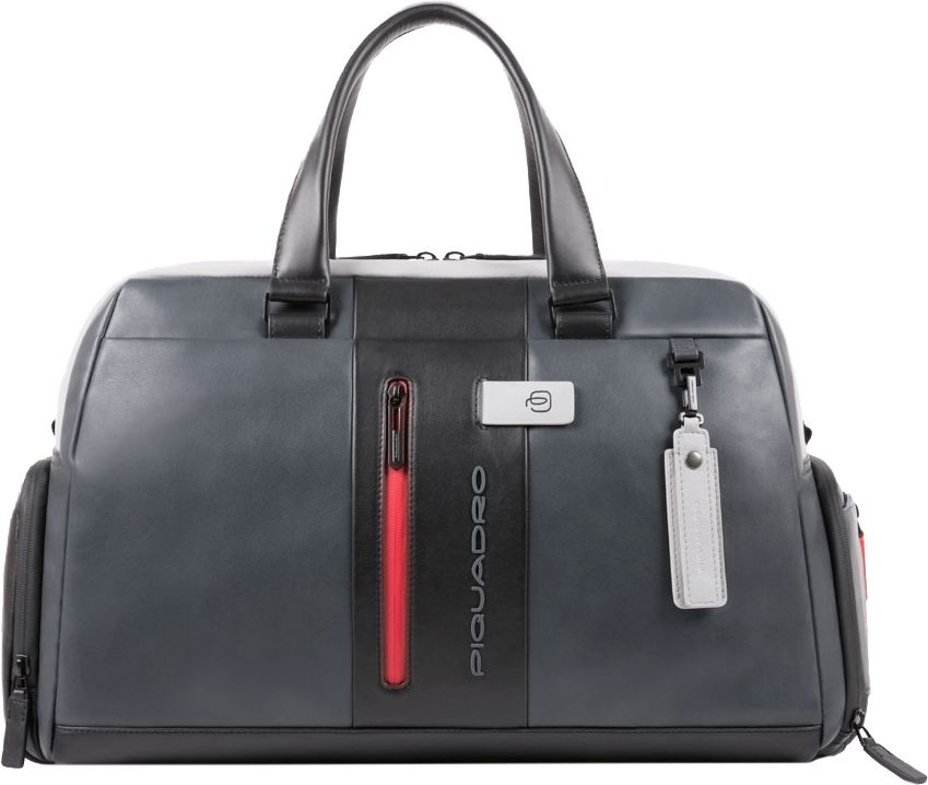 Дорожная сумка из мягкой телячьей кожи с черненой матовой фурнитурой из новой коллекции Piquadro URBAN. Одно большое отделение с отсеком для обуви, карман для телефона и бутылки, крепление на чемодан, съемный плечевой ремень.