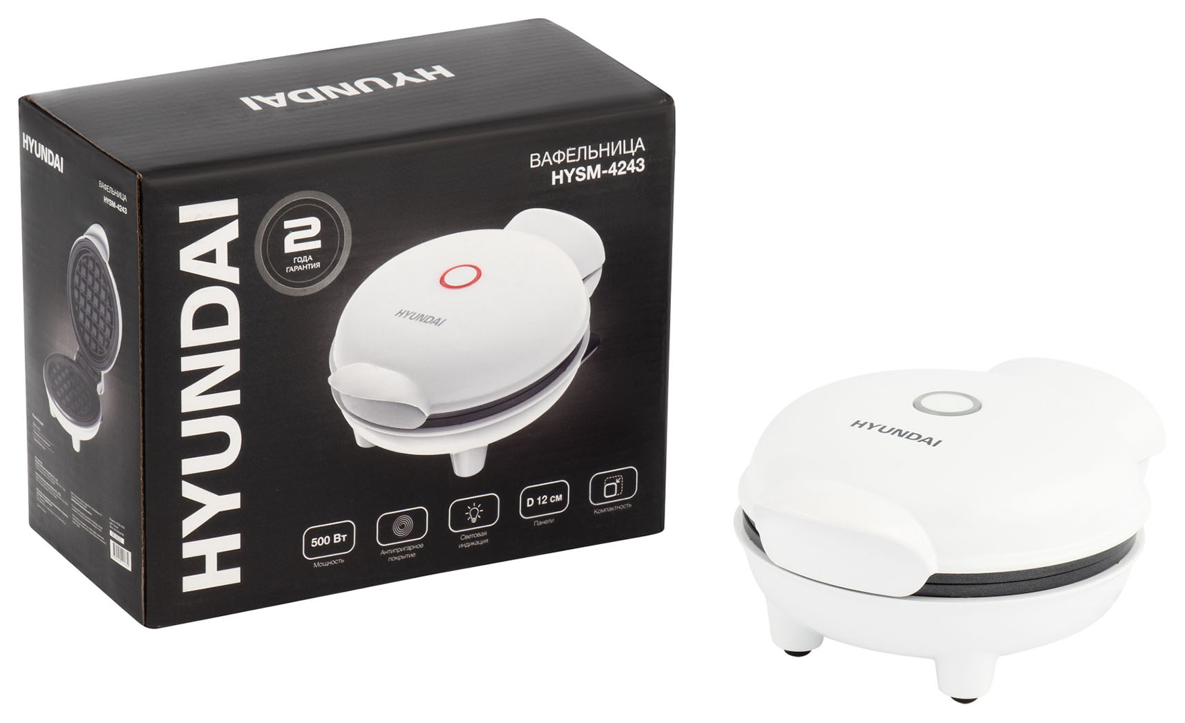 Мощность прибора – 500 Вт, благодаря этому на приготовление вафли ему требуется около пяти минут (точное время зависит от состава теста, который вы подготовите). Удобный индикатор включения покажет, работает ли устройство, а ещё один сигнал отображает, готова ли Hyundai HYSM-4243 к приготовлению и достаточно ли разогрелась. Для начала работы не нужно нажимать никаких кнопок, достаточно просто воткнуть вилку в розетку и залить заранее подготовленное тесто в соответствующее отделение, когда панели прогреются до рабочей температуры. Их диаметр составляет 12 сантиметров – это классический размер готовых вафель.