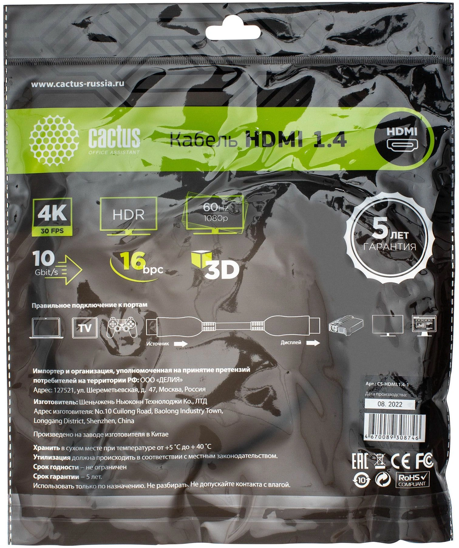 Кабель аудио-видео Cactus CS-HDMI.1.4-1