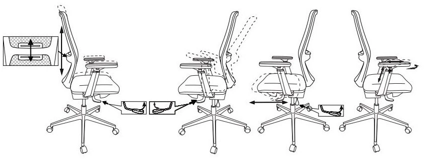 высоты (газлифт), высоты подголовника, глубины сиденья, положения подлокотников, поясничной области