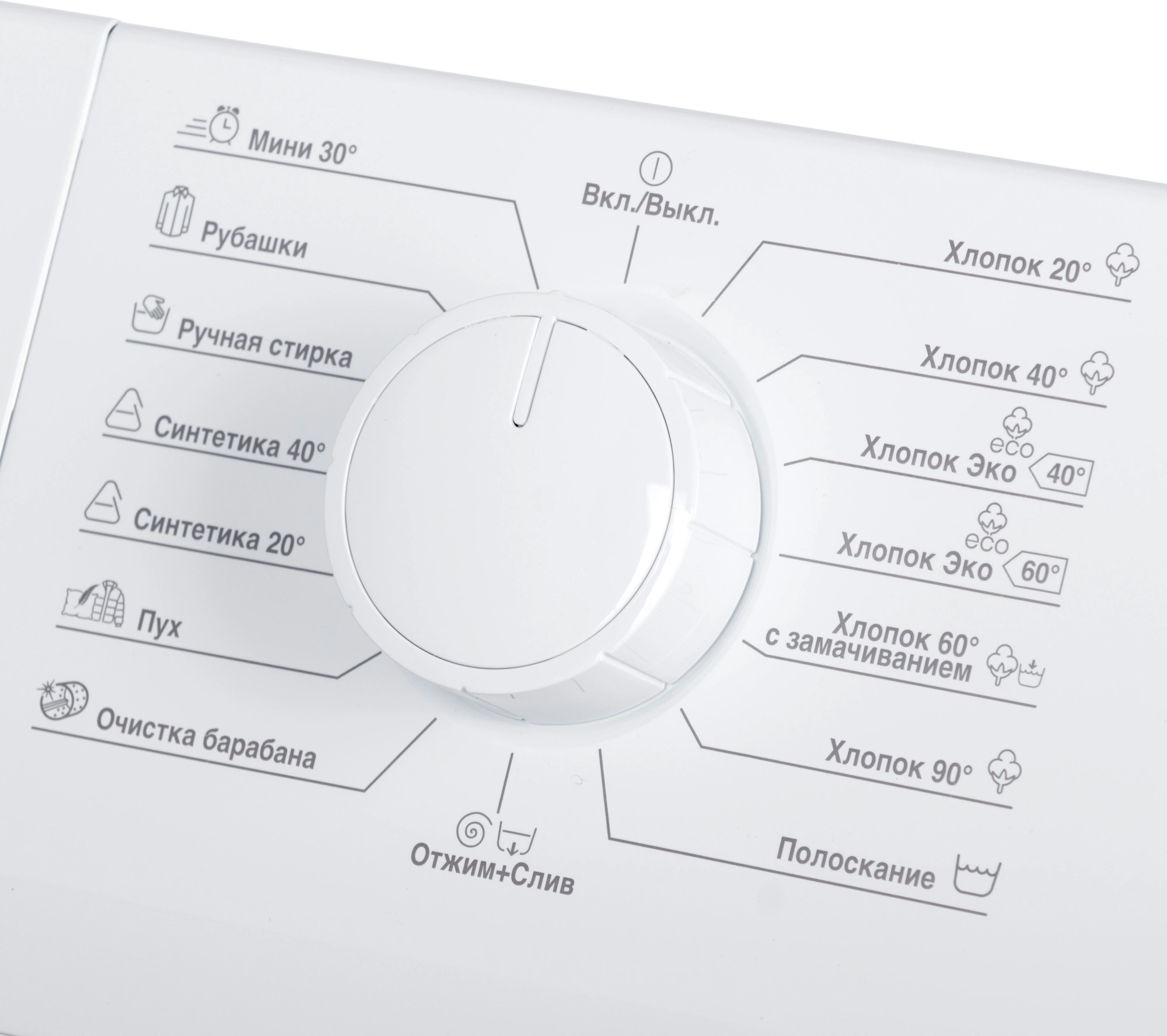 Хлопок 20C, 40C, 90C, Хлопок с замачиванием 60C, Хлопок Эко 40C, 60C, Синтетика 20C, 40C, Мини 30°, Ручная стирка, Рубашки, Пух, Очистка барабана, Полоскание, Отжим+Слив