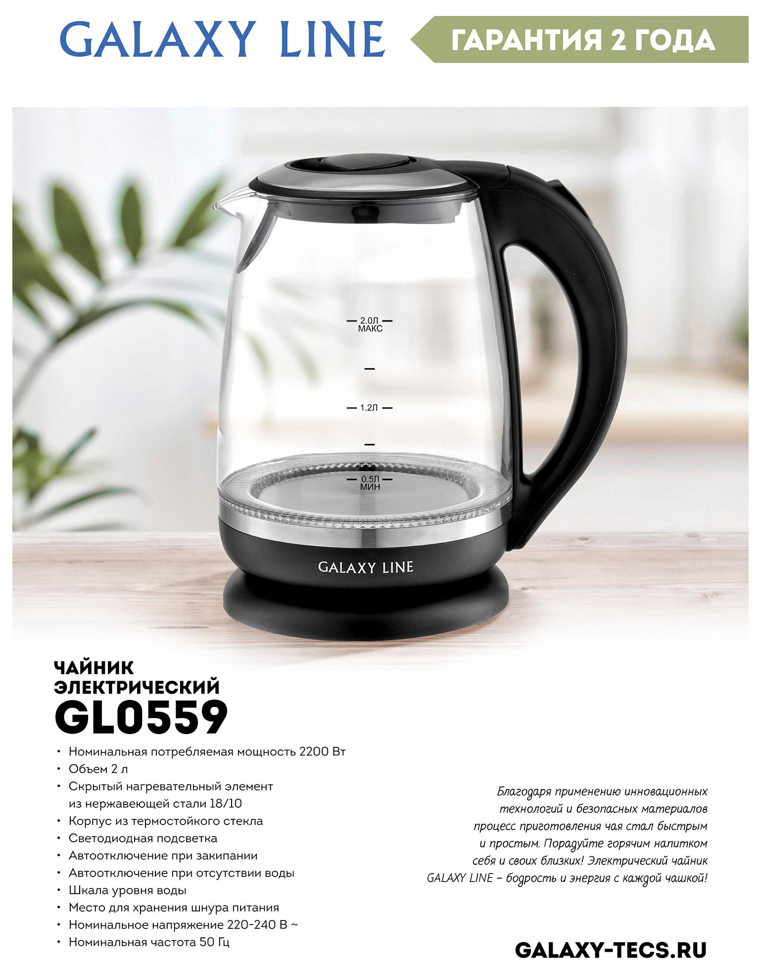2л. 2200Вт черный корпус: стекло (ГЛ0559Л)