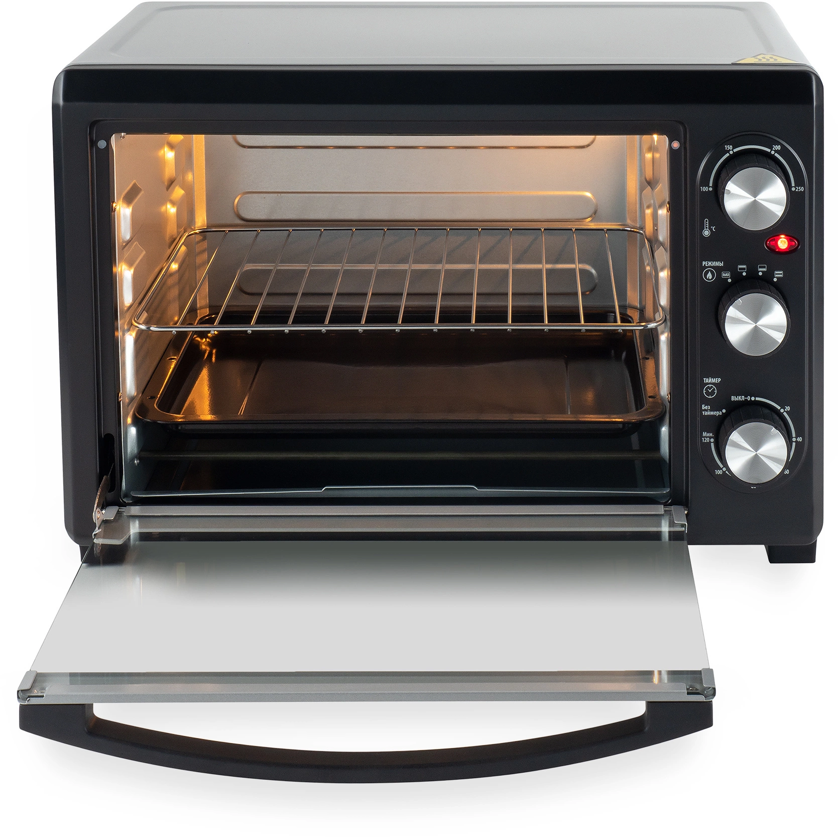 Внутренний объём мини-печи – 26 литров. Этого пространства хватит даже для блюд, рассчитанных на большую семью из нескольких человек. Следить за приготовлением пищи в реальном времени можно через стеклянную дверцу устройства. Стекло не только даёт полный обзор, но и отлично удерживает жар.