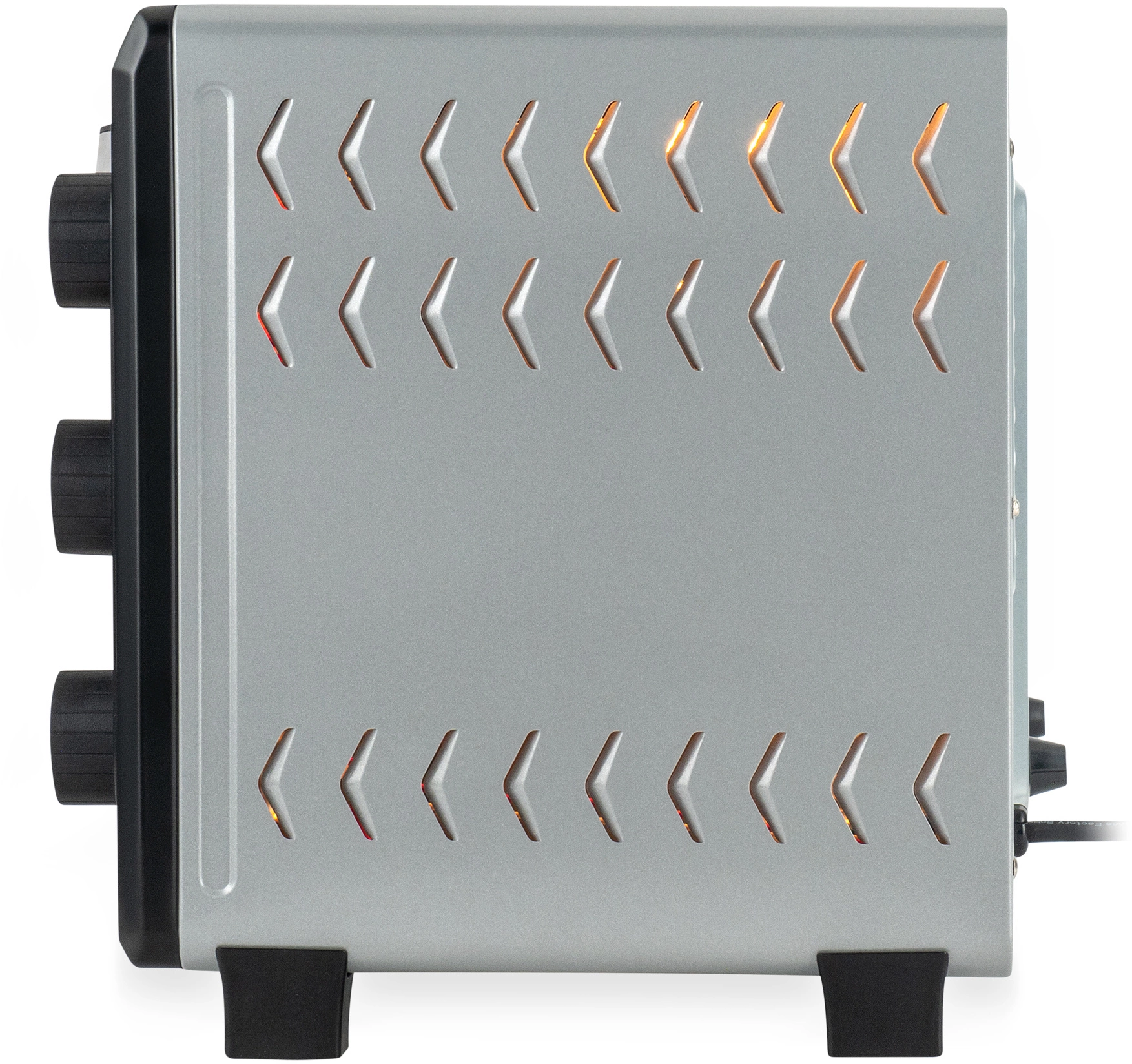 Прибор по габаритным размерам больше напоминает микроволновую печь, чем духовку. Он помещается на стандартную столешницу и благодаря этому превосходно впишется в кухню любого размера. Его корпус окрашен в стильный металлик с добавлением чёрного – такой дизайн универсален и подходит под любой интерьер.
