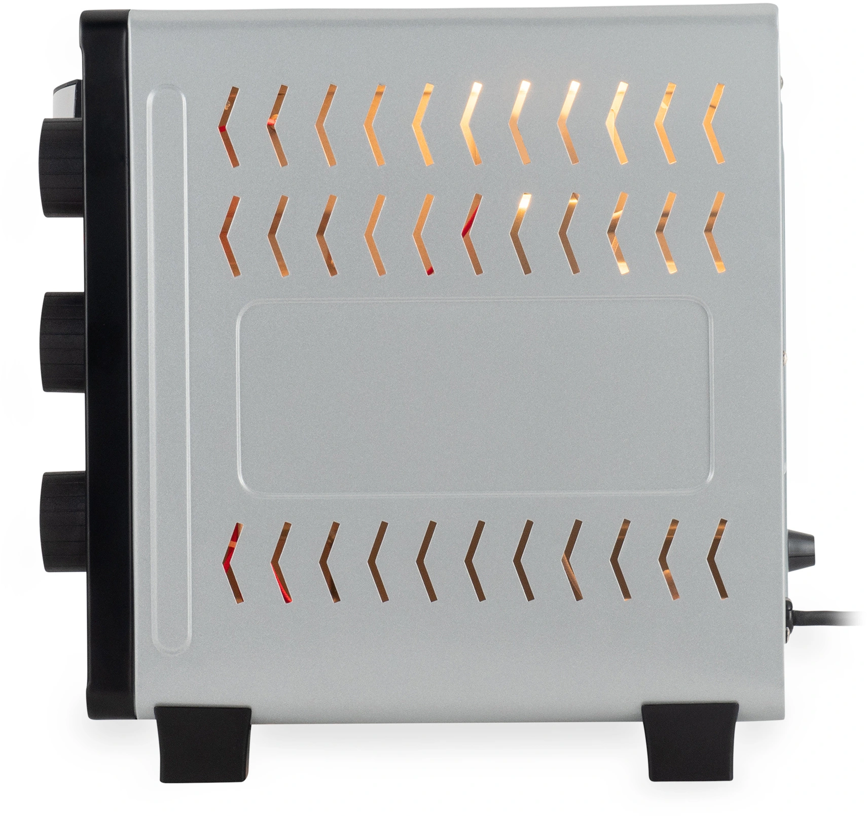 Устройство может готовить с использованием нижнего или верхнего жара, а также обоих сразу для равномерной термической обработки с двух сторон. Также настраивается в нём и температура с максимально возможной до 250 градусов. Каждому из этих параметров соответствует свой отдельный круговой переключатель на лицевой панели, а третий отвечает за настройку таймера (крайнее значение – 120 минут). Все они не нагреваются, когда прибор активен.