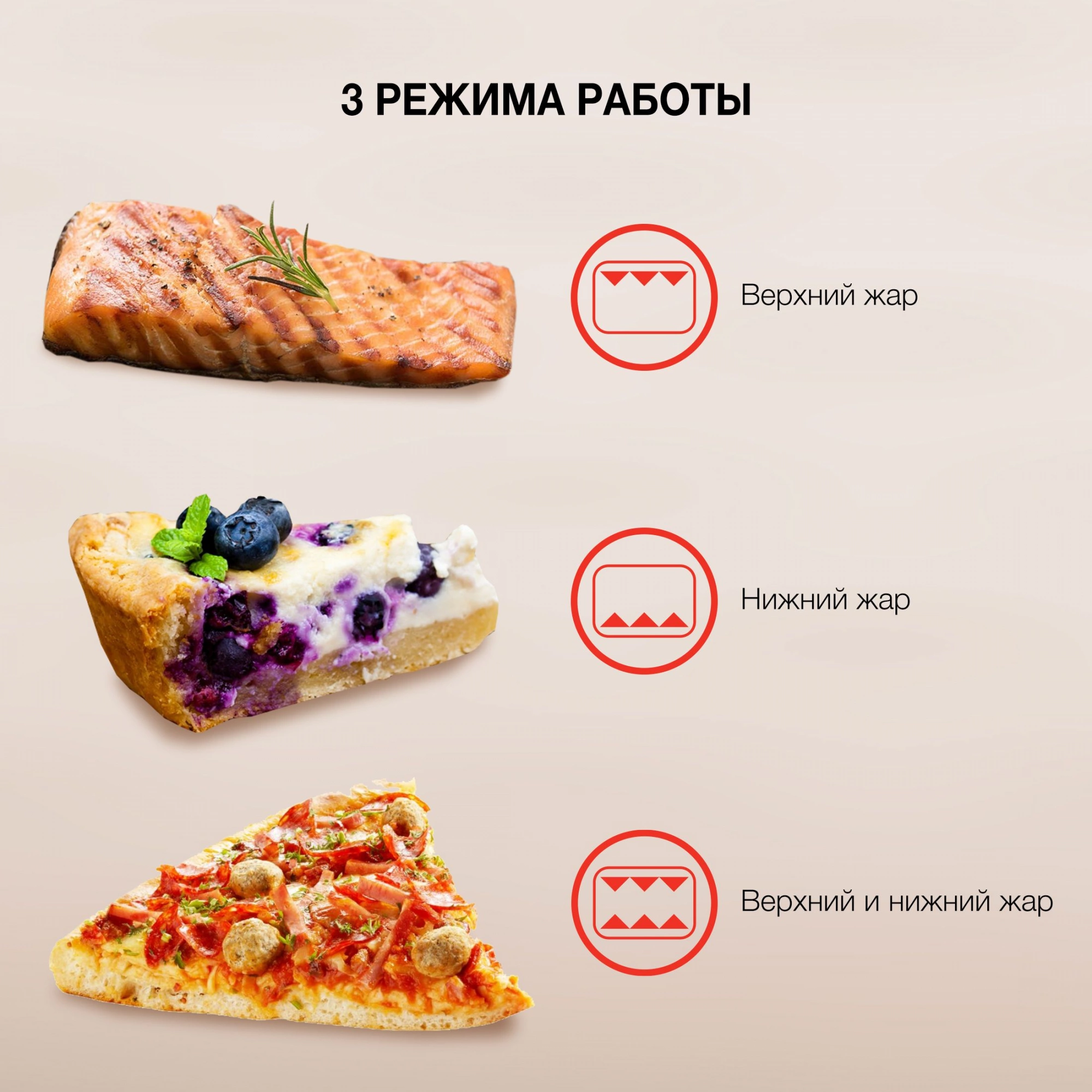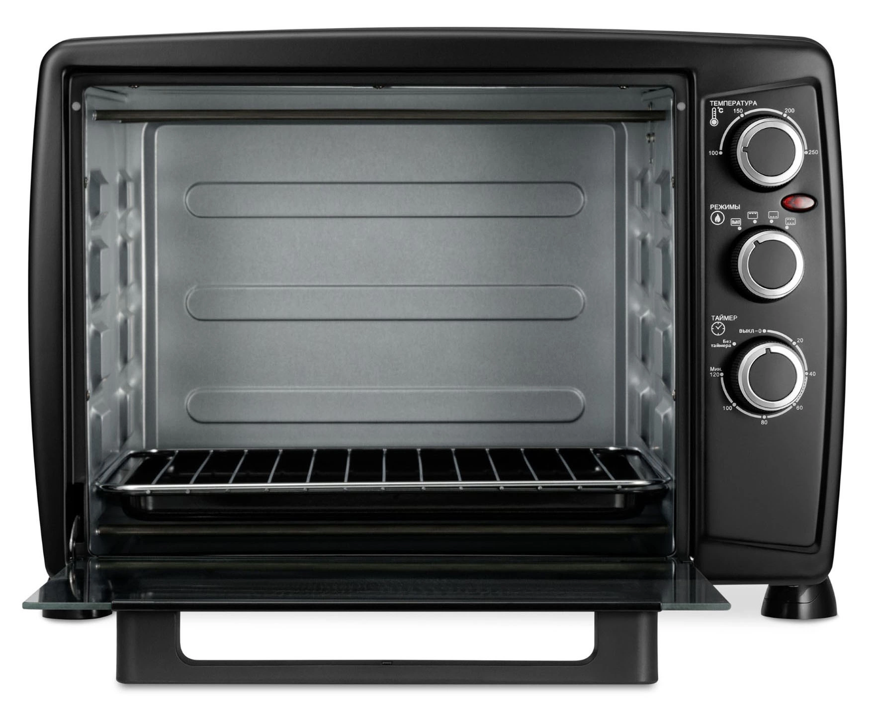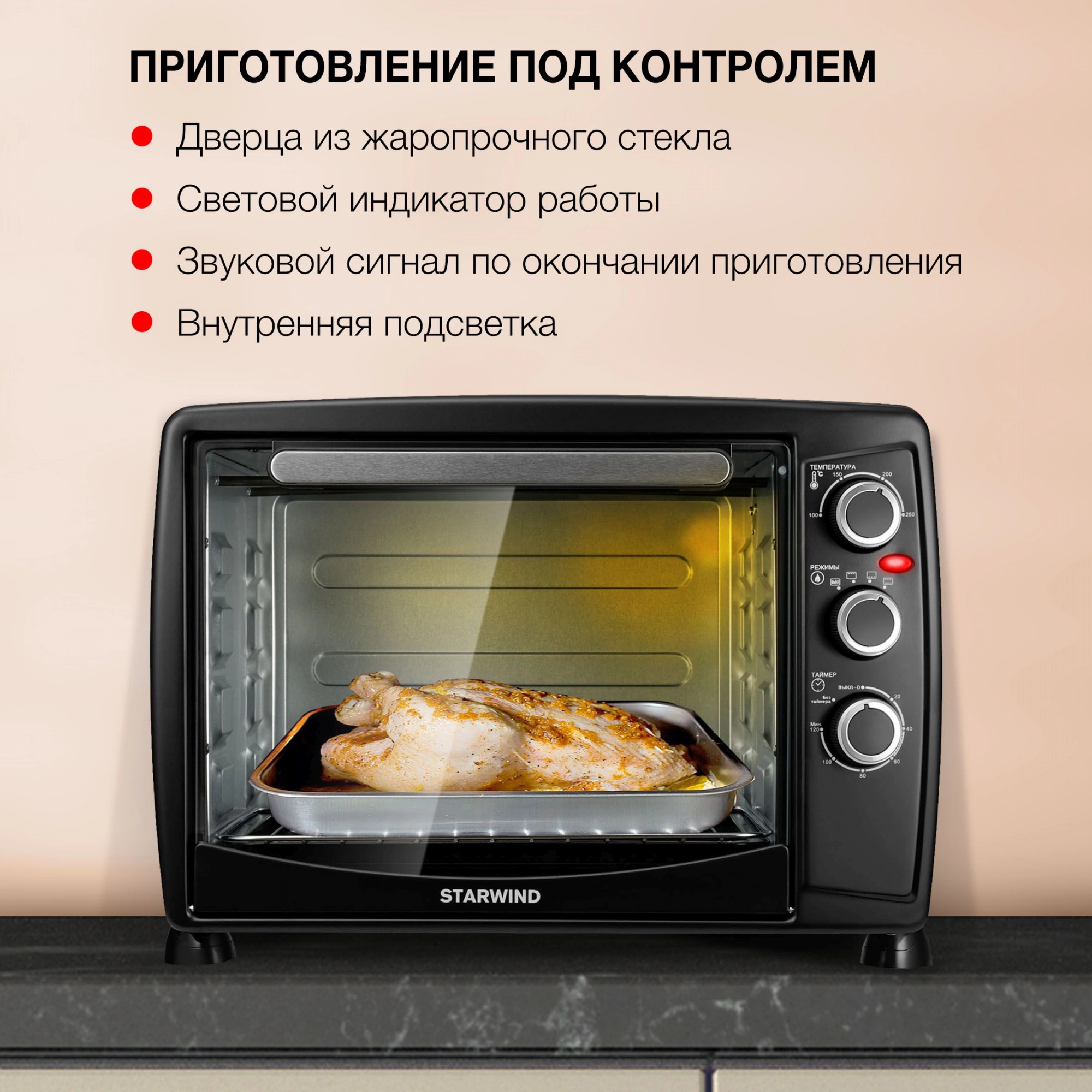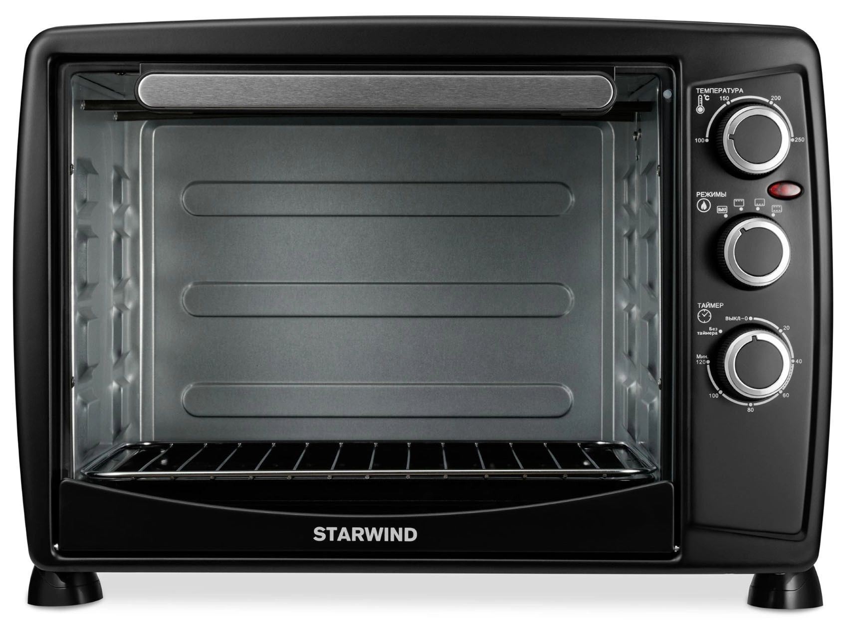 Вместительная мини-печь StarWind SMO2045 черного цвета обладает объемом 35 литров. За счет этого в ней можно готовить пищу для большой компании. Прибор порадует простым управлением и предсказуемым результатом приготовления. Управлять устройством можно при помощи механических ручек круглой формы. Настройка температуры осуществляется в диапазоне 100-250 градусов. Бытовая техника оснащена 3 режимами, каждый из которых обеспечивает качественное приготовление пищи в соответствии с заданной пользователем температурой. В комплекте имеются противень, съемная решетка и съемная ручка для поддона.