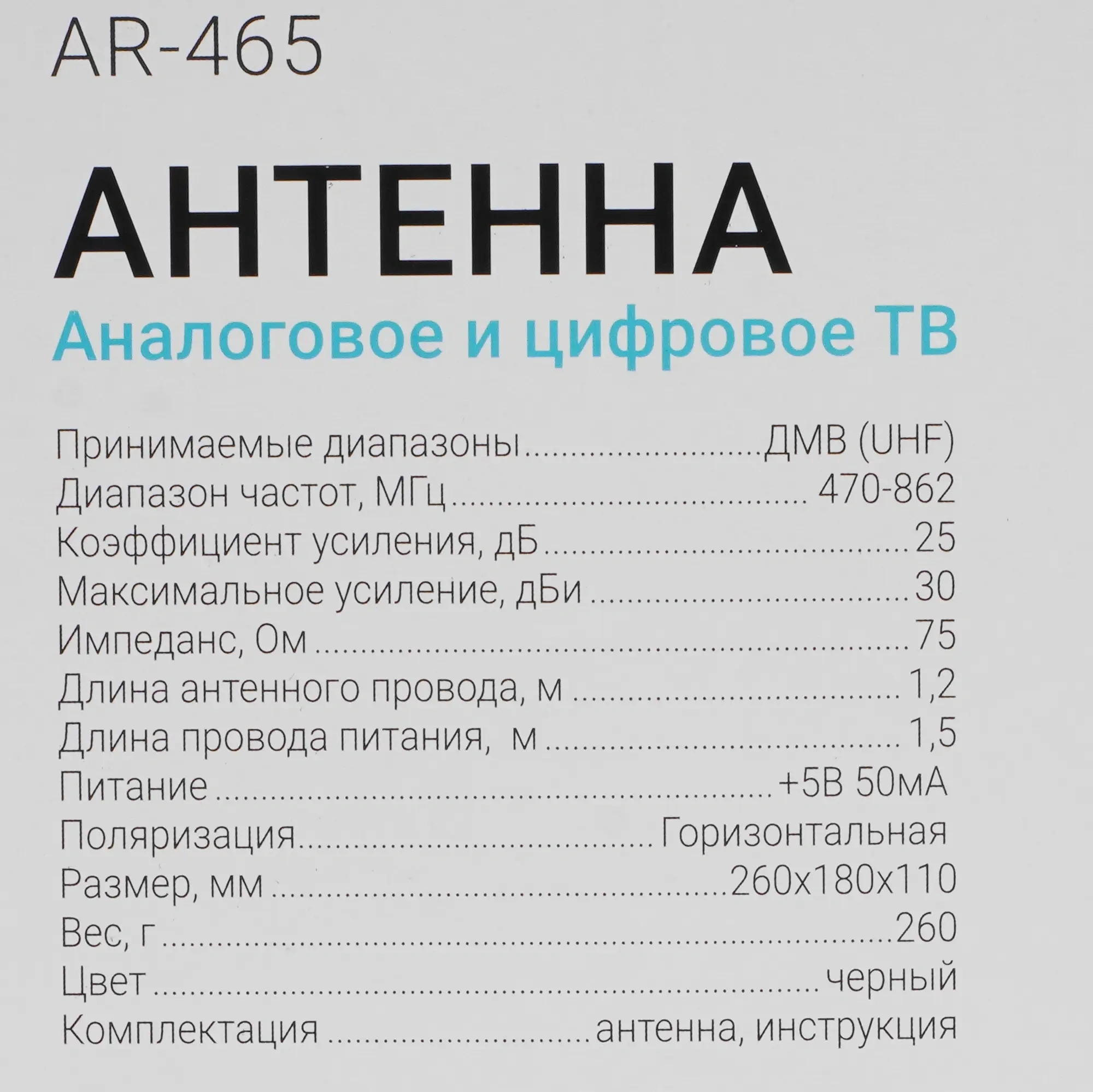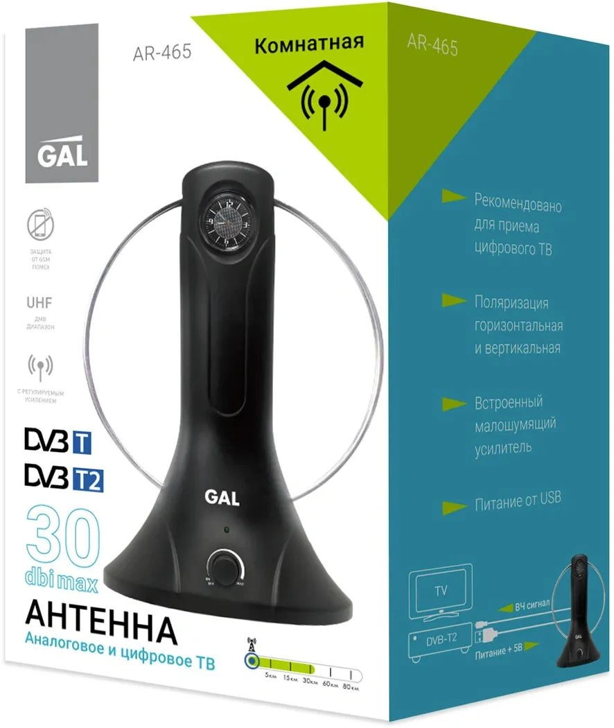 Рекомендовано для приема цифрового ТВ, Поляризация горизонтальная и вертикальная, Встроенный малошумящий усилитель, Питание от USB, Встроенные часы.