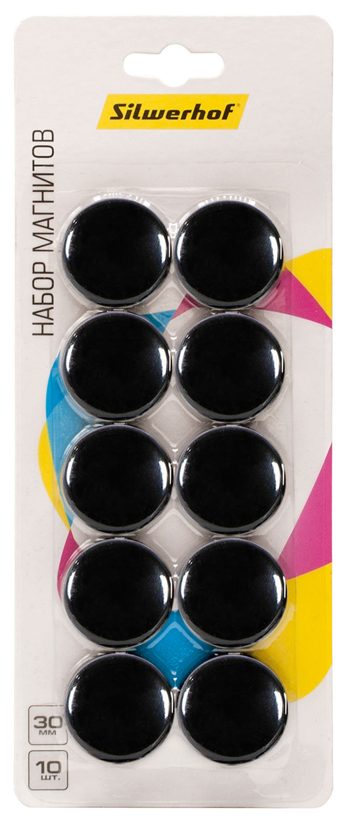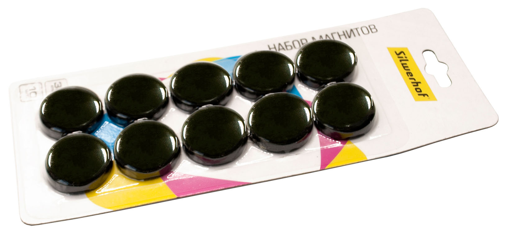 Набор магнитов Silwerhof Classic надежно удерживается на любой железной или стальной поверхности. Прекрасно подойдет для магнитных поверхностей досок, флипчартов Silwerhof. Диаметр магнита составляет 30 мм. Магниты круглой формы выполнены из пластика черного цвета. В комплекте 10 штук.