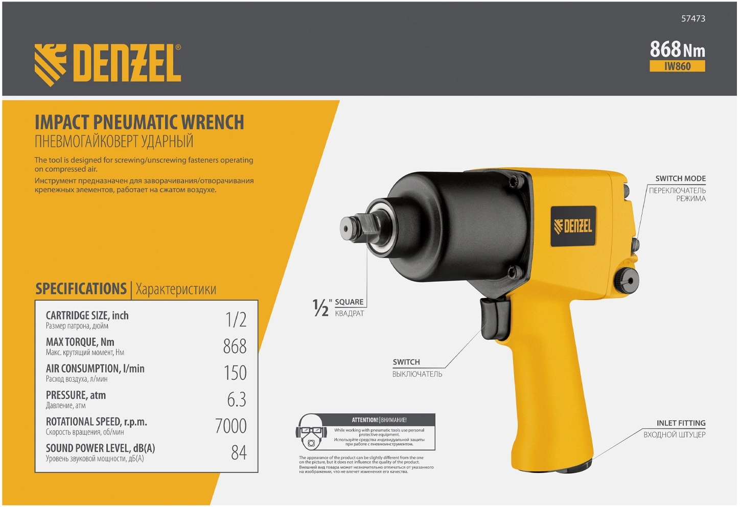 Размер патрона, дюймы: 1/2; Воздушный патрубок, дюйм: 1/4; Уровень звуковой мощности, дБ(А): 84.