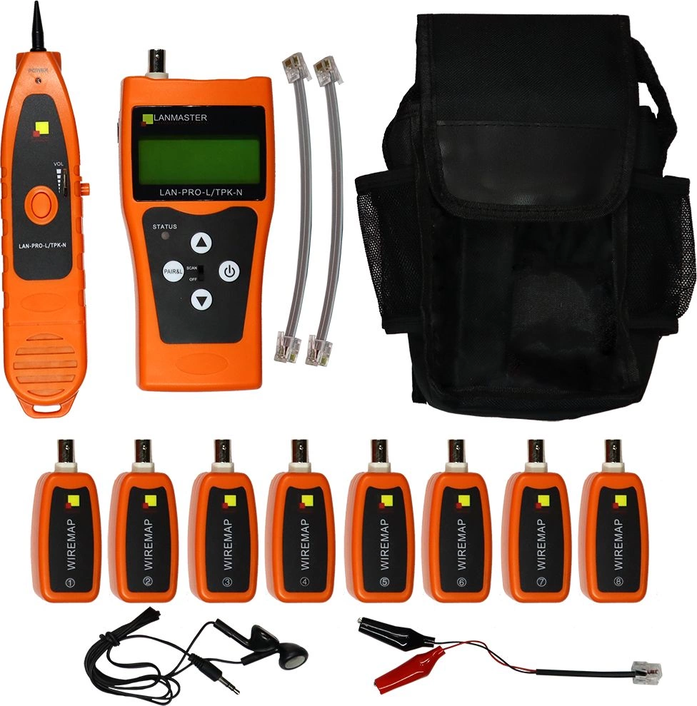 Главный блок, индуктивный щуп, ответная часть - 8 шт., батарея 6F22 9V - 2 шт., кабель RJ45 - RJ45, кабель RJ11 - RJ11, кабель RJ11 - крокодилы, наушники, сумка-чехол на ремне, инструкция по эксплуатации.