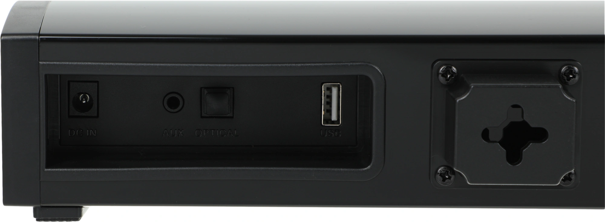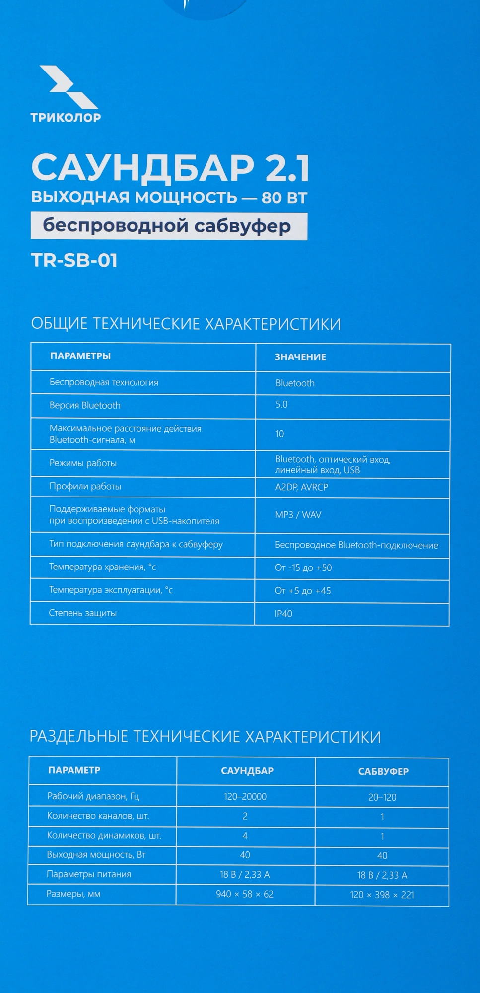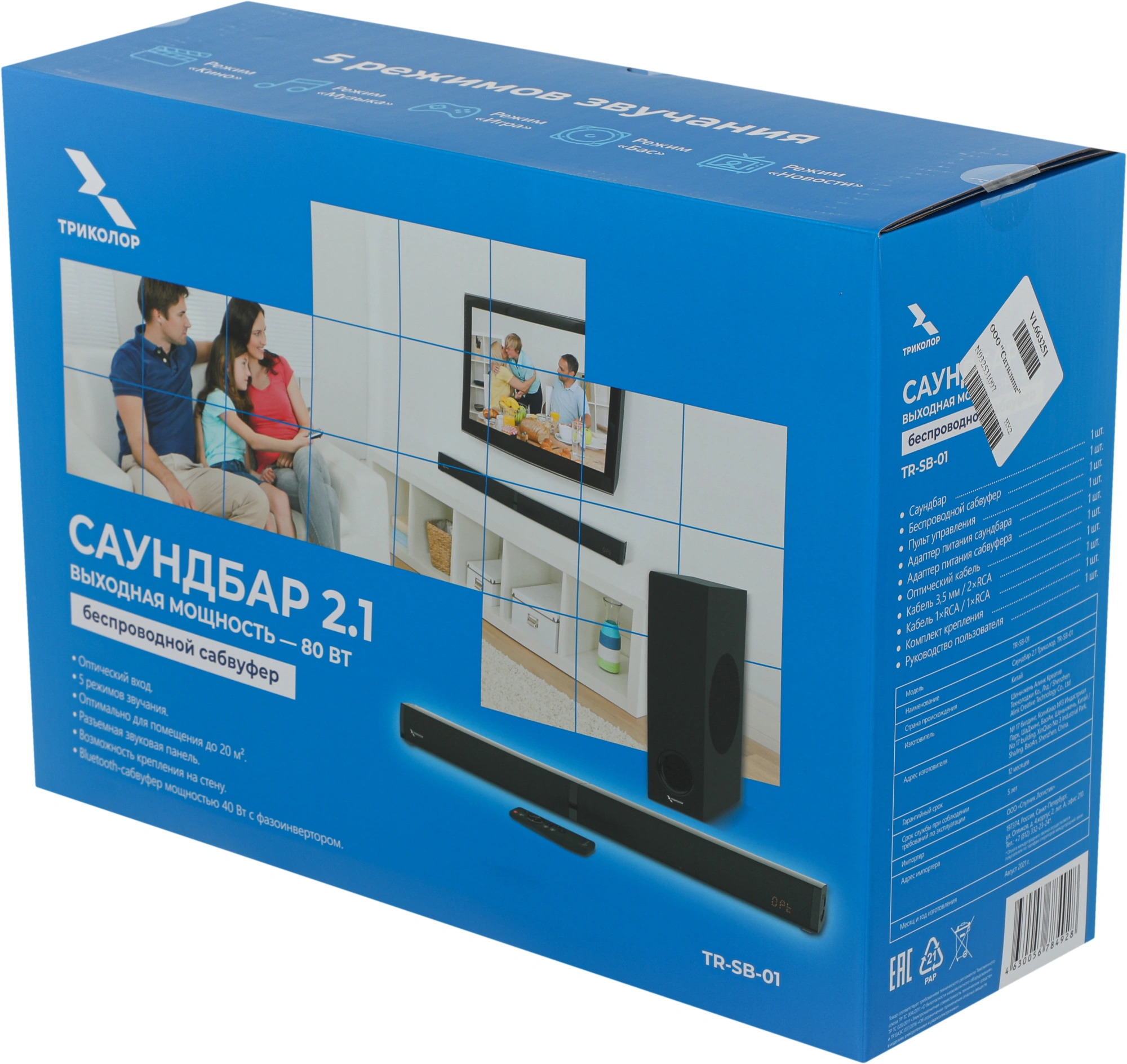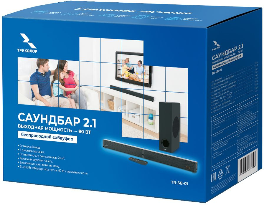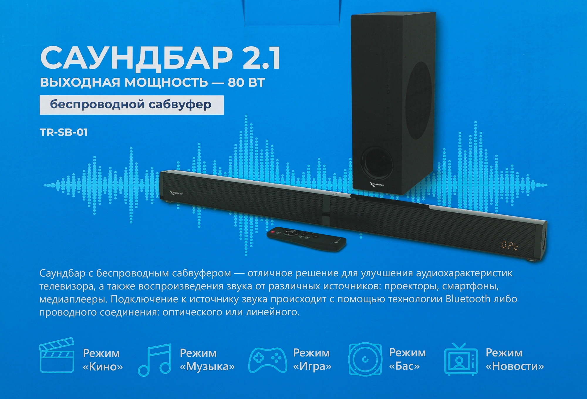 Саундбар с беспроводным сабвуфером для улучшения аудиохарактеристик телевизора, а также воспроизведения звука от различных источников: проекторы, смартфоны, медиаплееры. Подключение к источнику звука происходит с помощью Bluetooth, проводного оптического или линейного соединения.