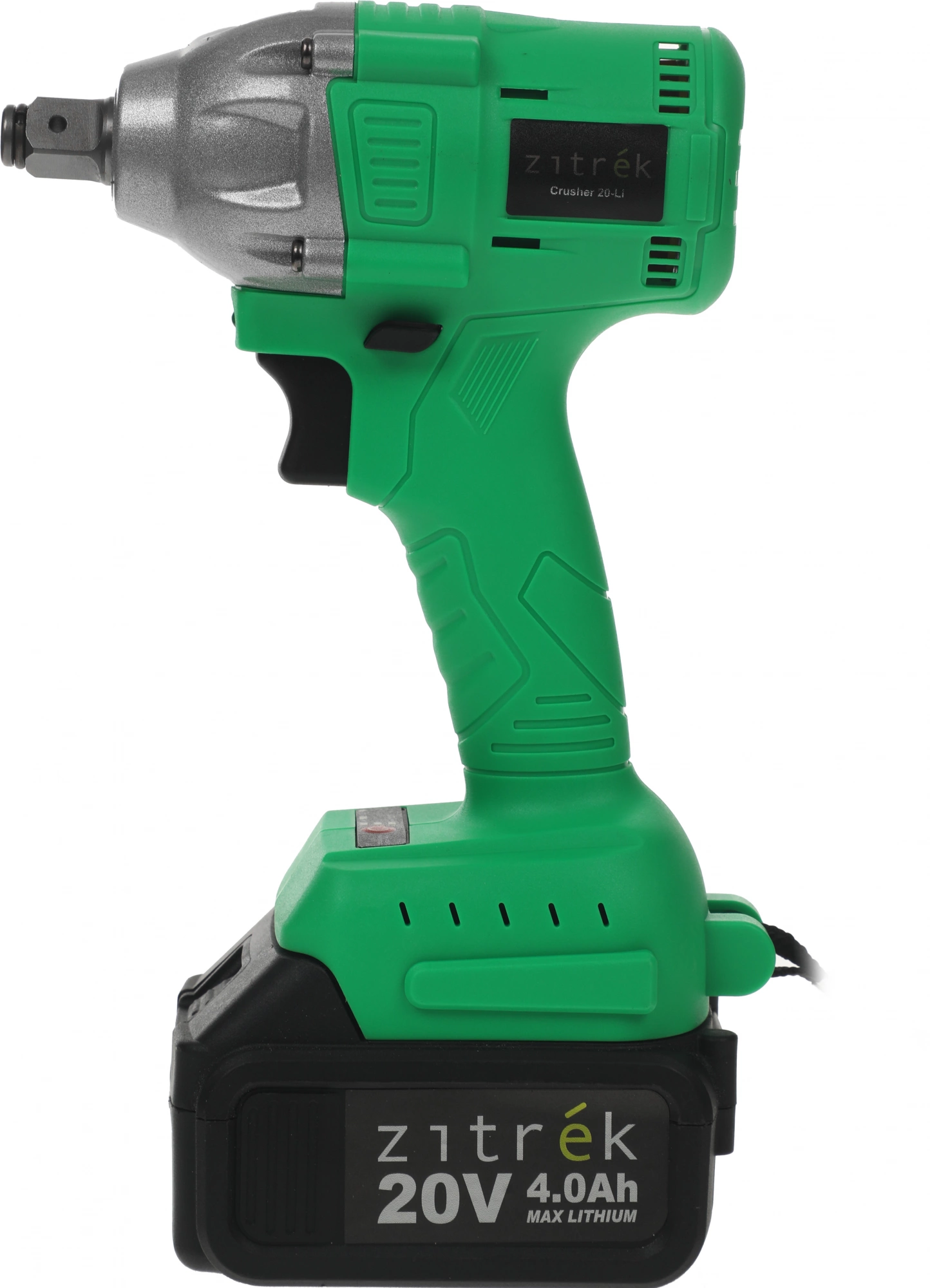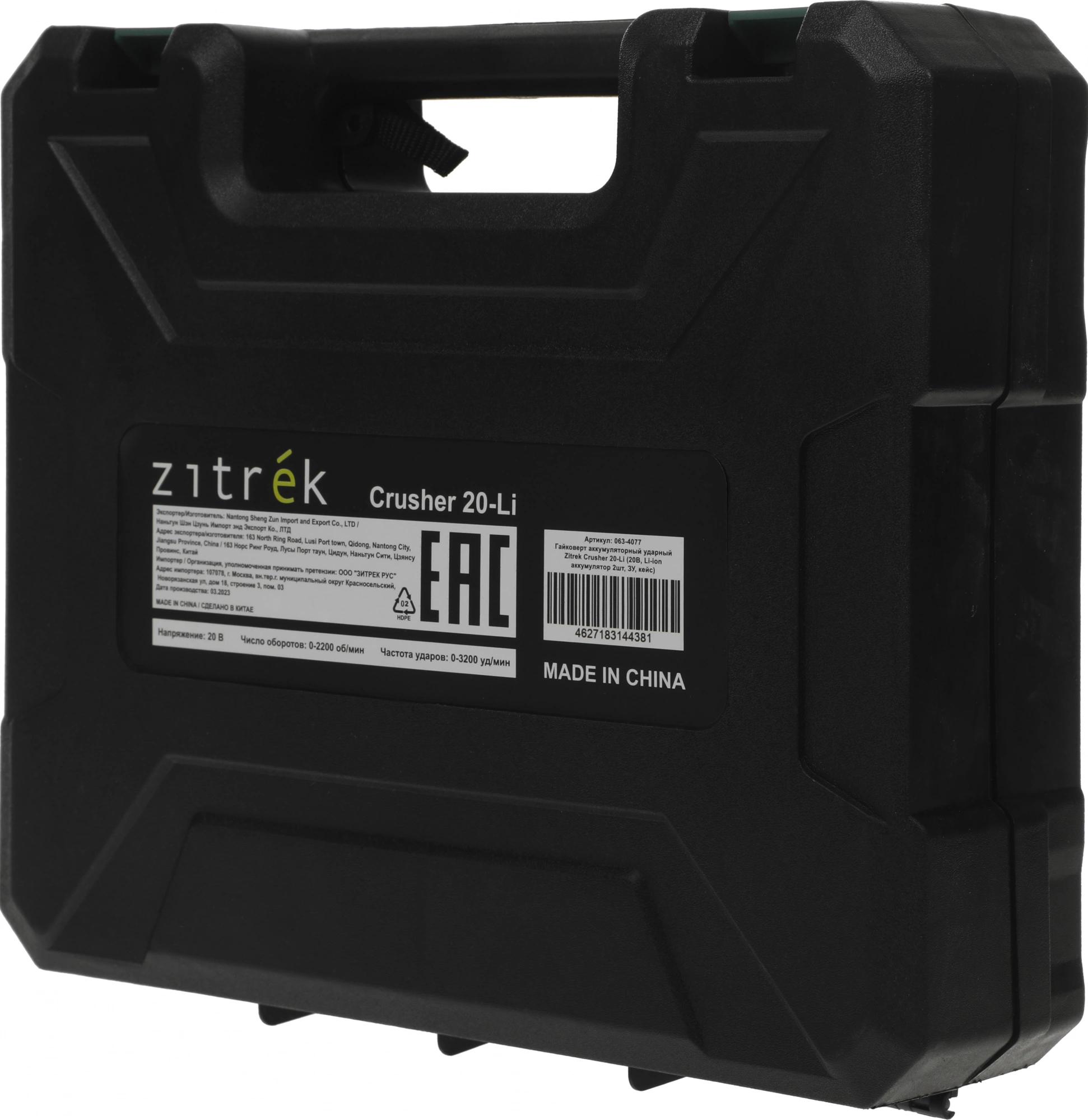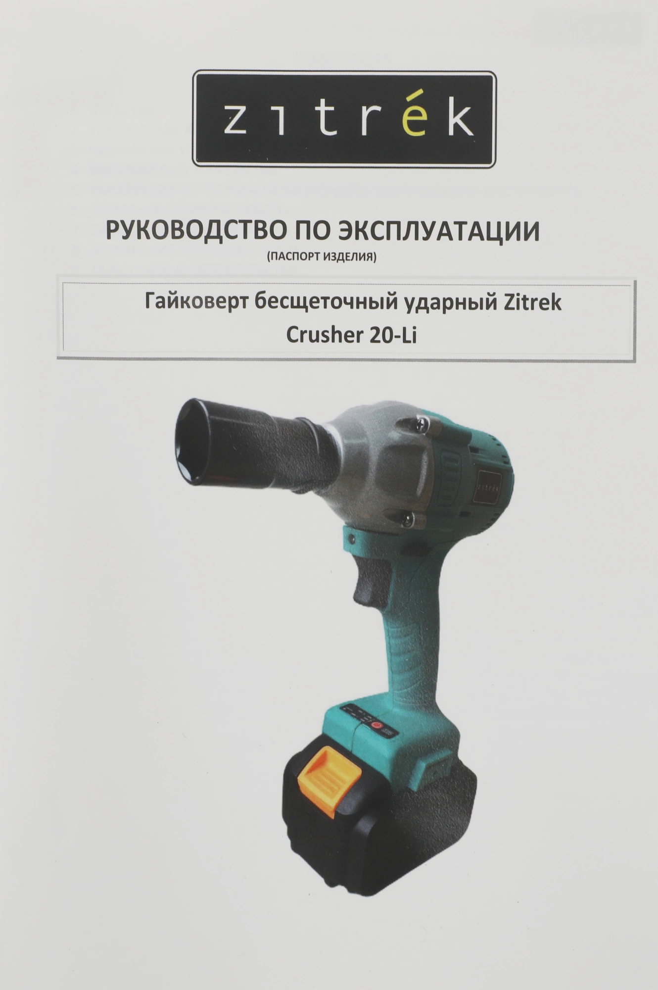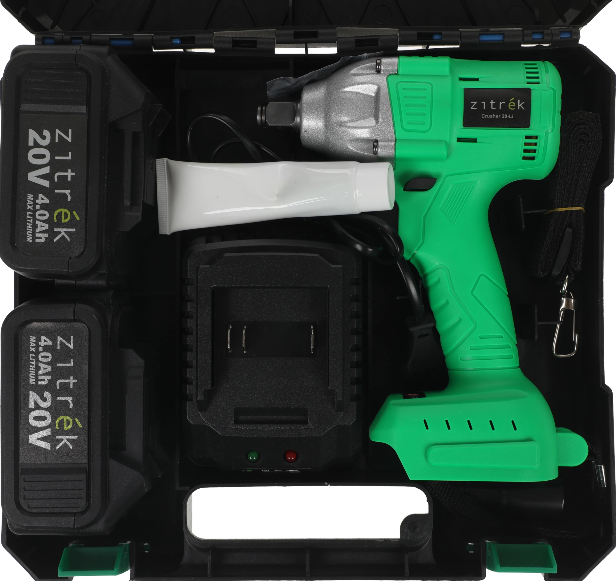 Гайковерт аккумуляторный ударный Zitrek Crusher 20 Li, литиевый аккумулятор увеличенной емкости 4 Ач - 2 шт., головка накидная 22 мм. с системой фиксации на патроне, зарядное устройство, руководство по эксплуатации, кейс пластиковый.