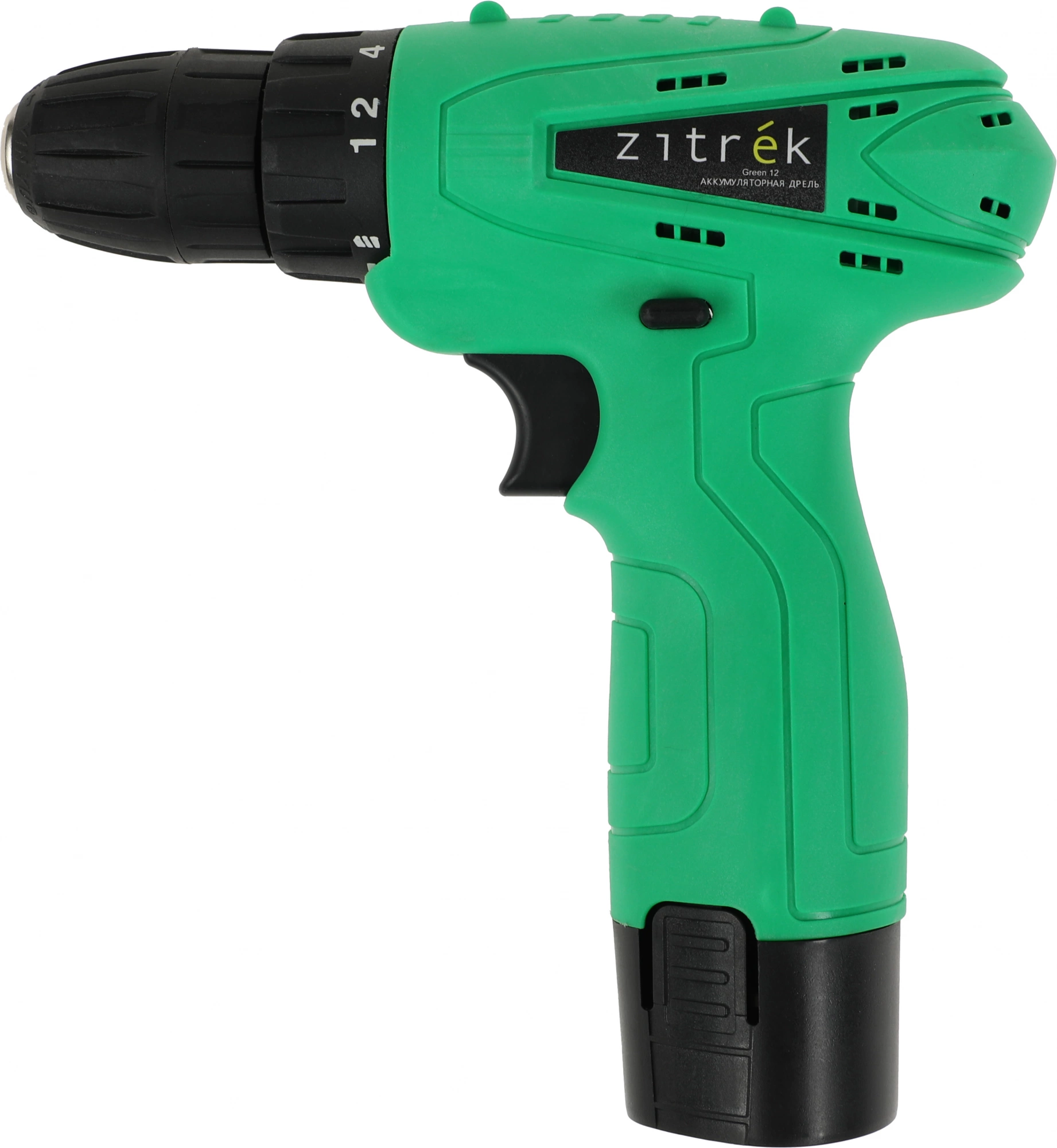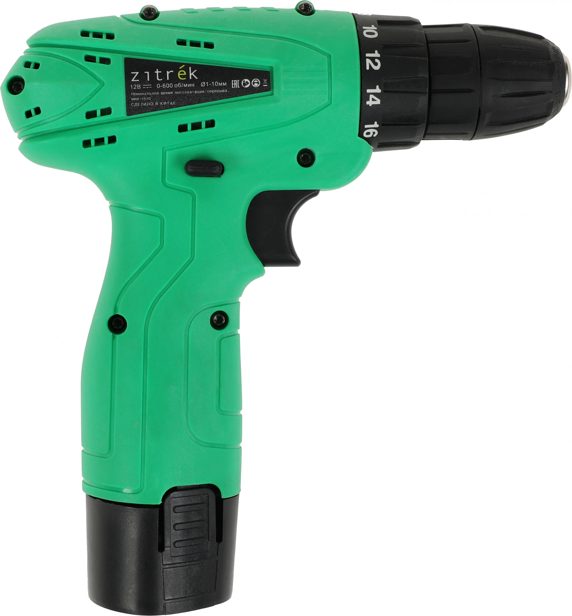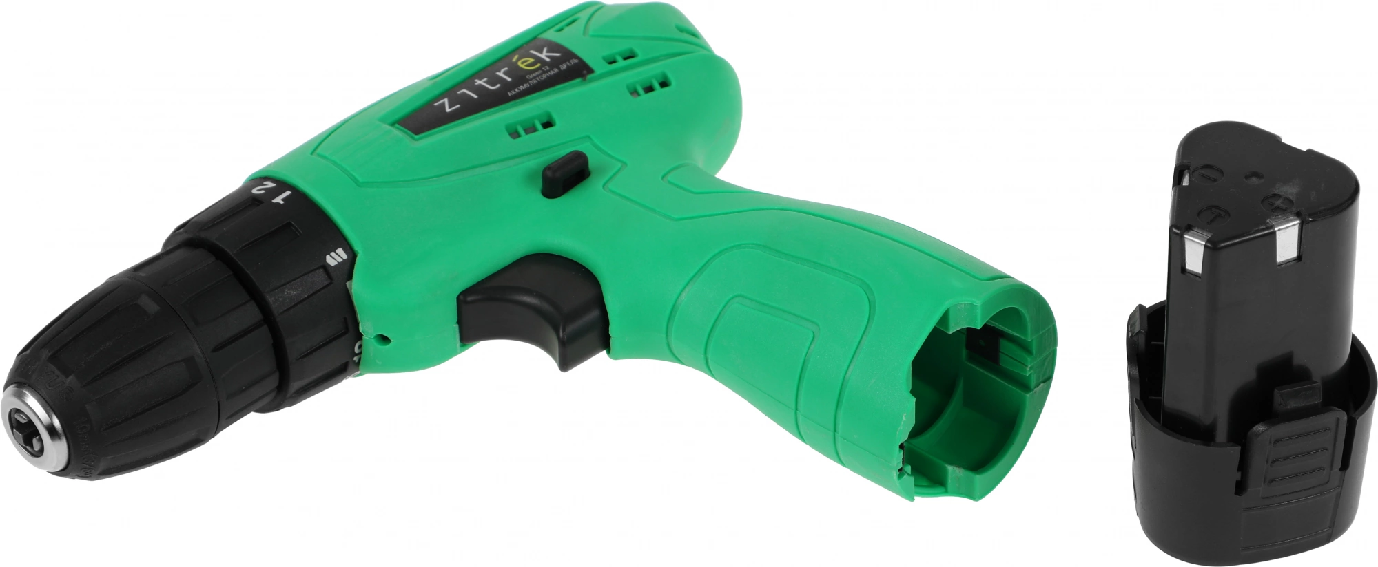 Дрель-шуруповерт аккумуляторная Zitrek Green 12, литиевый аккумулятор 1,5 Ач, двухсторонняя бита, зарядное устройство, руководство по эксплуатации.