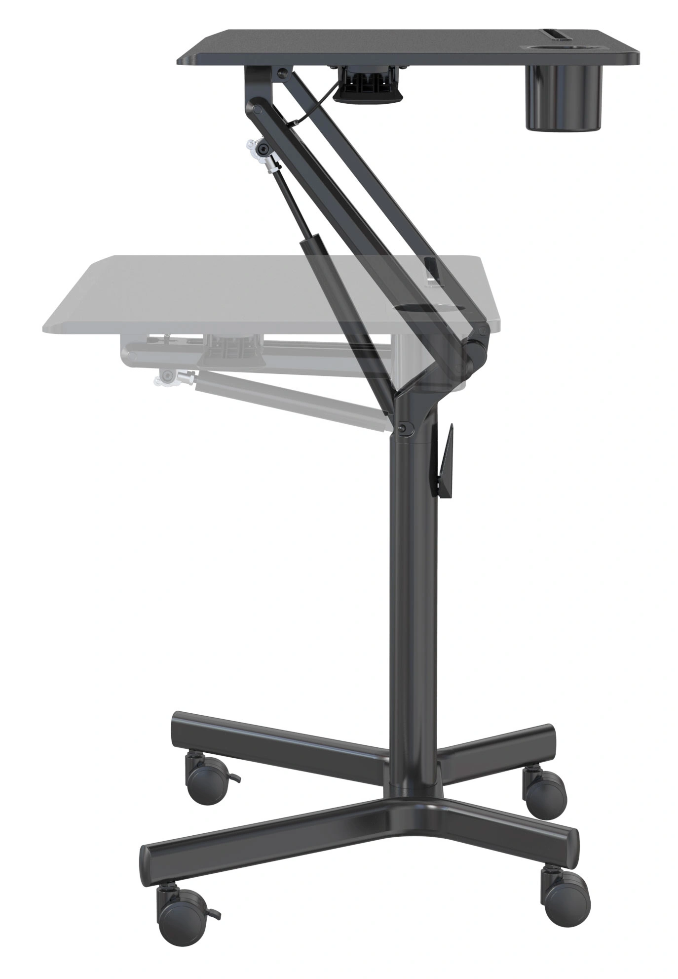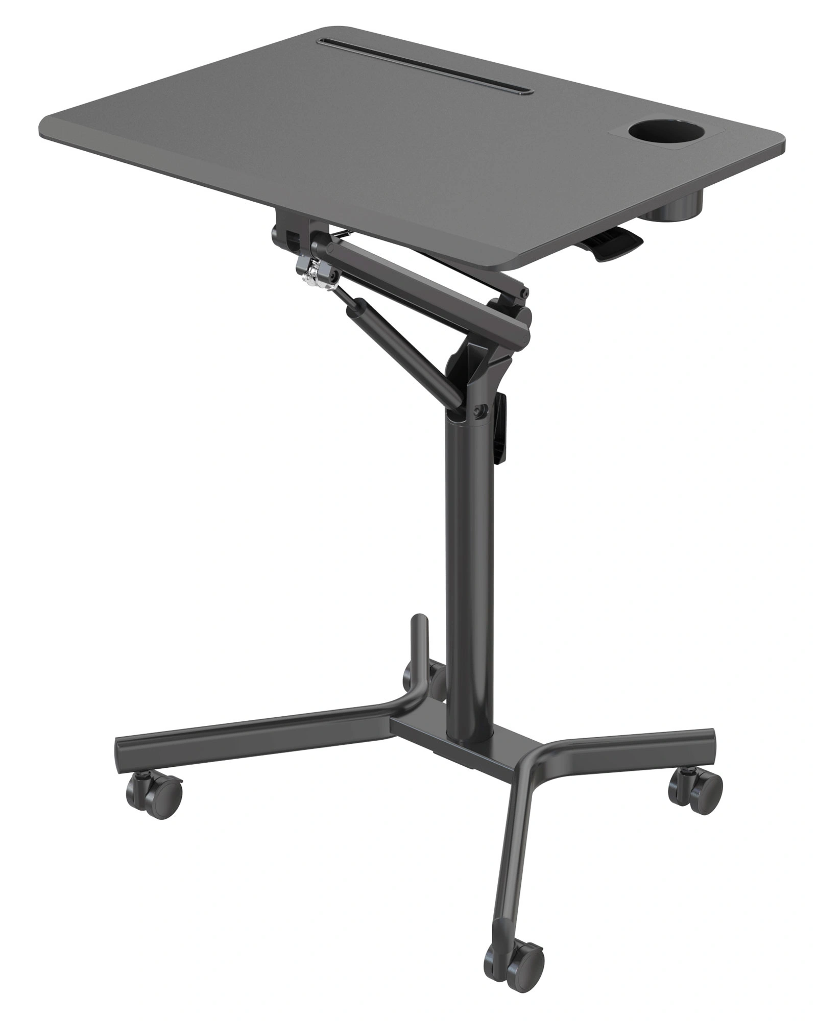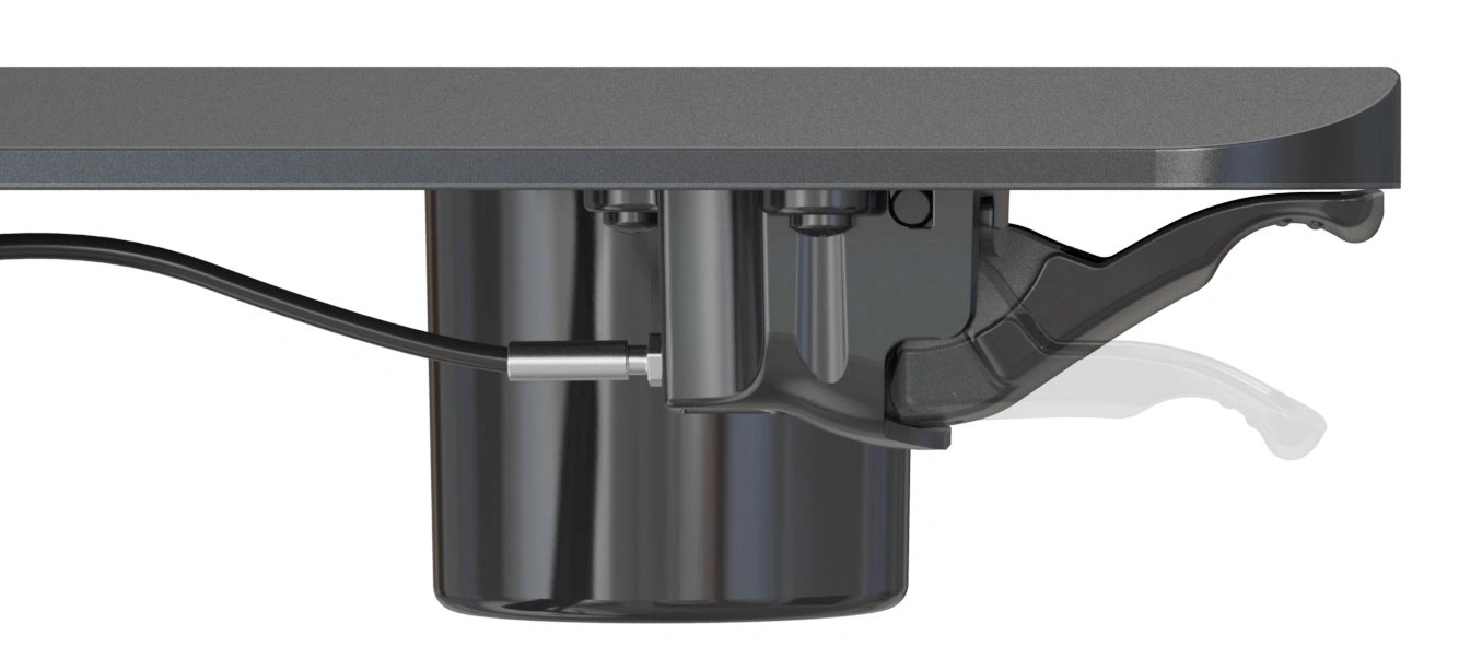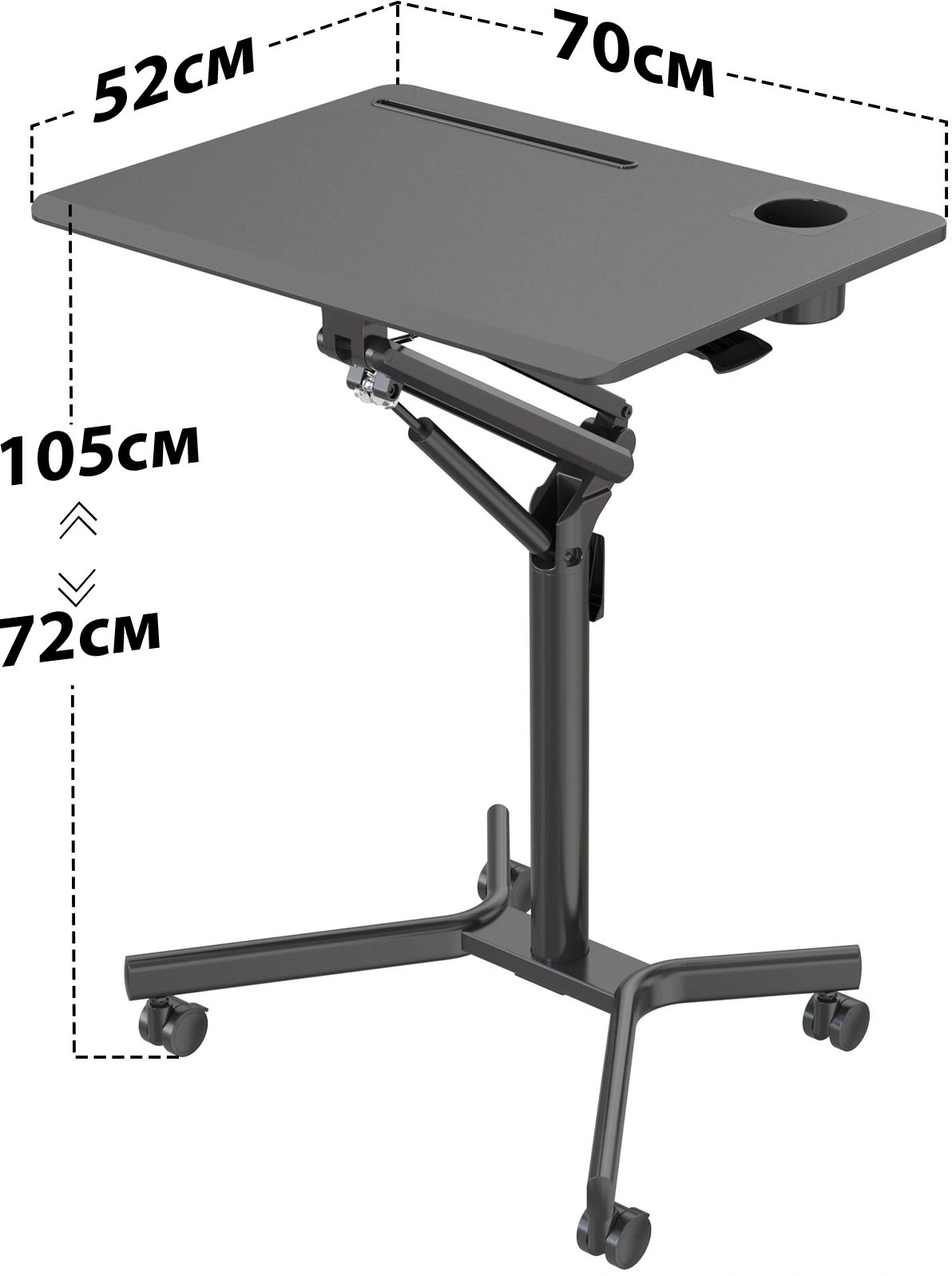 Подъемный механизм плавно опускает и поднимает столешницу, можно остановить в любом положении. Управление при помощи одного рычага. Наличие 4 колес обеспечивает маневренность, 2 колеса со стопором, для придания устойчивости.