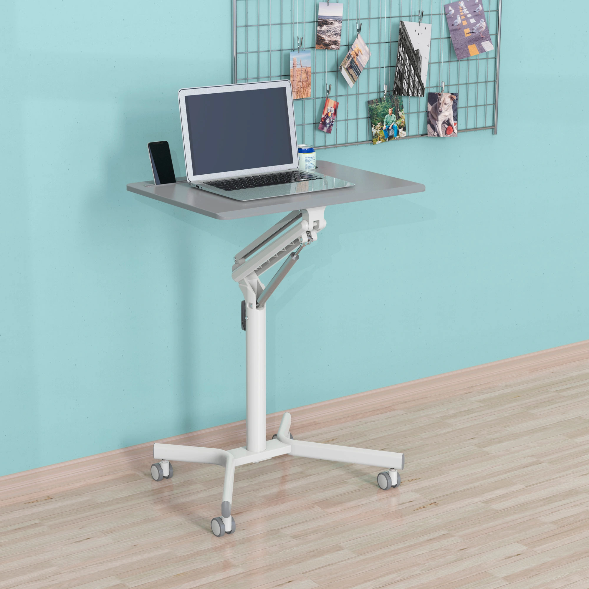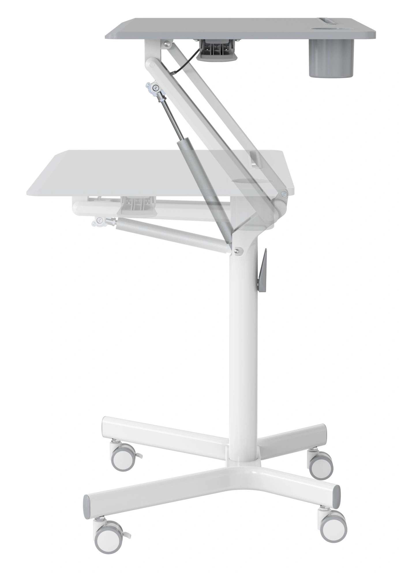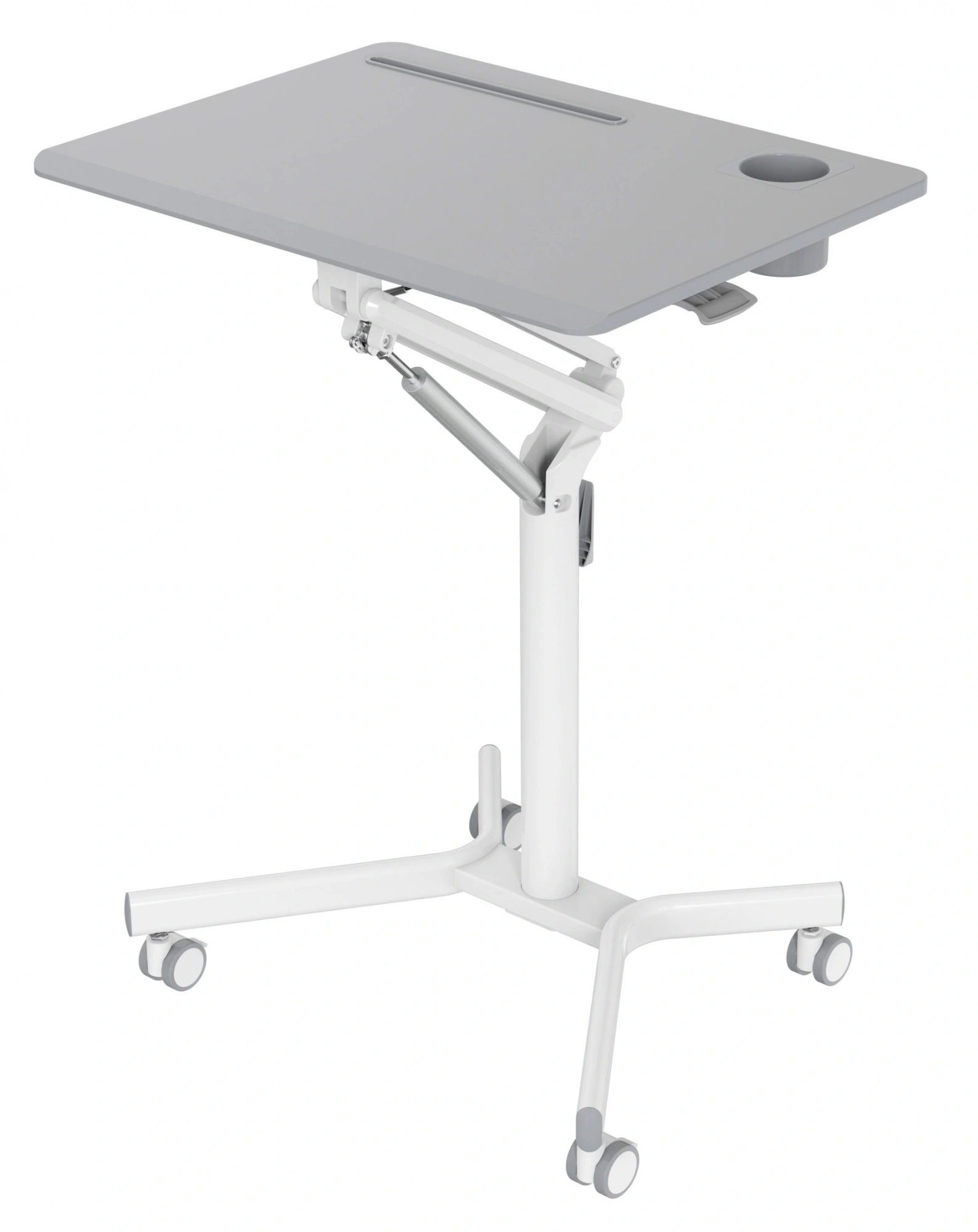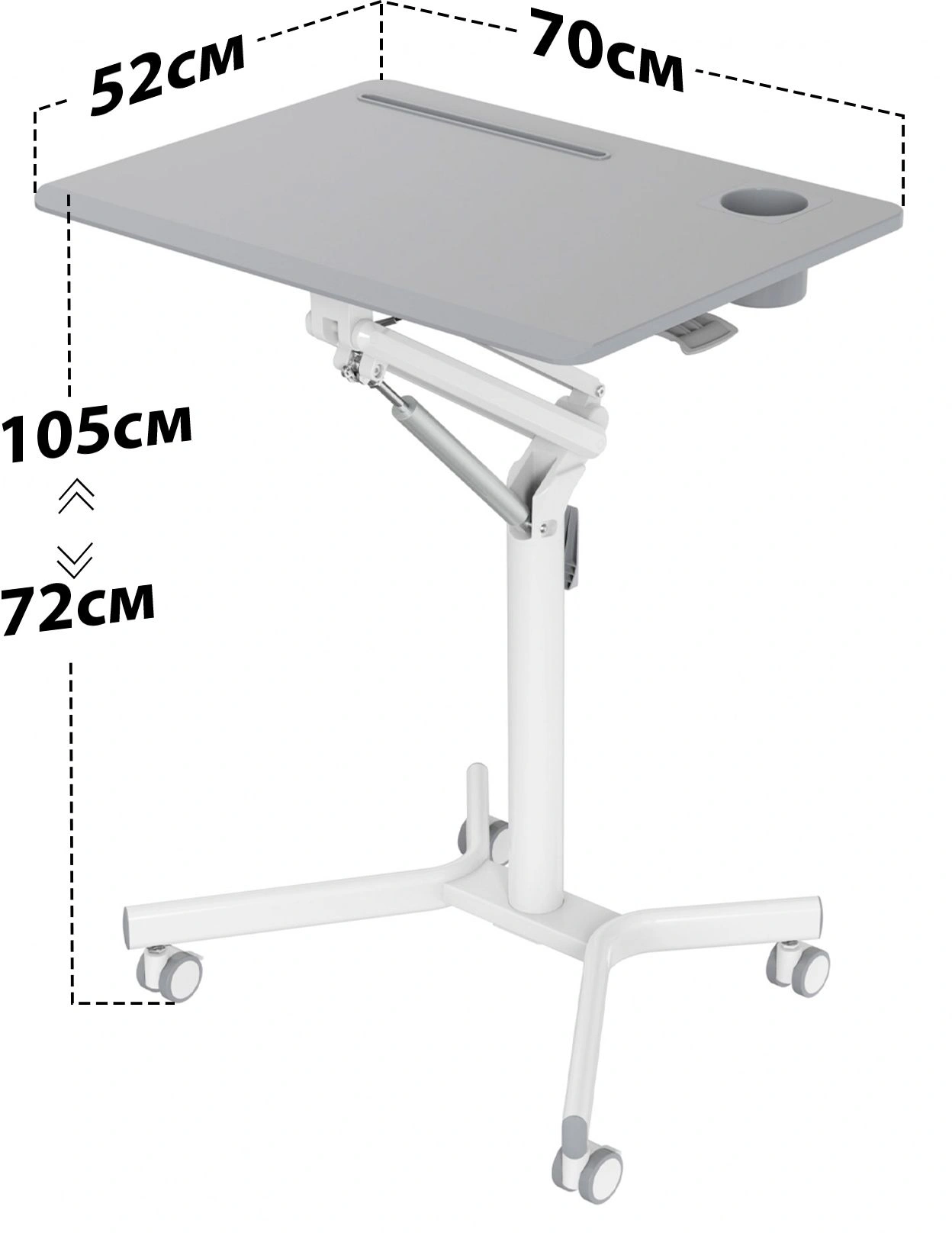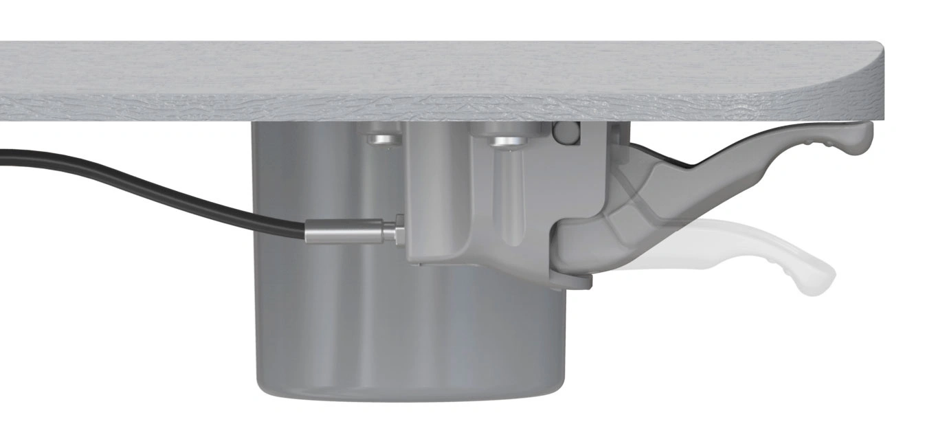Подъемный механизм плавно опускает и поднимает столешницу, можно остановить в любом положении. Управление при помощи одного рычага. Наличие 4 колес обеспечивает маневренность, 2 колеса со стопором, для придания устойчивости.