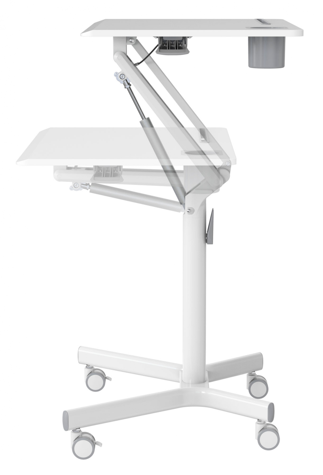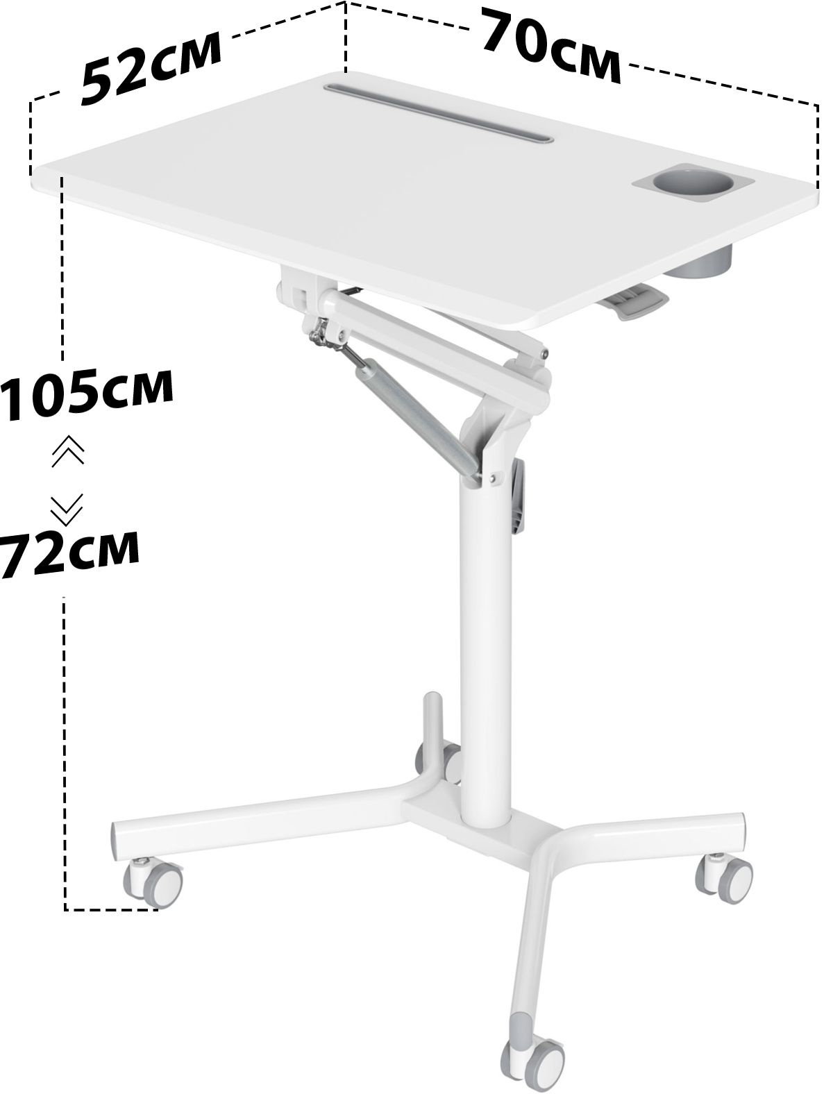 Подъемный механизм плавно опускает и поднимает столешницу, можно остановить в любом положении. Управление при помощи одного рычага. Наличие 4 колес обеспечивает маневренность, 2 колеса со стопором, для придания устойчивости.