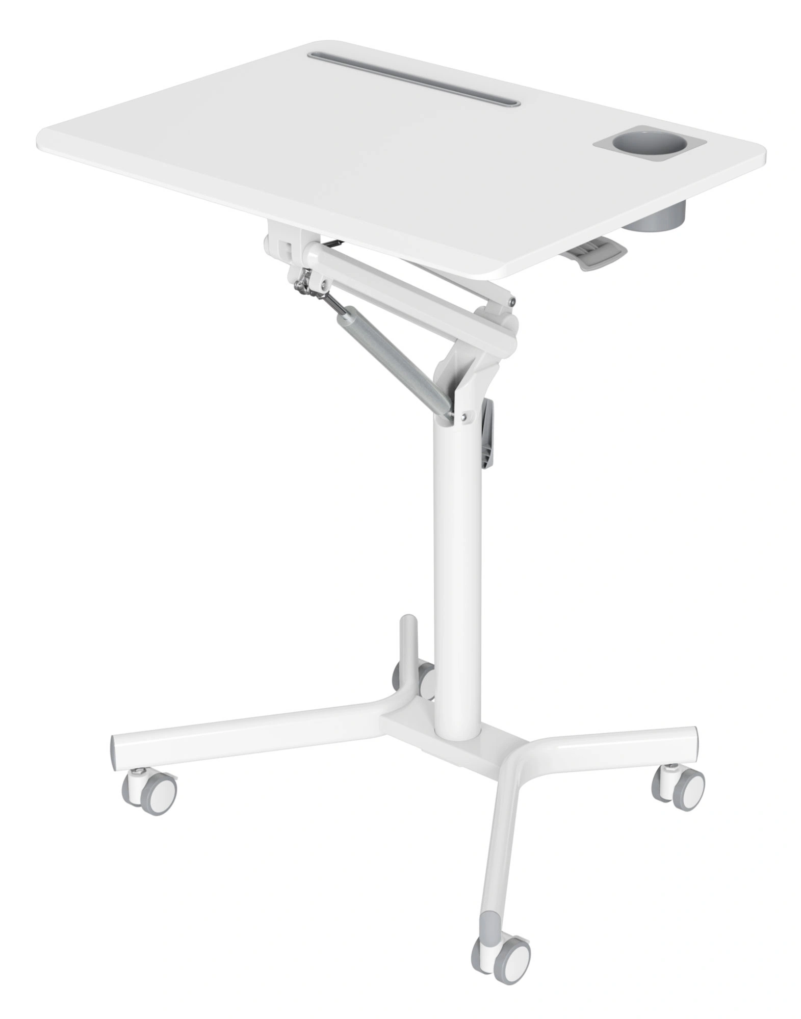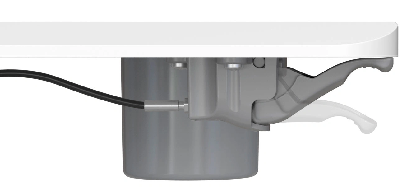 Подъемный механизм плавно опускает и поднимает столешницу, можно остановить в любом положении. Управление при помощи одного рычага. Наличие 4 колес обеспечивает маневренность, 2 колеса со стопором, для придания устойчивости.