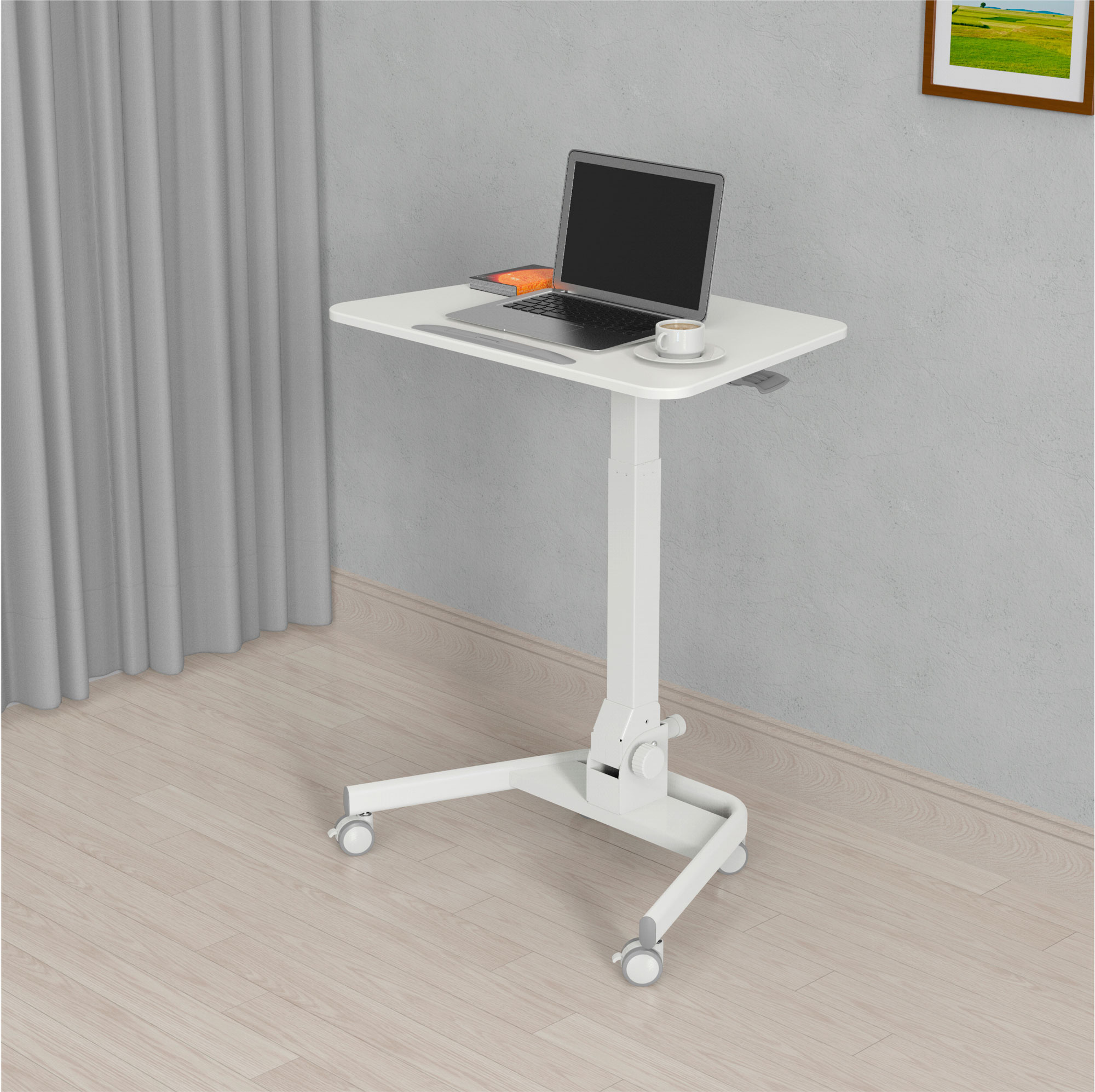 Простое управление: подъемный механизм плавно опускает и поднимает столешницу, можно остановить в любом положении. Наличие 4 колес обеспечивает маневренность, 2 колеса со стопором, для придания устойчивости. Полностью складной стол, удобное хранение и транспортировка.
