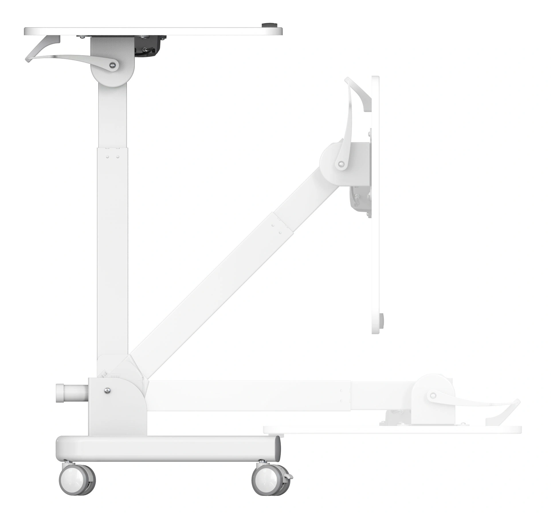 Простое управление: подъемный механизм плавно опускает и поднимает столешницу, можно остановить в любом положении. Наличие 4 колес обеспечивает маневренность, 2 колеса со стопором, для придания устойчивости. Полностью складной стол, удобное хранение и транспортировка.