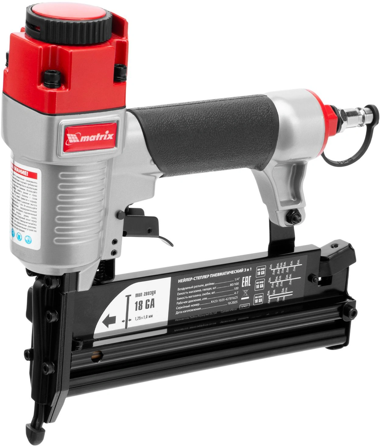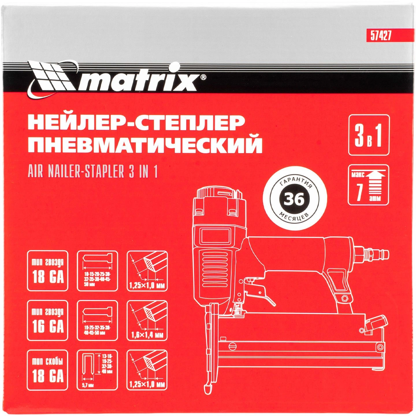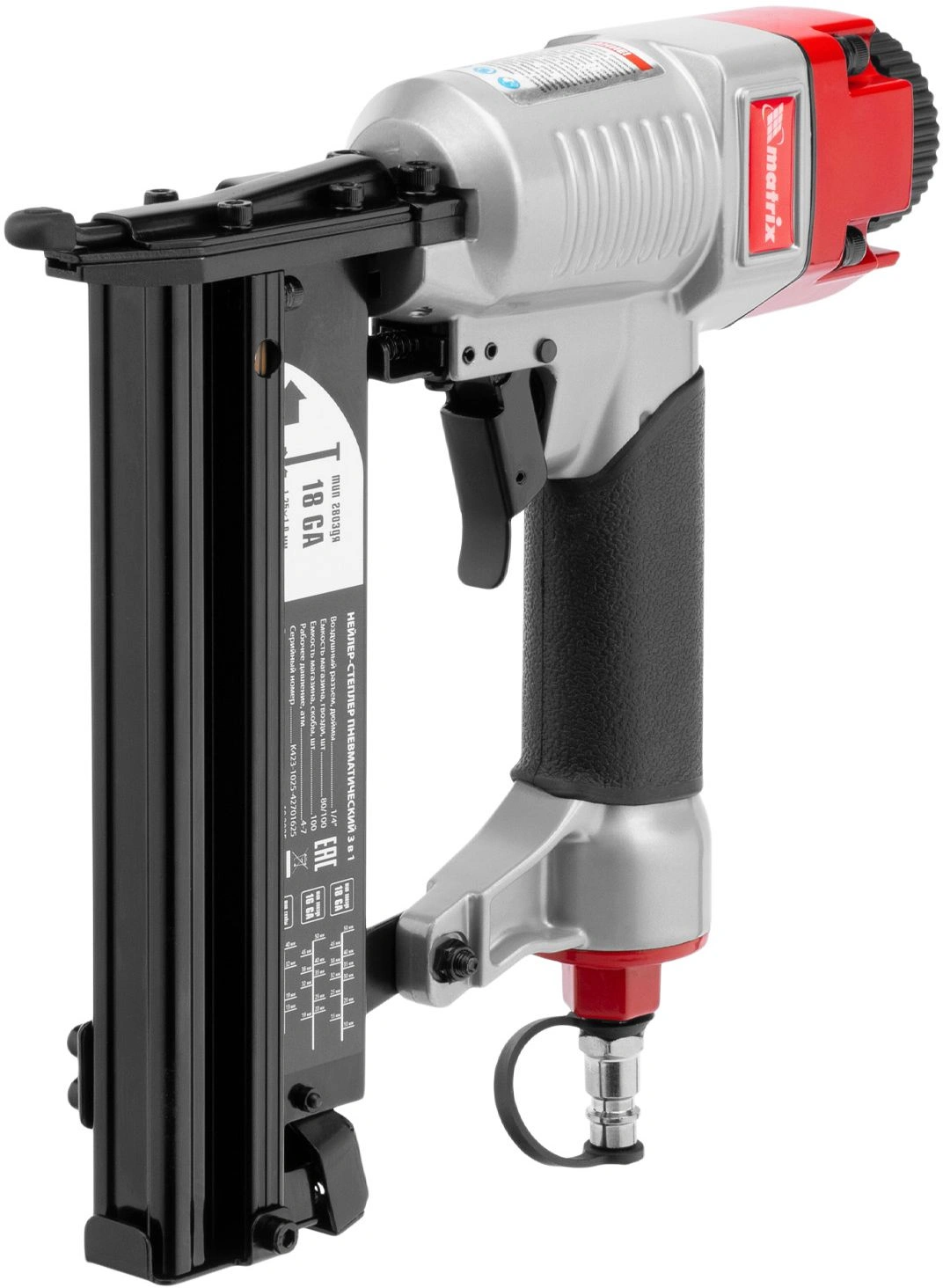 Универсальный пневматический нейлер-степлер Matrix 3 в 1 способен забивать скобы 13-40 мм. 18 GA и гвозди 10-50 мм.18GA и 16GA. Используется для паркетной доски, фанеры, ДВП, шифера, гипсокартона, ткани и бумаги. Также он пригодится при сборке мебели, ремонте и отделке.