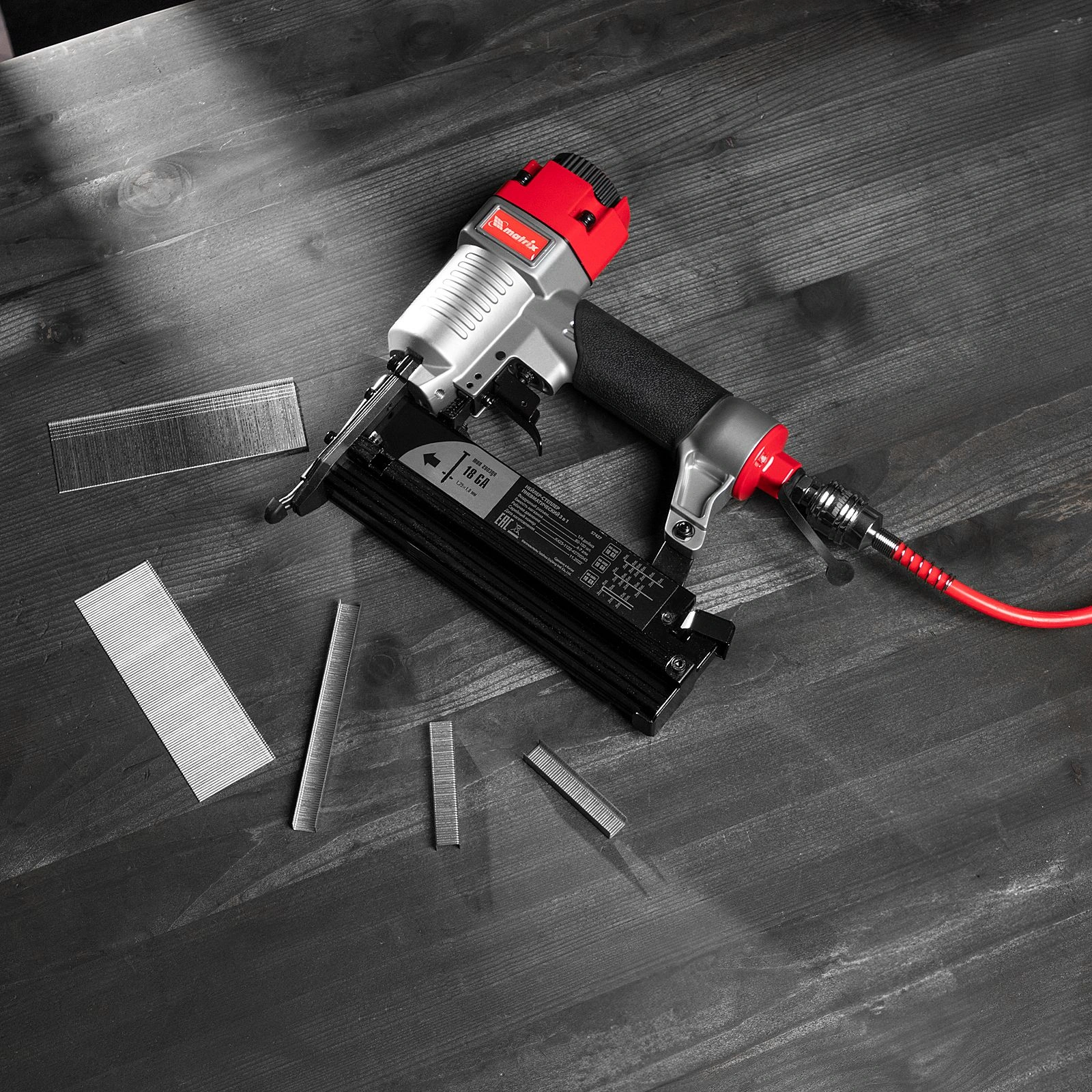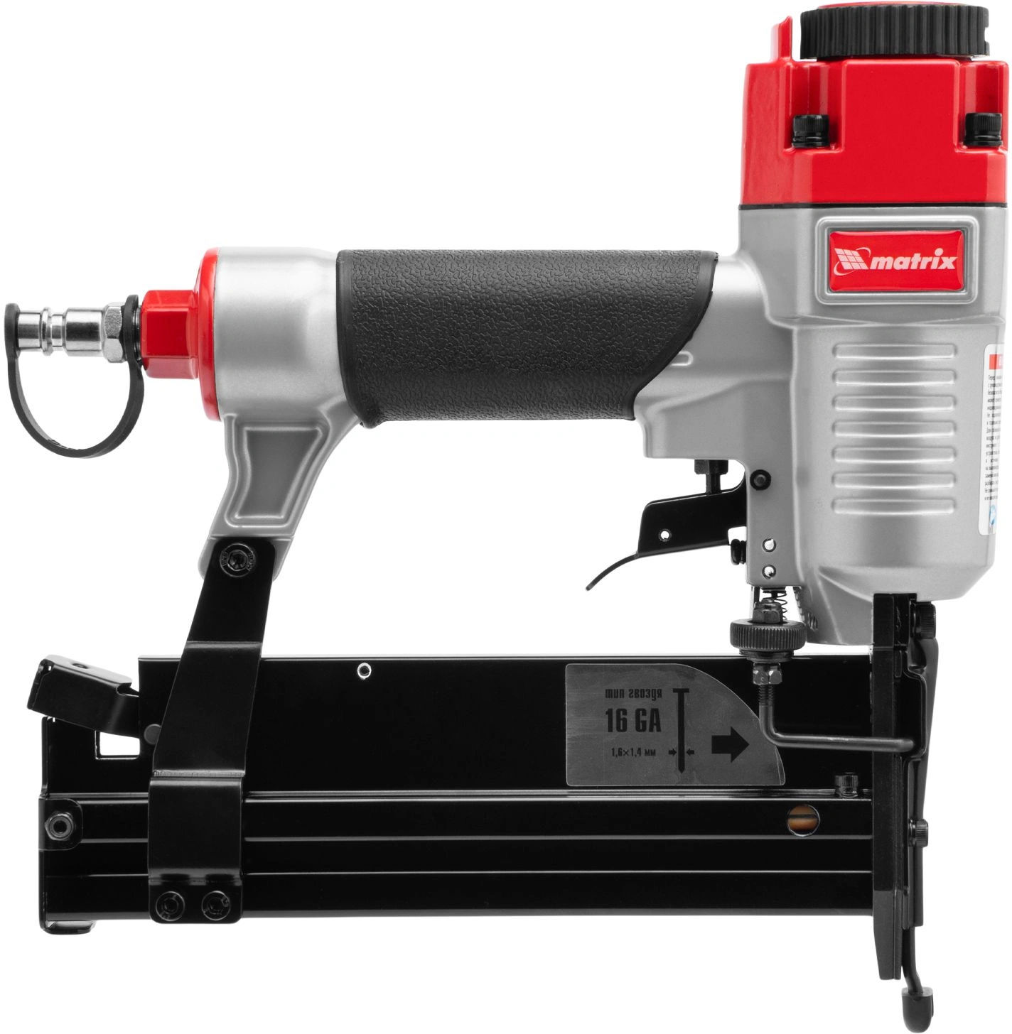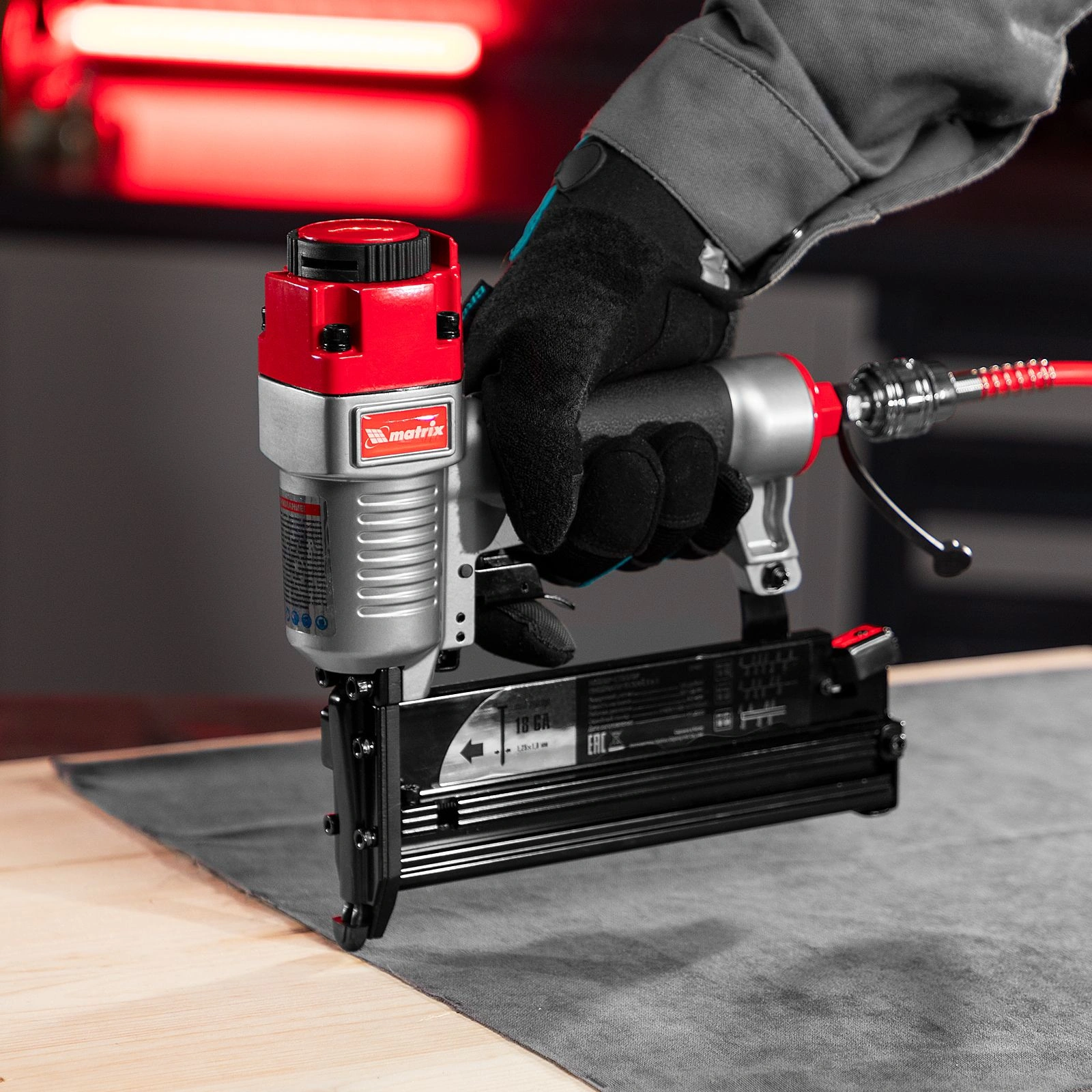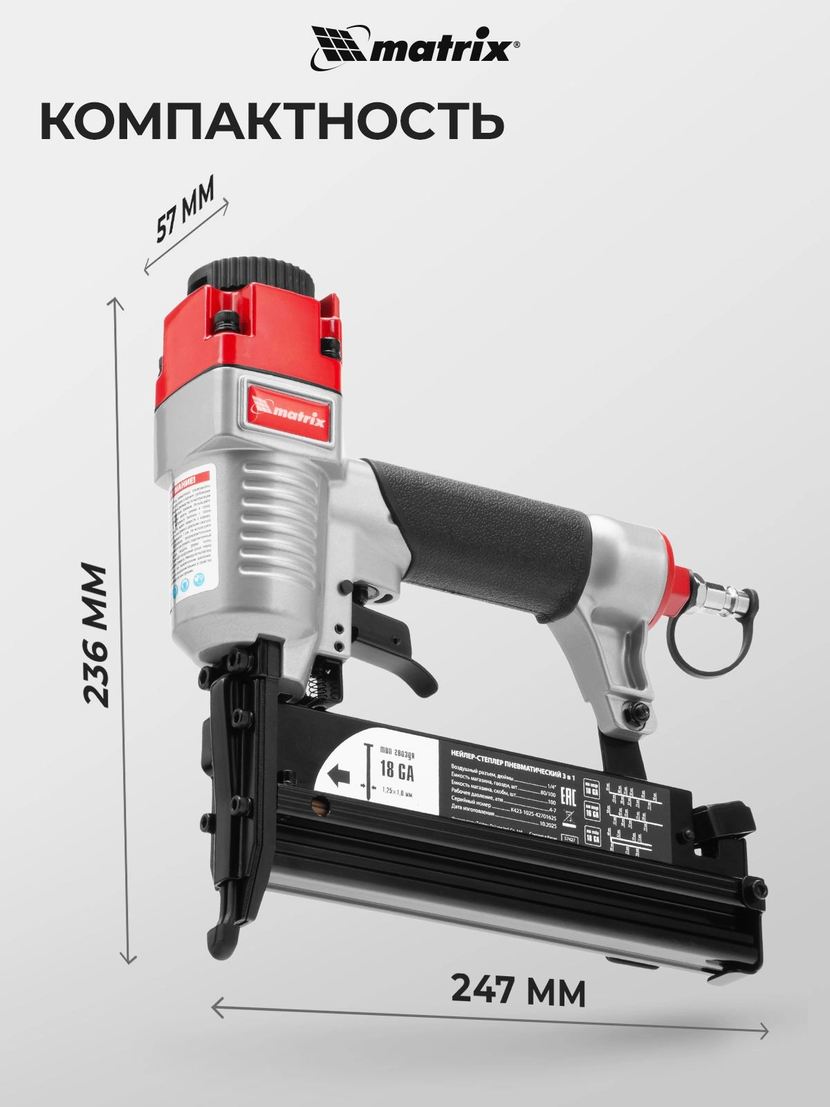 Универсальный пневматический нейлер-степлер Matrix 3 в 1 способен забивать скобы 13-40 мм. 18 GA и гвозди 10-50 мм.18GA и 16GA. Используется для паркетной доски, фанеры, ДВП, шифера, гипсокартона, ткани и бумаги. Также он пригодится при сборке мебели, ремонте и отделке.
