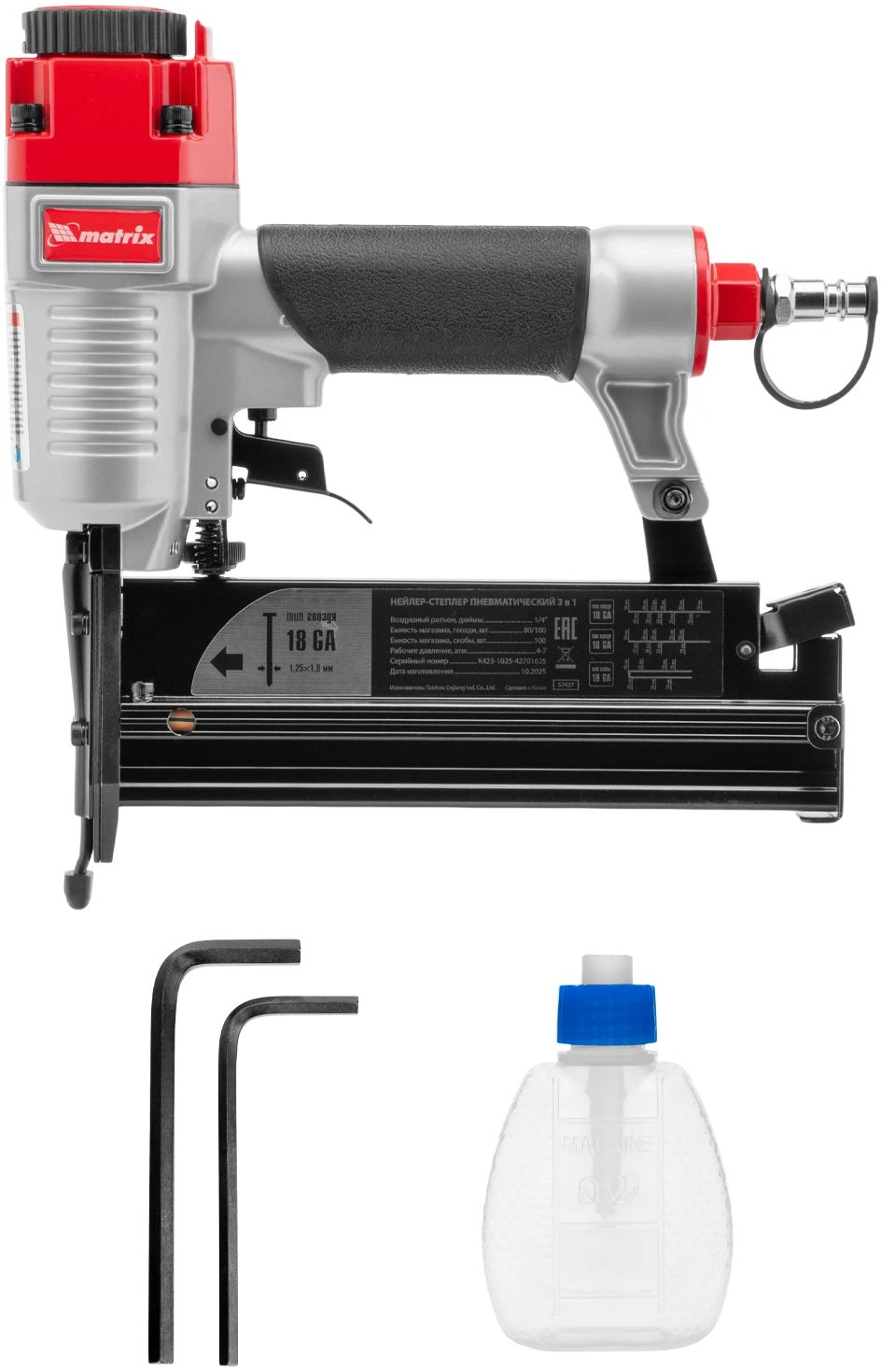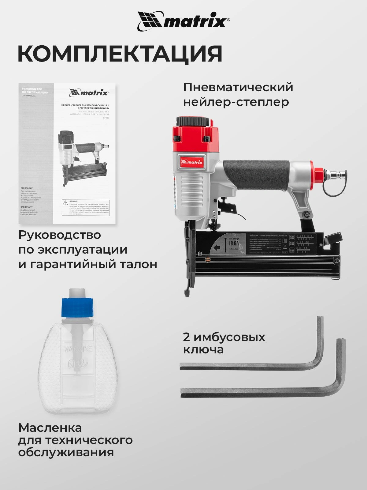 Нейлер-степлер, ключ имбусовый - 2 шт., масленка, руководство по эксплуатации, гарантийный талон.
