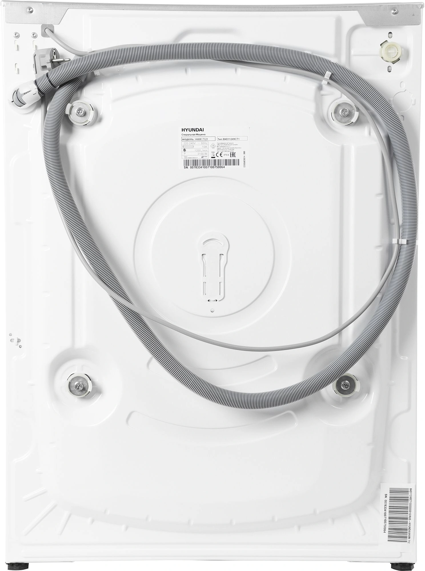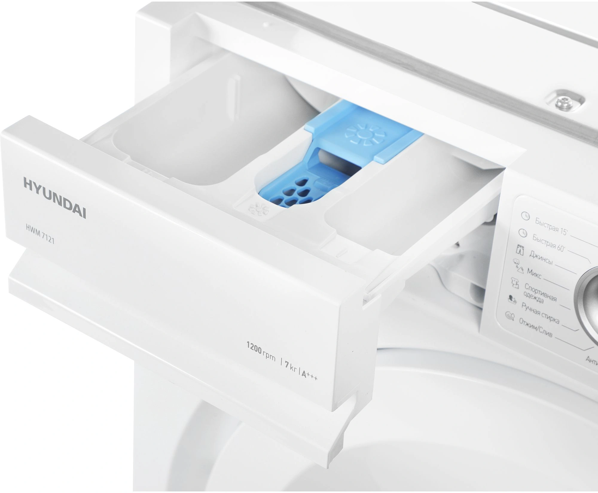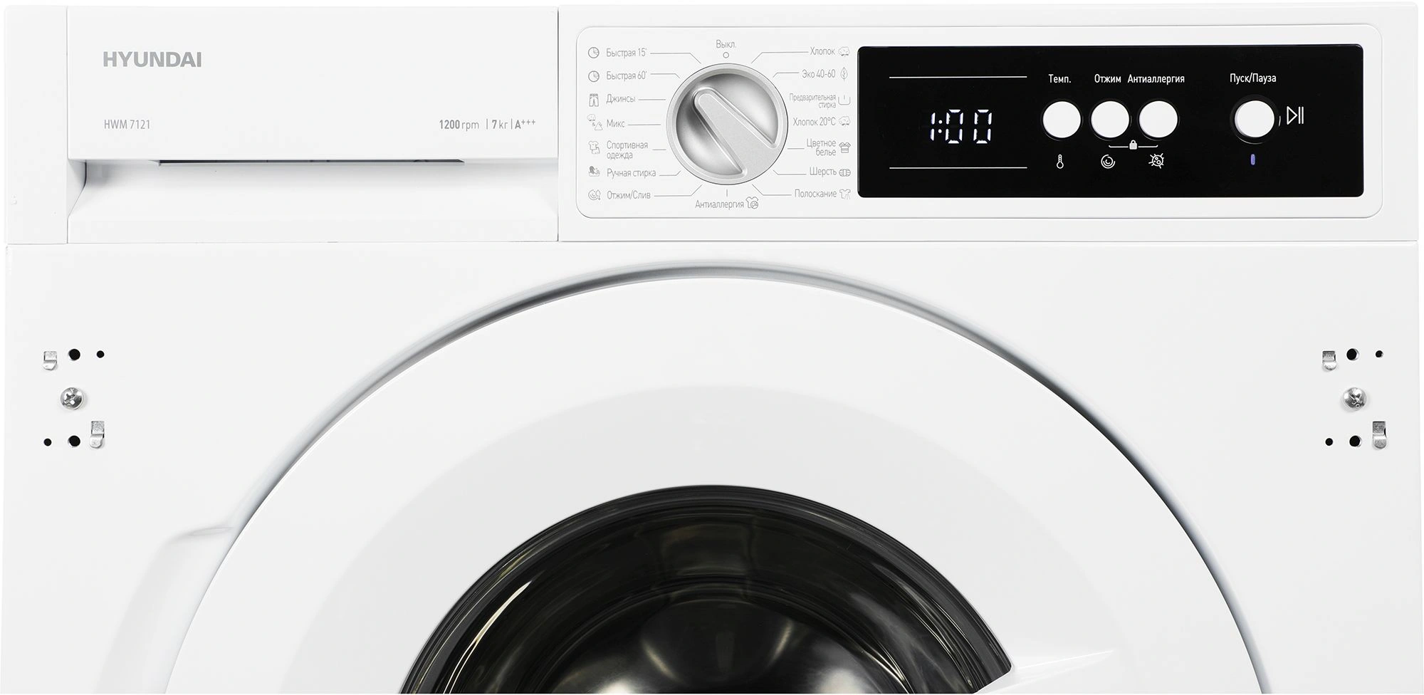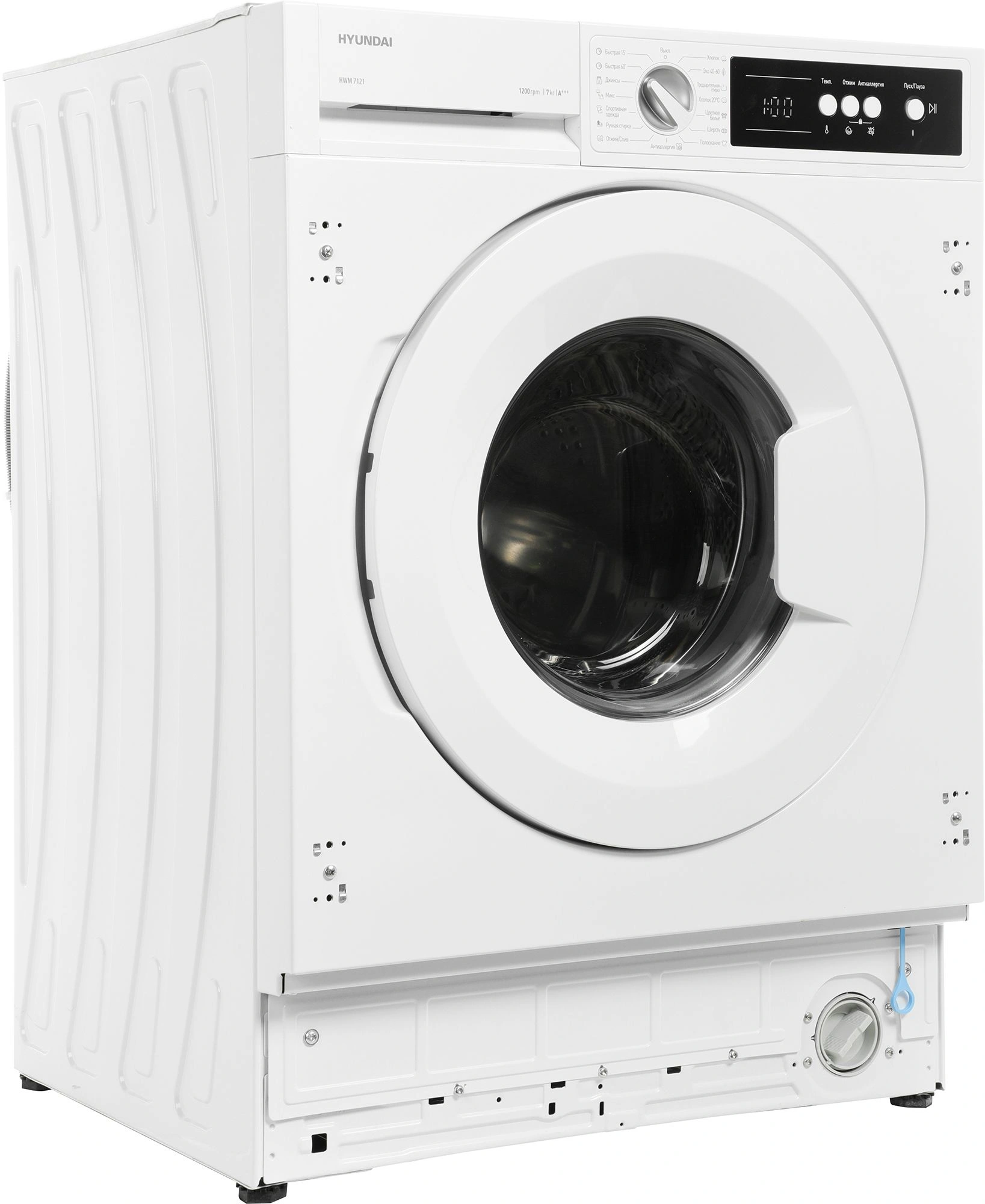 Стиральная машина Hyundai HWM 7121 встраивается в мебельный гарнитур. С помощью отверстий на корпусе к устройству можно прикрепить петли для навешивания фасада. Нижняя часть машины закрывается мебельным цоколем, верхняя – столешницей. Благодаря этому модель легко впишется в интерьер кухни или ванной.