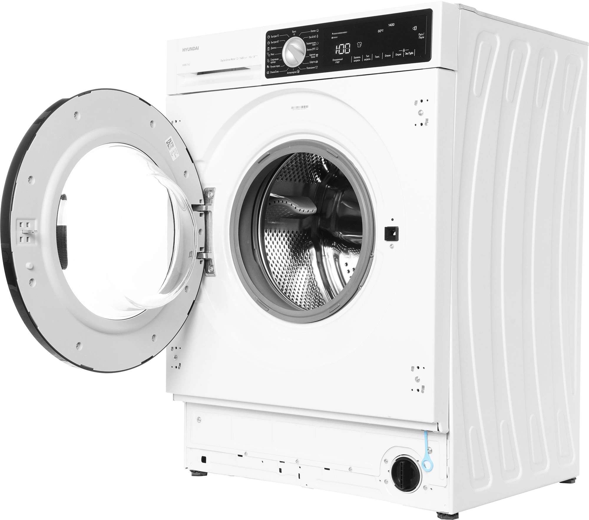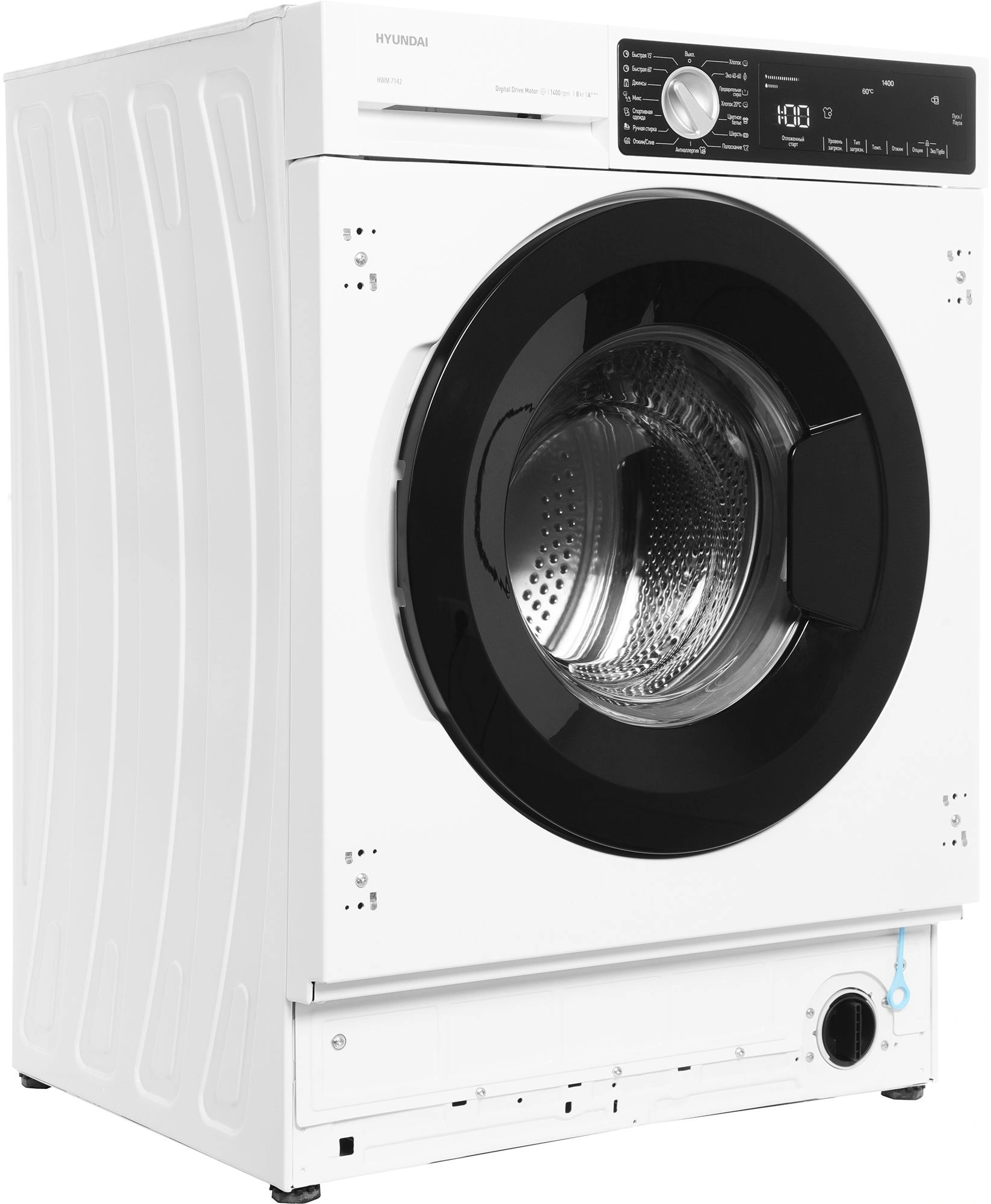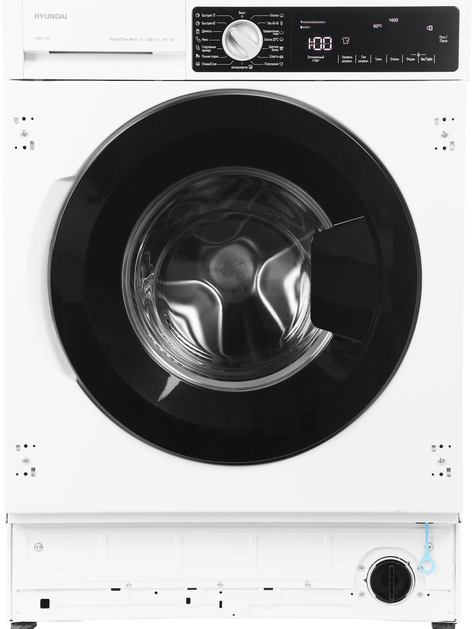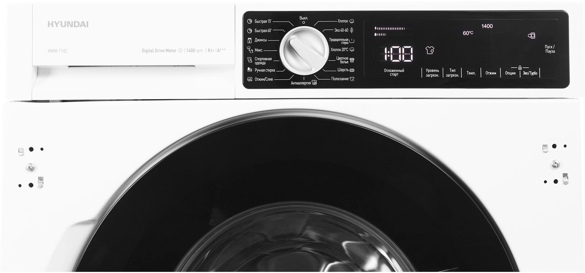 Стиральная машина Hyundai HWM 7142 встраивается в мебельный гарнитур. С помощью отверстий на корпусе к устройству можно прикрепить петли для навешивания фасада. Нижняя часть машины закрывается мебельным цоколем, верхняя – столешницей. Благодаря этому устройство впишется в интерьер кухни или ванной.