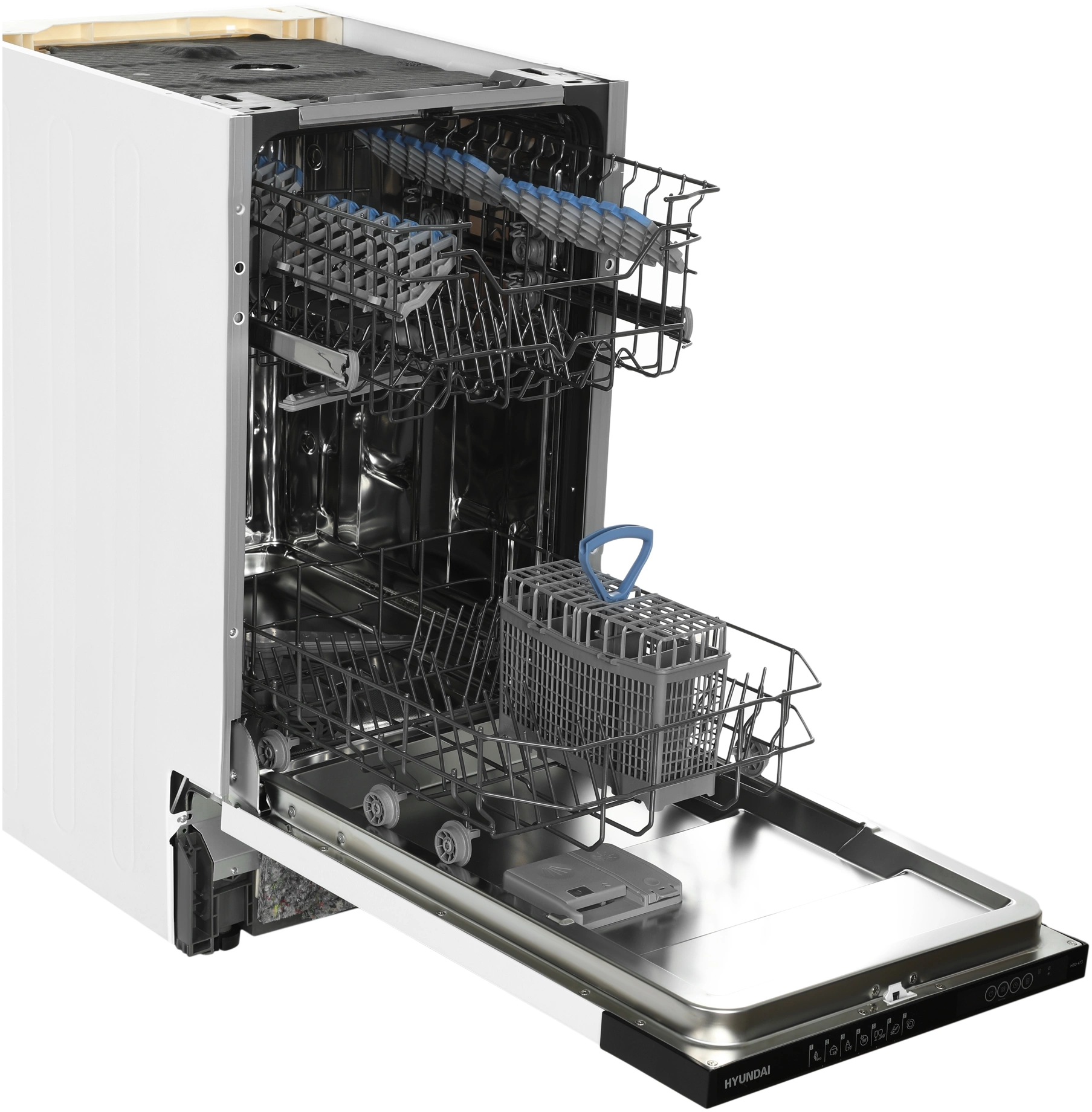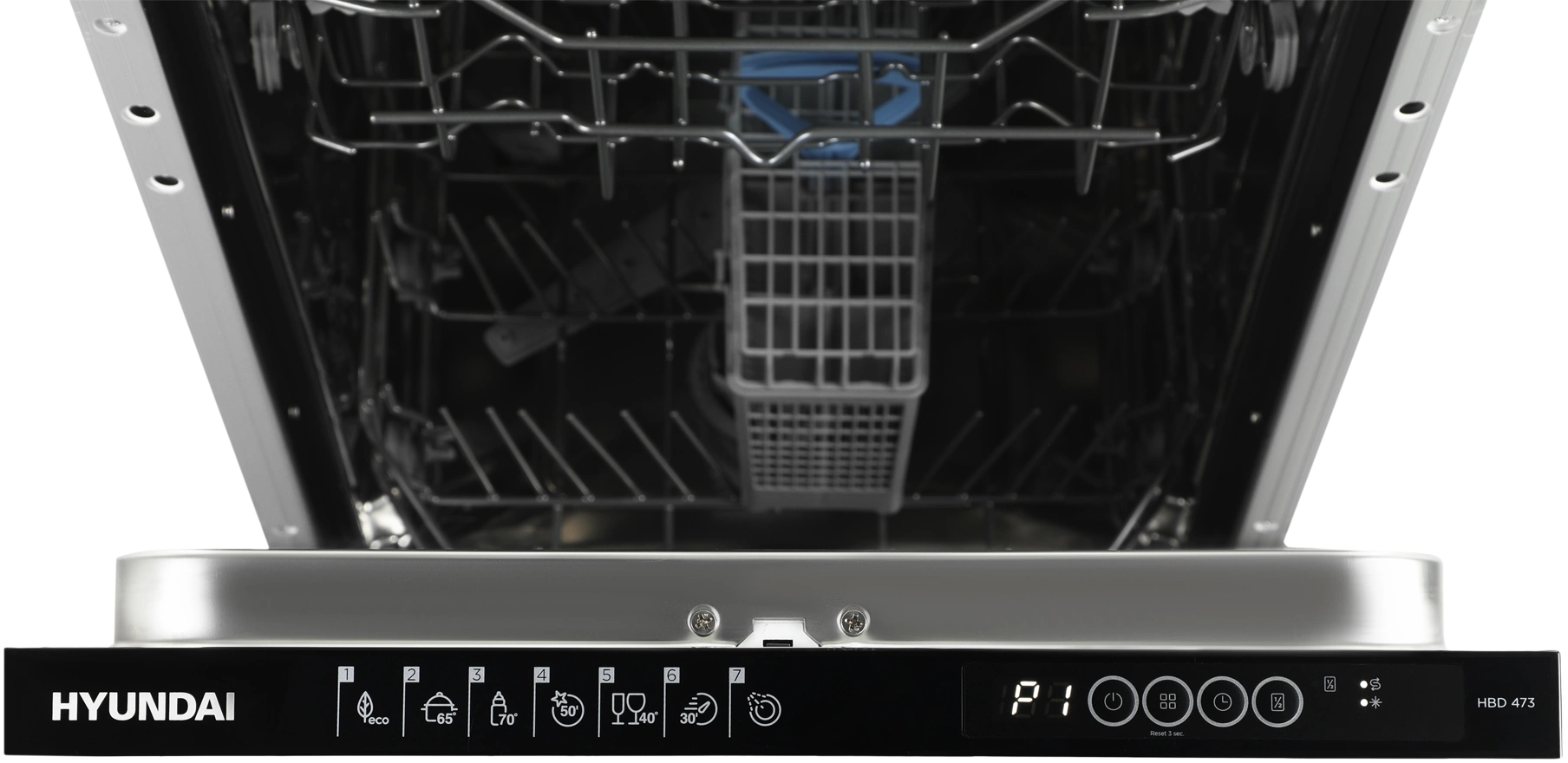 В 2 корзины (с регулировкой высоты), установленные в Hyundai HBD 473, помещается до 10 комплектов посуды, однако для помывки наполовину заполненного объёма есть соответствующая программа. Для повышения эффективности мытья в устройстве можно использовать средства «3 в 1» - этот аспект заложен в его характеристики. Также внутри Hyundai HBD 473 есть индикаторы, показывающие наличие ополаскивателя и соли. Режим работы девайса настраивается посредством специальной панели, установленной в нём.