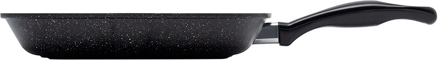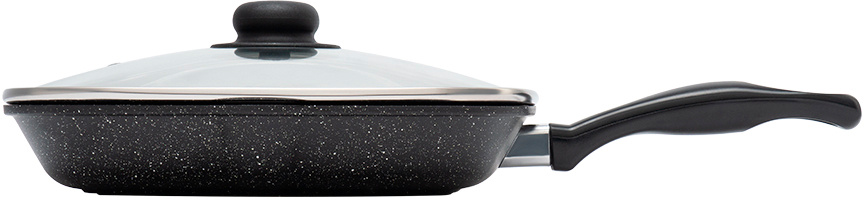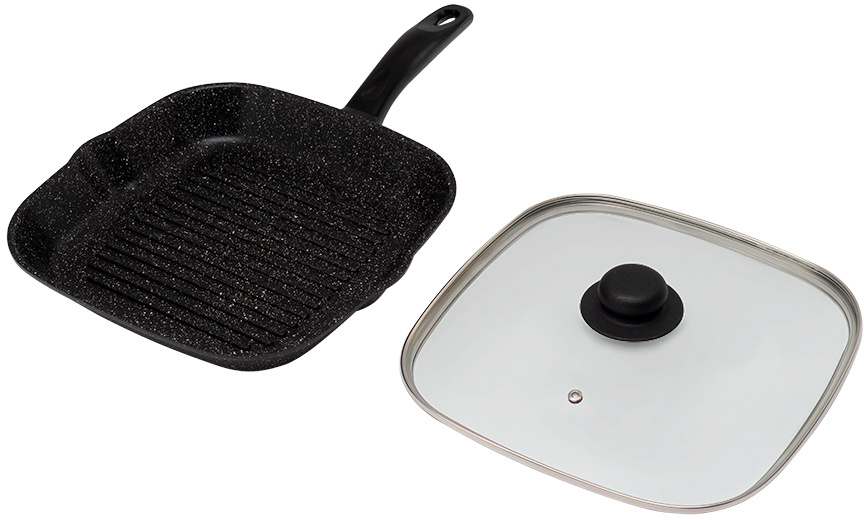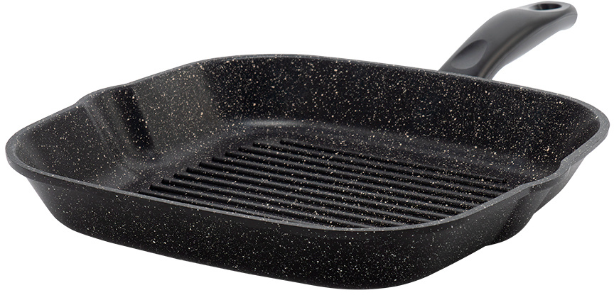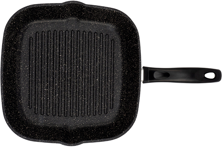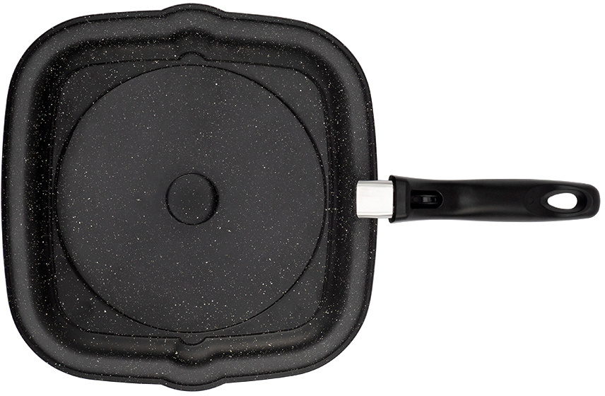 Квадратная форма корпуса, выполненного из лёгкого и устойчивого к деформации литого алюминия, имеет габариты 27х27 см. Высокие бортики и ребристое покрытие из инновационного двухслойного антипригарного материала Pfulon делает жарку на данной сковороде приятным и простым занятиям без разбрызгивания масла по всей плите. Также он устойчив к деформации, появлению царапин и не портится от хранения в холодильнике. Стейки из мяса, рыбы, птицы и овощи, приготовленные на данной сковороде, будут ароматными и вкусными. Эстетичные полоски, остающиеся после термообработки в ней, делают внешний вид пищи очень аппетитным. А лишний жир благодаря удачной конфигурации дна не попадет в тарелку и не испортит блюда.