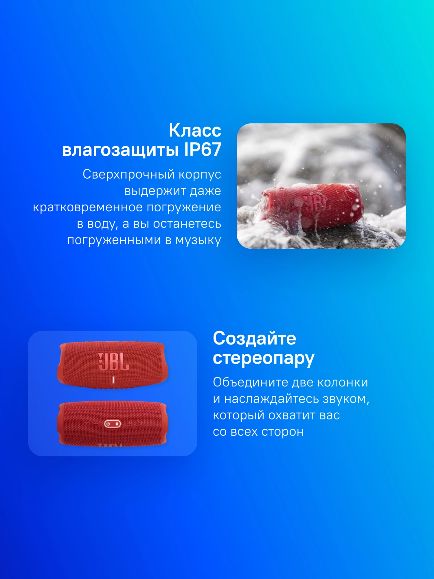 Колонка JBL Charge 5 — это легендарный звук JBL с оптимизированным динамиком с длинным ходом, отдельным высокочастотным динамиком и двумя фирменными пассивными излучателями JBL. До 20 часов работы и удобная зарядка внешних устройств, чтобы веселиться всю ночь. Защита от воды и пыли класса IP67.