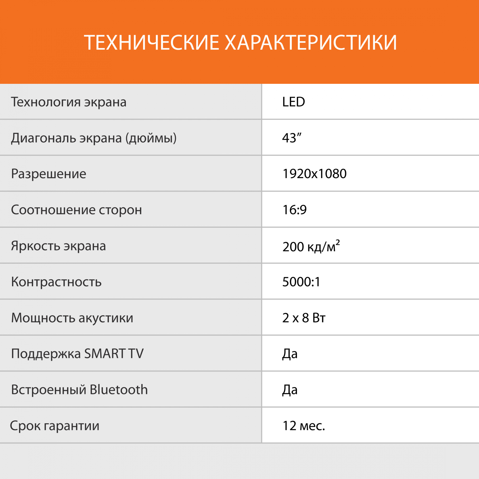 Данная модель выдает сбалансированную и насыщенную картинку. Диагональ дисплея составляет 43 дюйма (109 см) с частотой обновления 60 Гц и разрешением 1920х1080 пикселей. Такое соотношение характеристик позволяет прибору воспроизводить контент в формате 1080p (FULL HD). А широкие углы обзора – 178 градусов по вертикали и горизонтали – дополняют эффект погружения в происходящее.